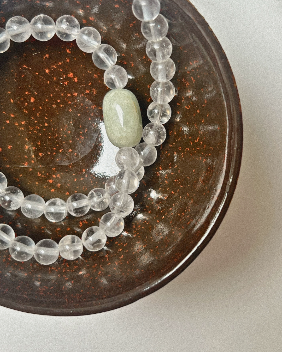 Clear quartz is known for its amplifying and cleansing properties, often used to support focus and intention. Beryl carries a soothing, balancing energy, thought to encourage emotional clarity and ease. A light, quietly reflective piece.