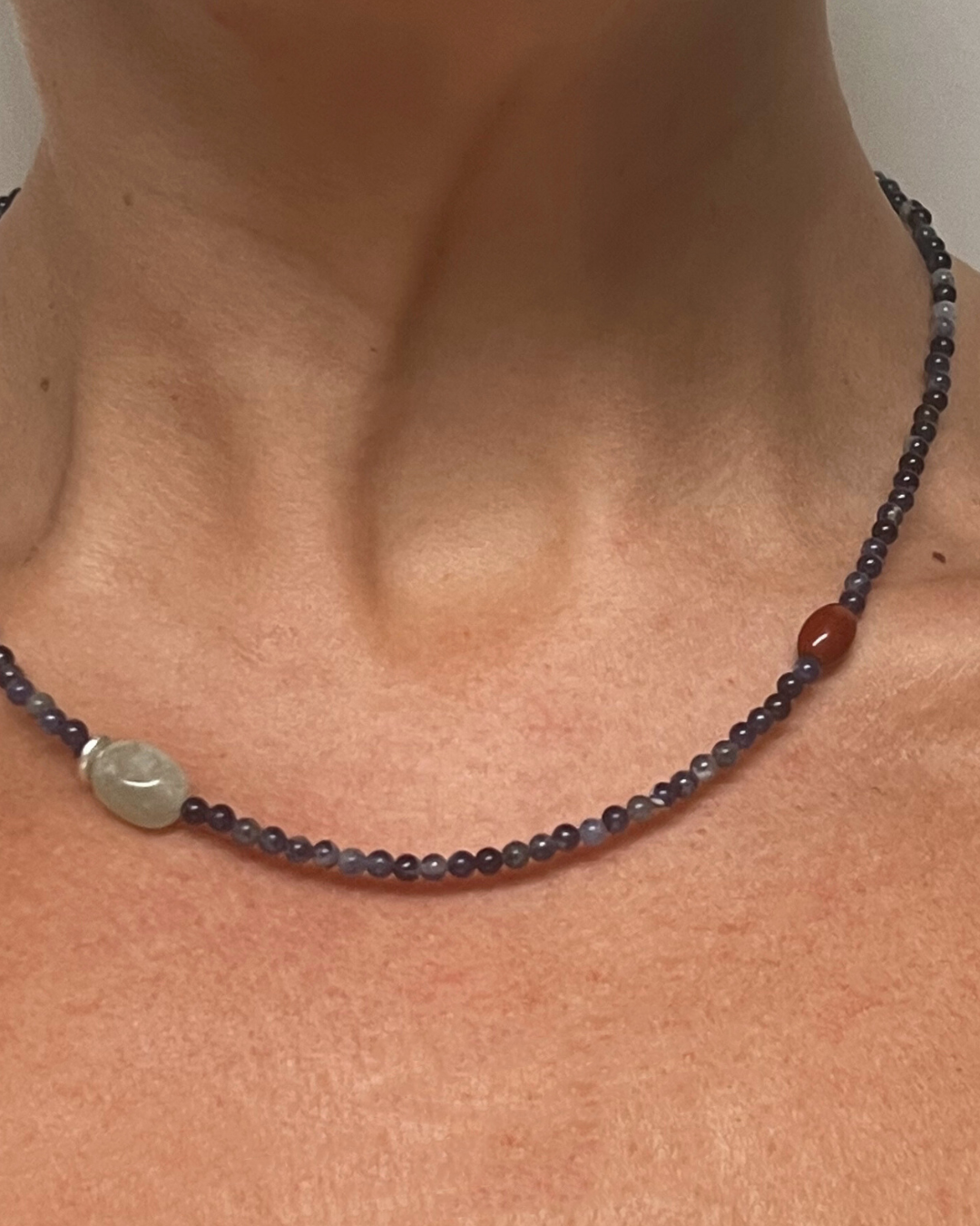 Sodalite is thought to support clarity and calm communication, encouraging intuition and emotional balance. Bowenite offers gentle protection and healing, red jasper brings strength and stability, and the silver stud adds a soft, reflective detail.