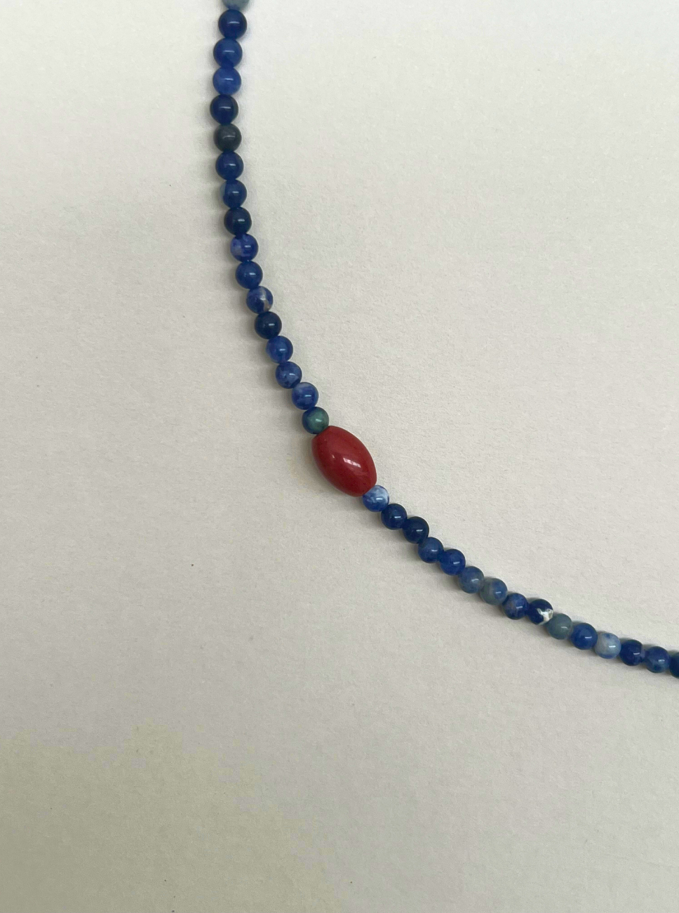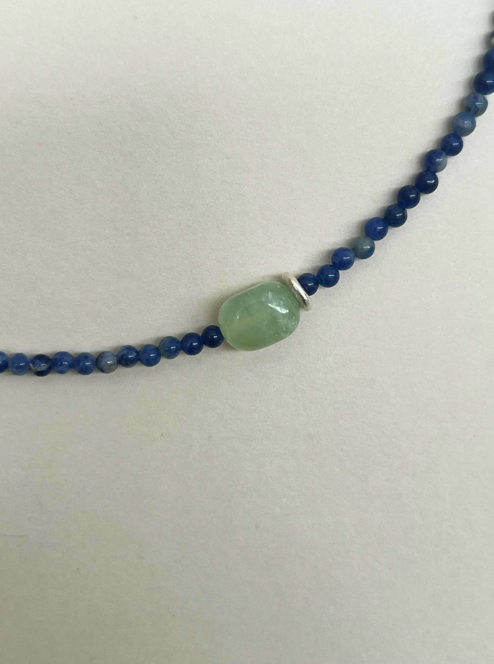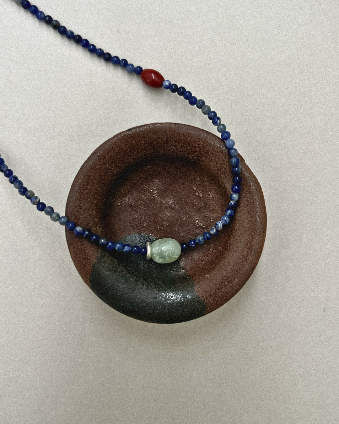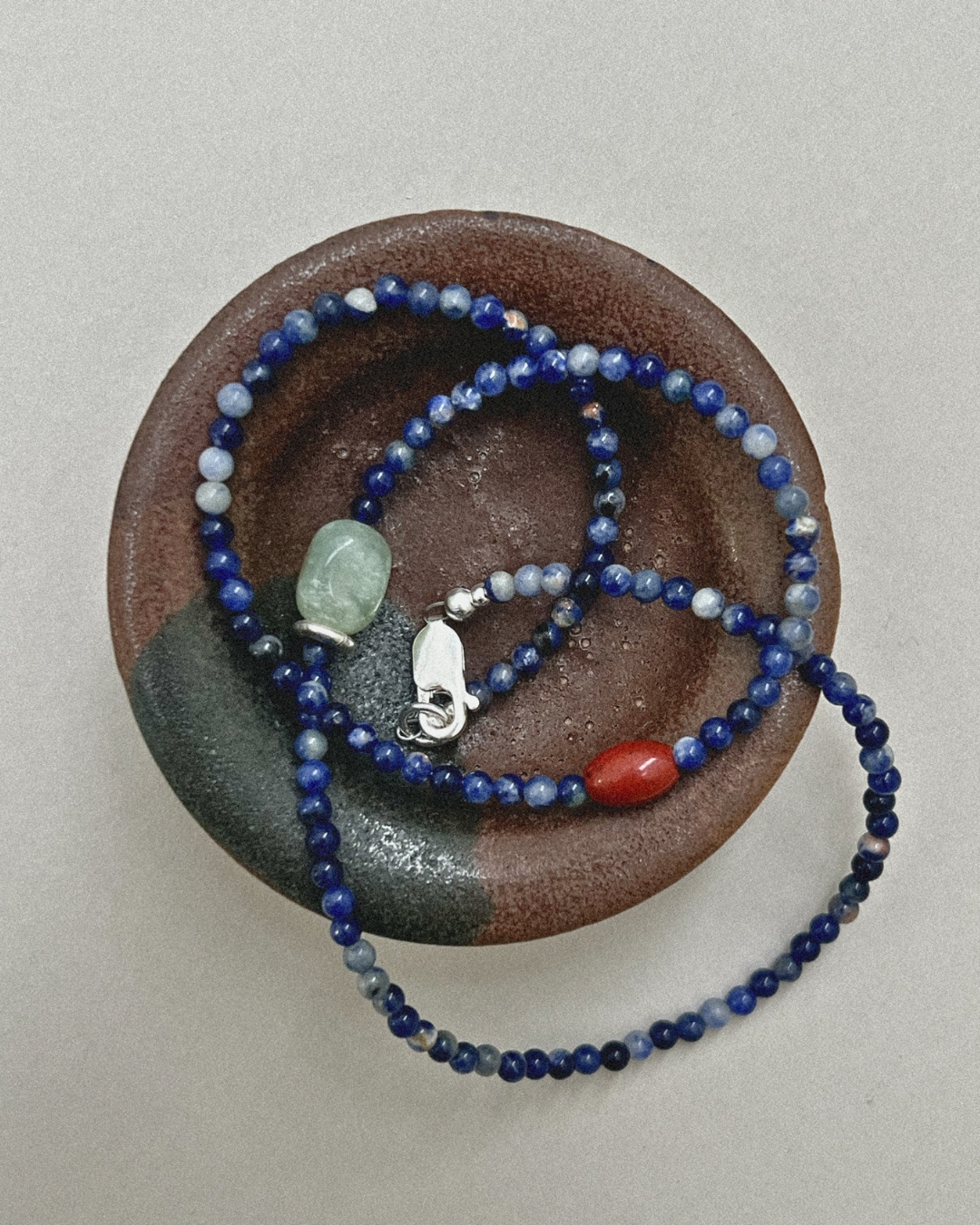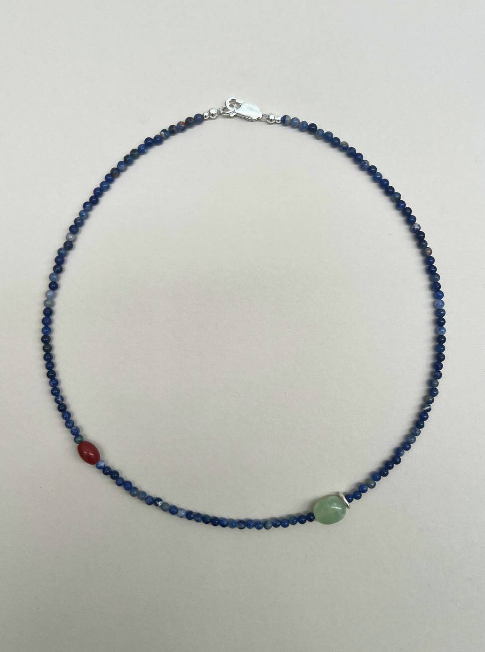 A limited, handmade necklace featuring petite sodalite beads in deep blue with natural variations, hand-strung with sterling silver findings and clasp. Set off-centre is a smooth bowenite pebble, a fine silver stud bead, and a single red jasper seed bead – a quiet arrangement of grounding tones and subtle contrast.