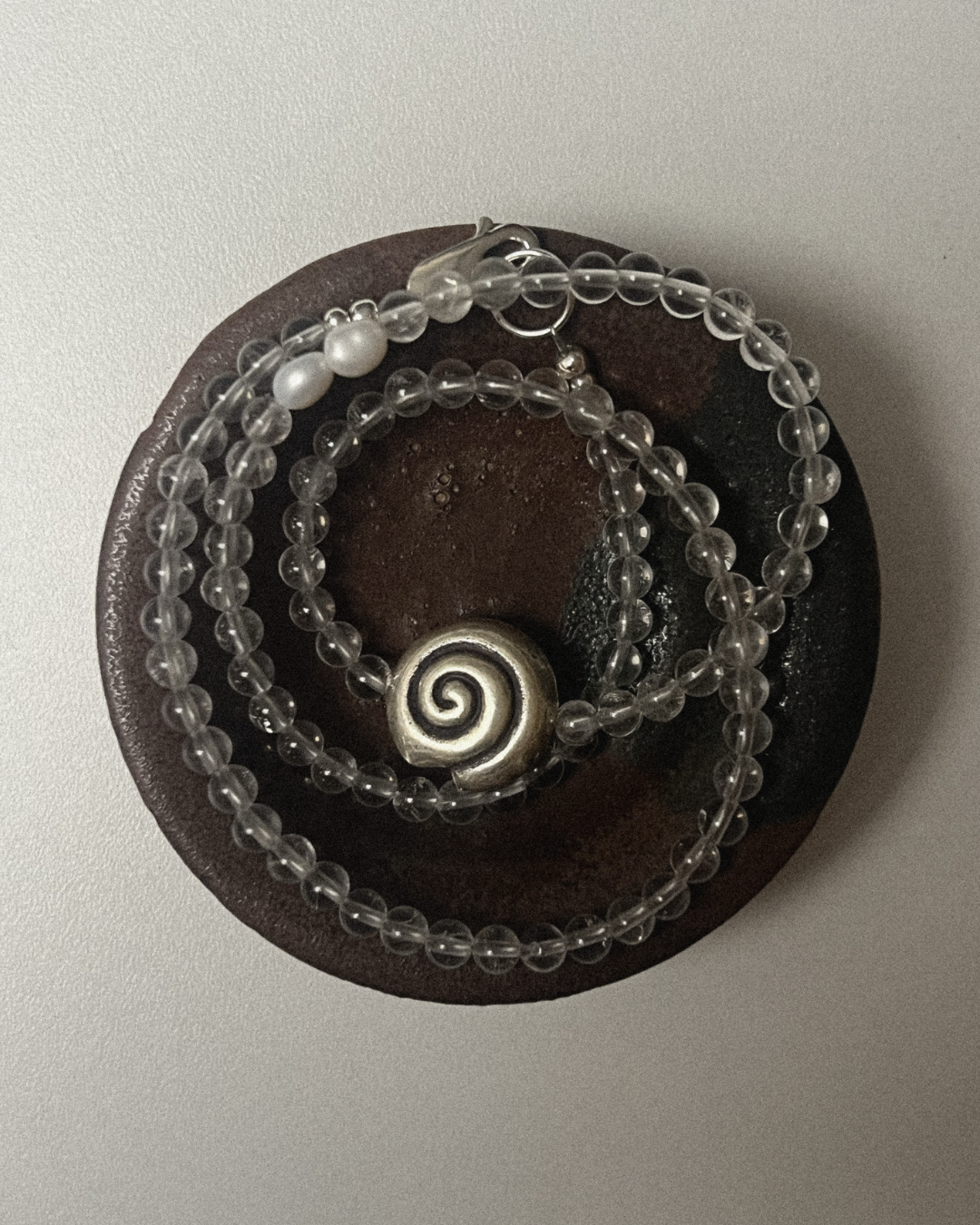 Clear quartz is linked to clarity, focus, and energetic amplification. Pearl brings softness and reflection, offering balance and calm. The silver spiral adds a symbolic note of rhythm and flow. Together, they create a piece that feels light yet grounded - radiant, fluid, and quietly balanced.