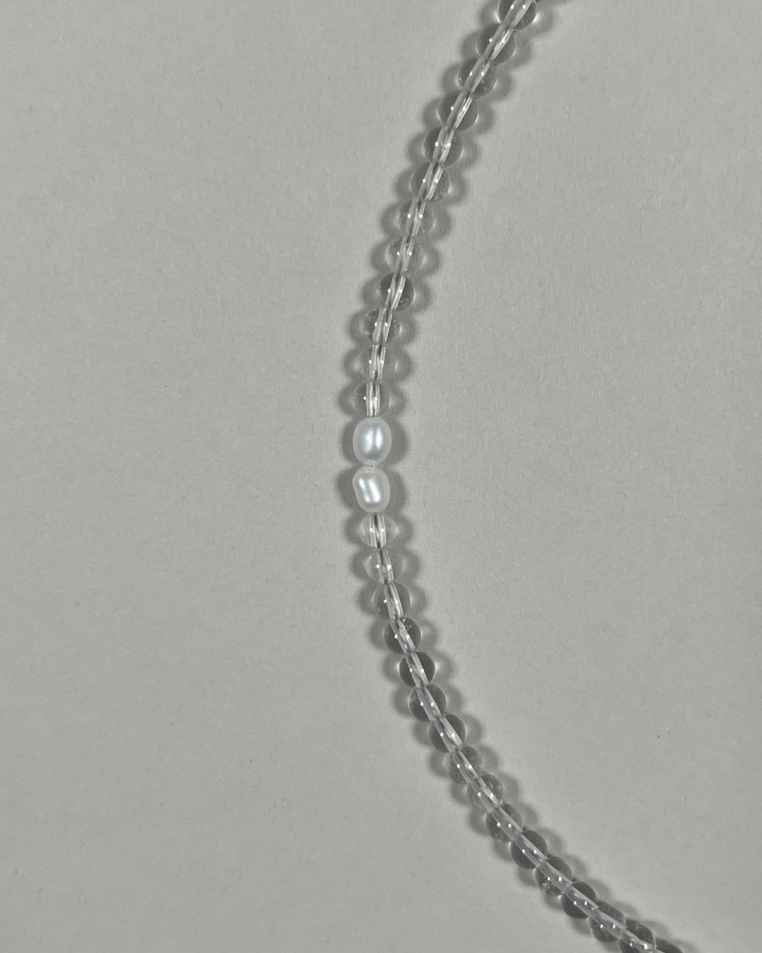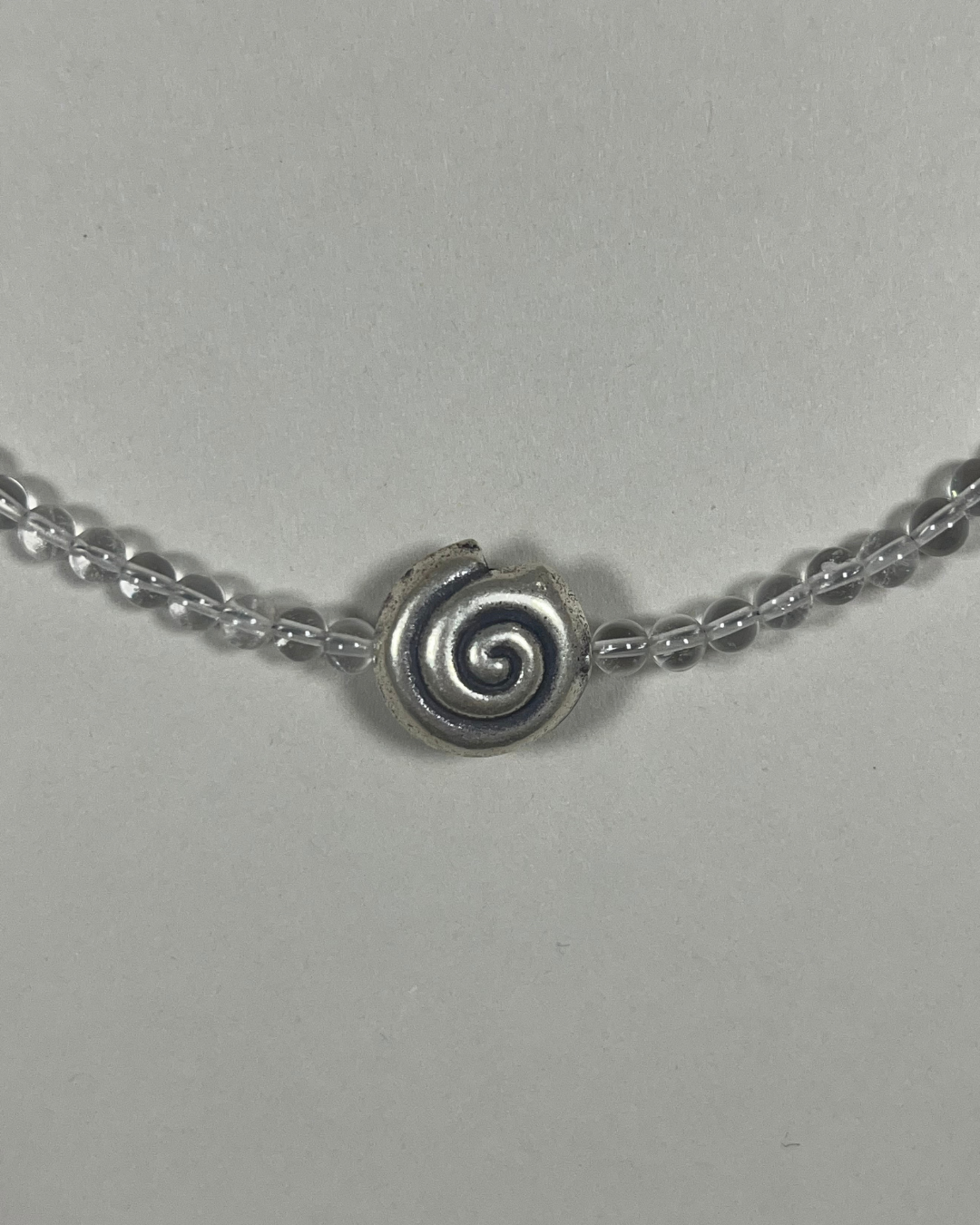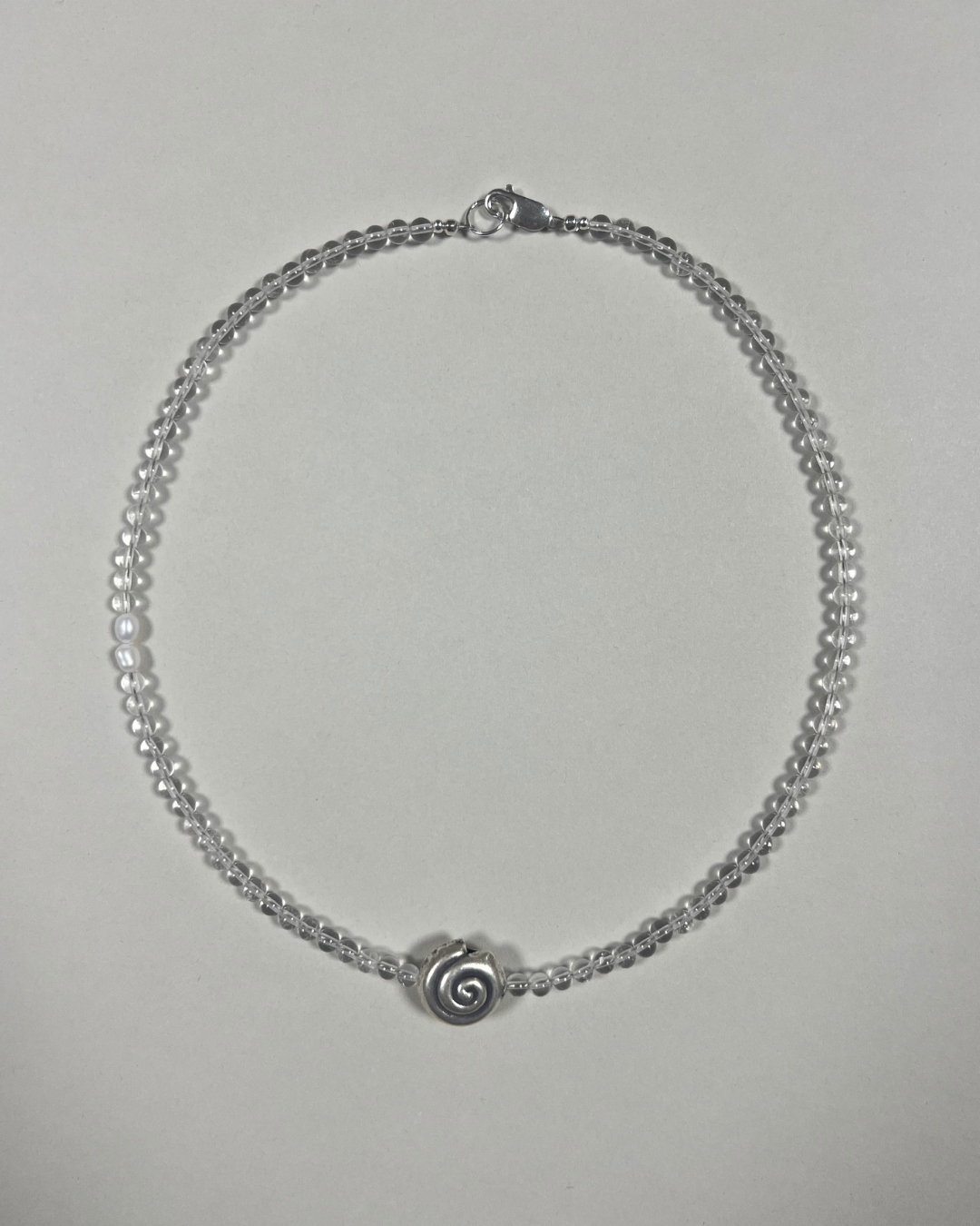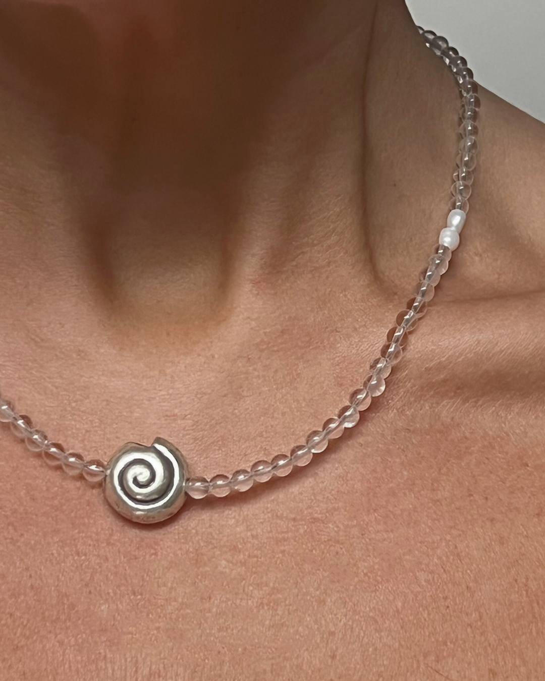 A one-of-a-kind necklace featuring petite clear quartz beads, hand-strung and finished with sterling silver findings and clasp. At its centre sits a large fine silver spiral, accented with a stacked pair of petite freshwater pearls - a luminous detail against the clarity of the quartz.