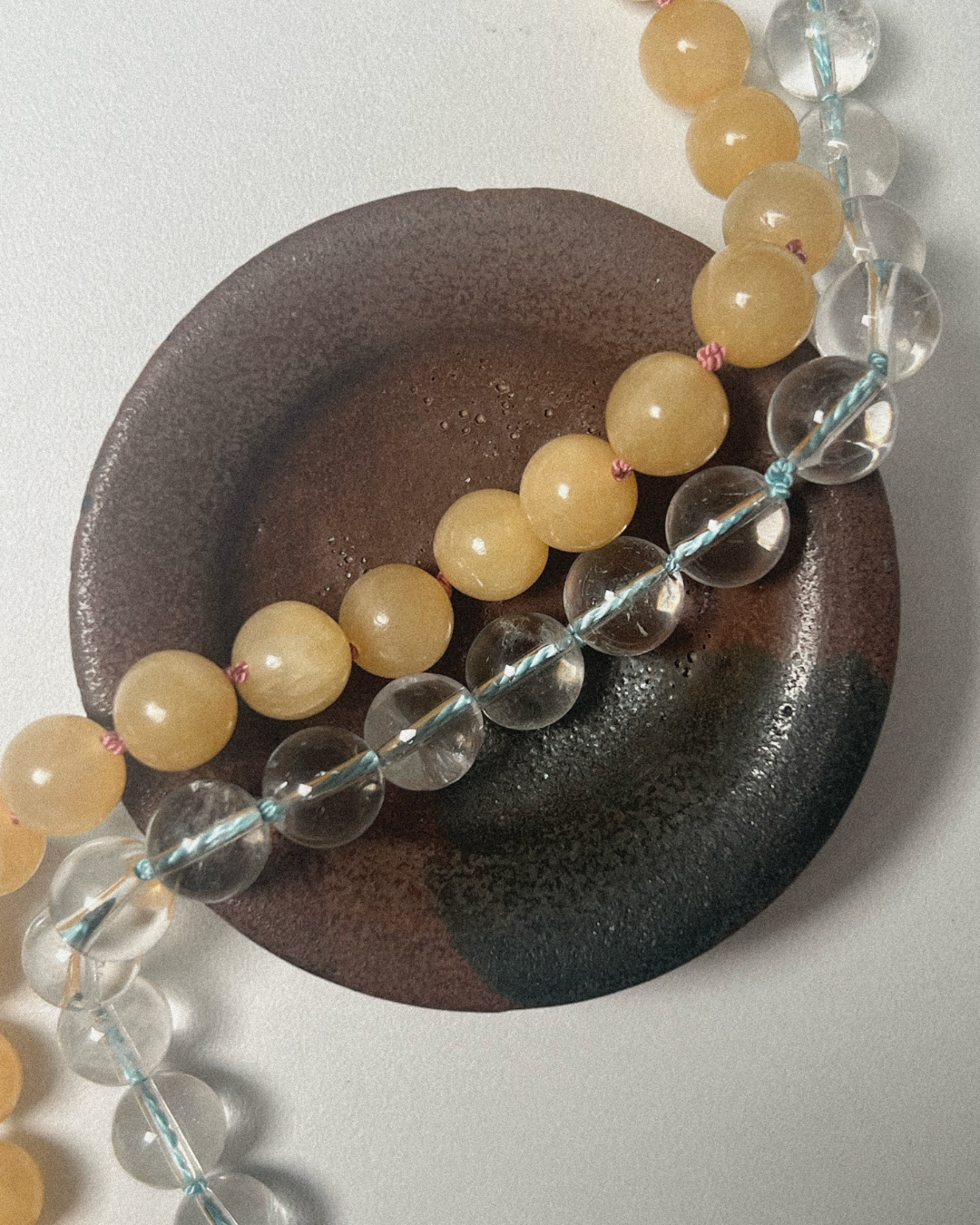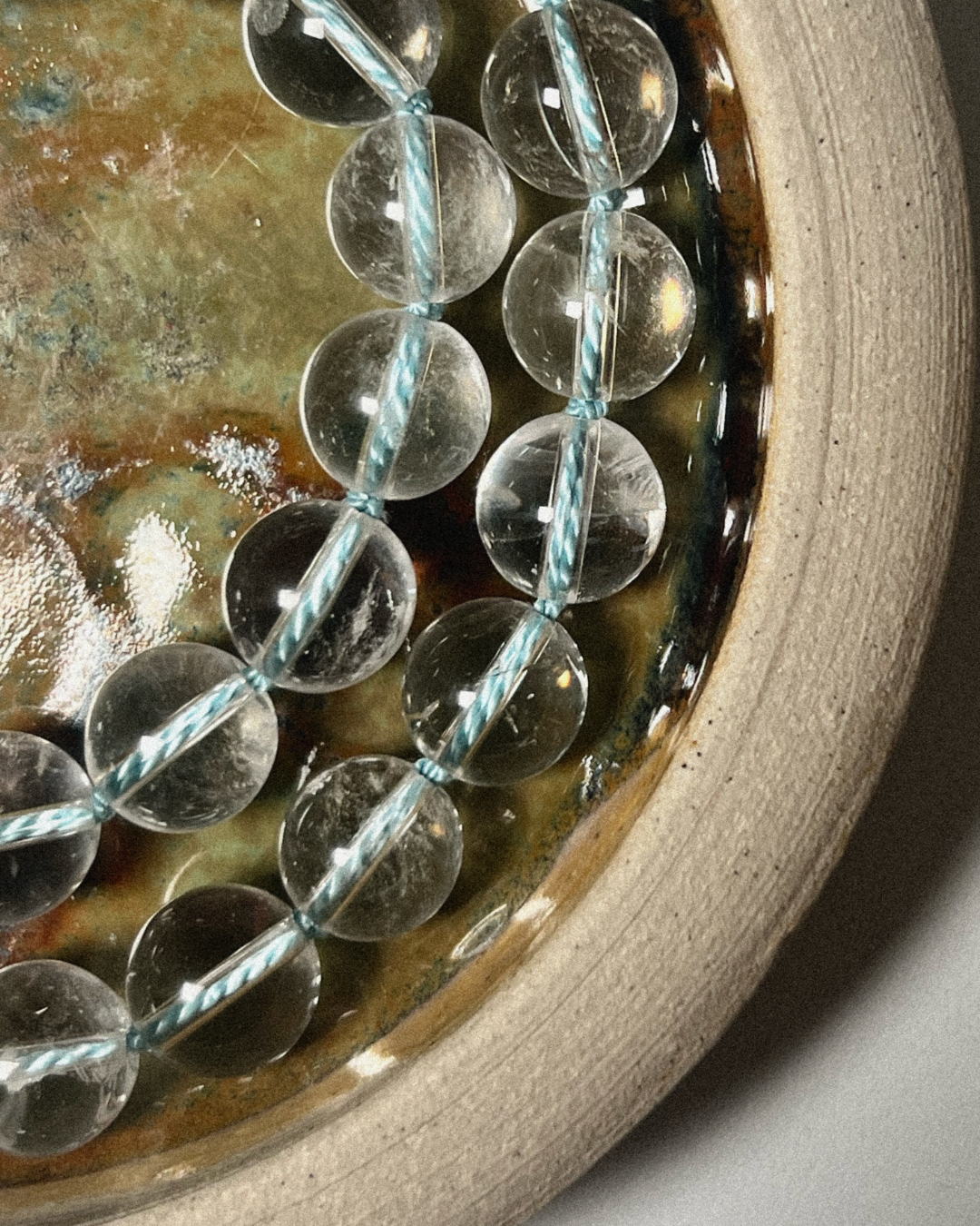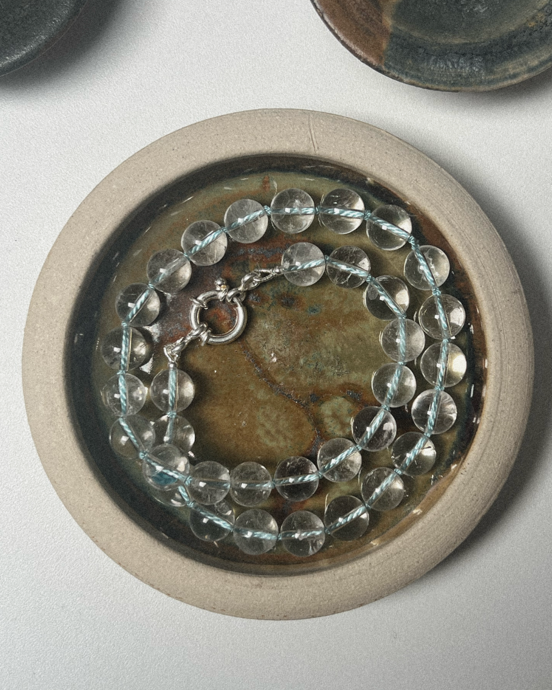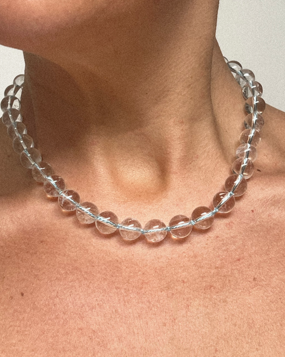 Clear quartz is known as the master stone - amplifying, cleansing and bringing focus. Paired with the soft tone of aqua silk, it feels fluid and calm, like light through water. This necklace is both grounding and expansive, designed as a modern heirloom to bring clarity and intention to everyday ritual.
