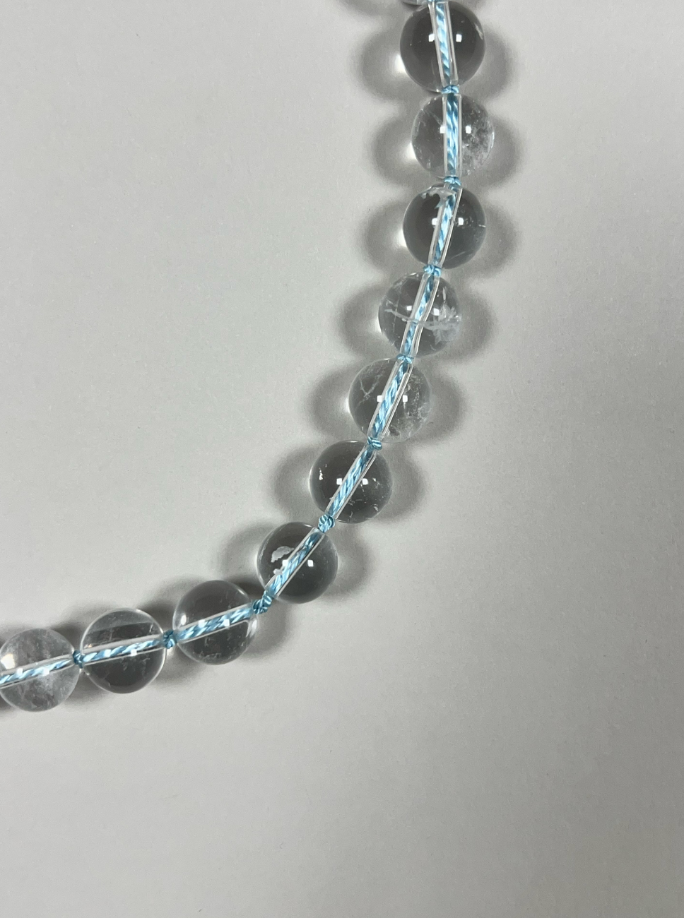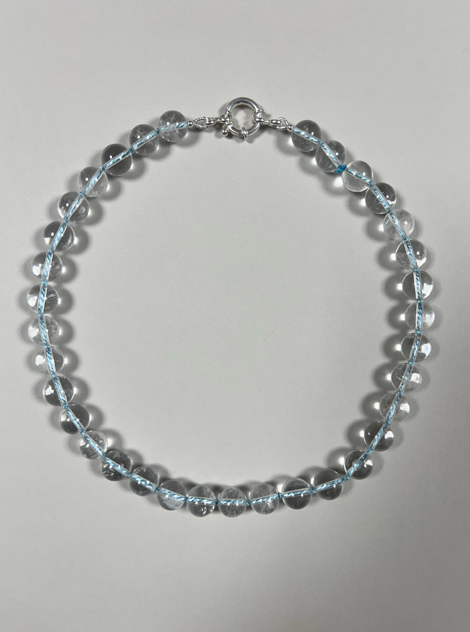 A one-of-a-kind heirloom necklace featuring weighty, smooth clear quartz beads, each hand-knotted on light aqua blue silk. Finished with a sculptural sterling silver clasp, this piece is luminous and refined, offering clarity with a quiet presence.