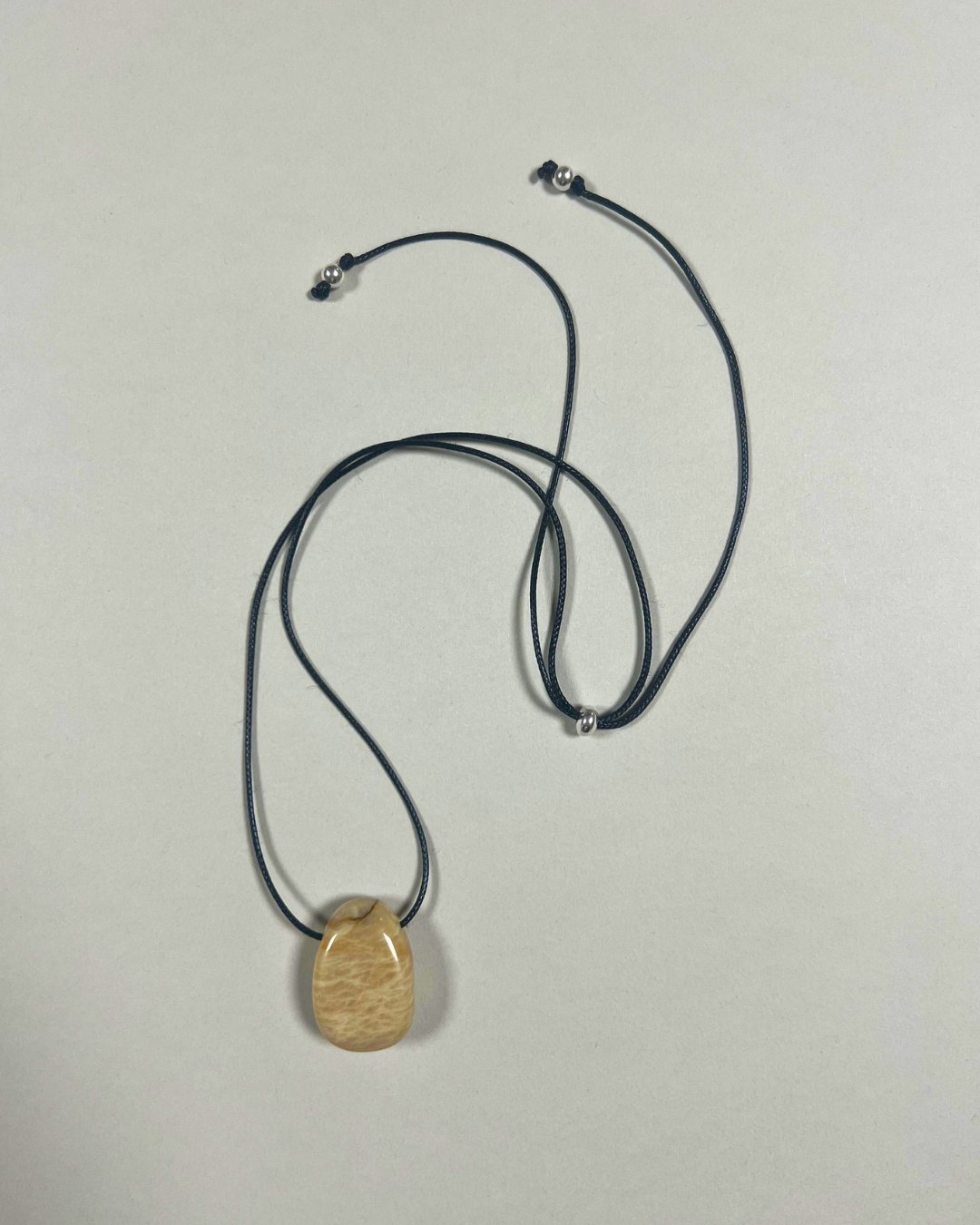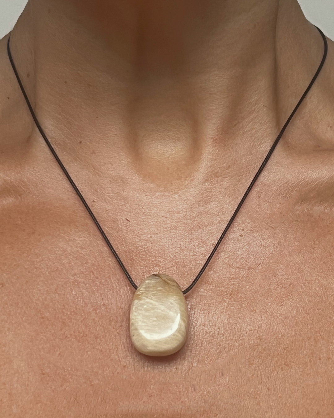 A statement yet timeless necklace featuring a smooth cream moonstone Forma pendant, suspended from a black cord and secured with a sterling silver slider bead and accent beads. Designed for versatility, it can be worn at any length, adjusting effortlessly from long and elegant to a closer fit.