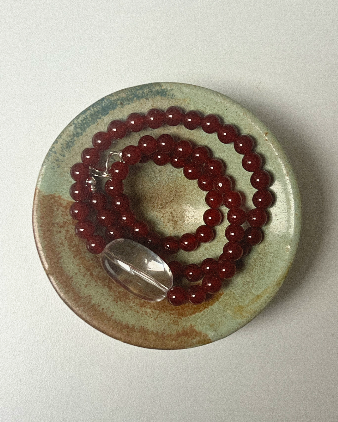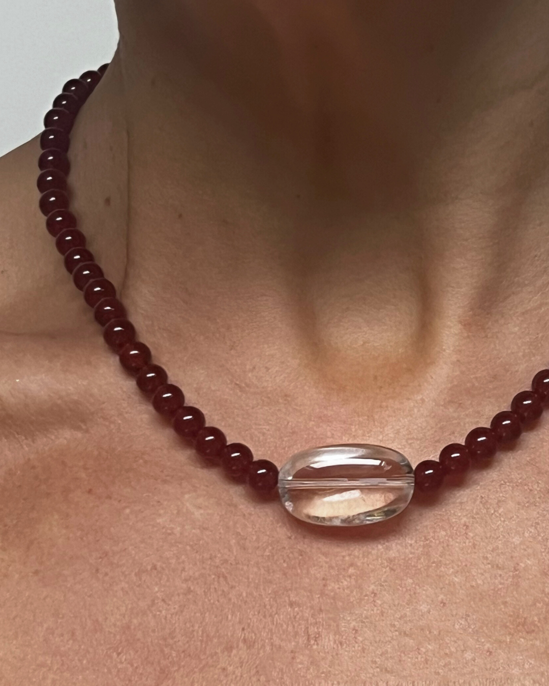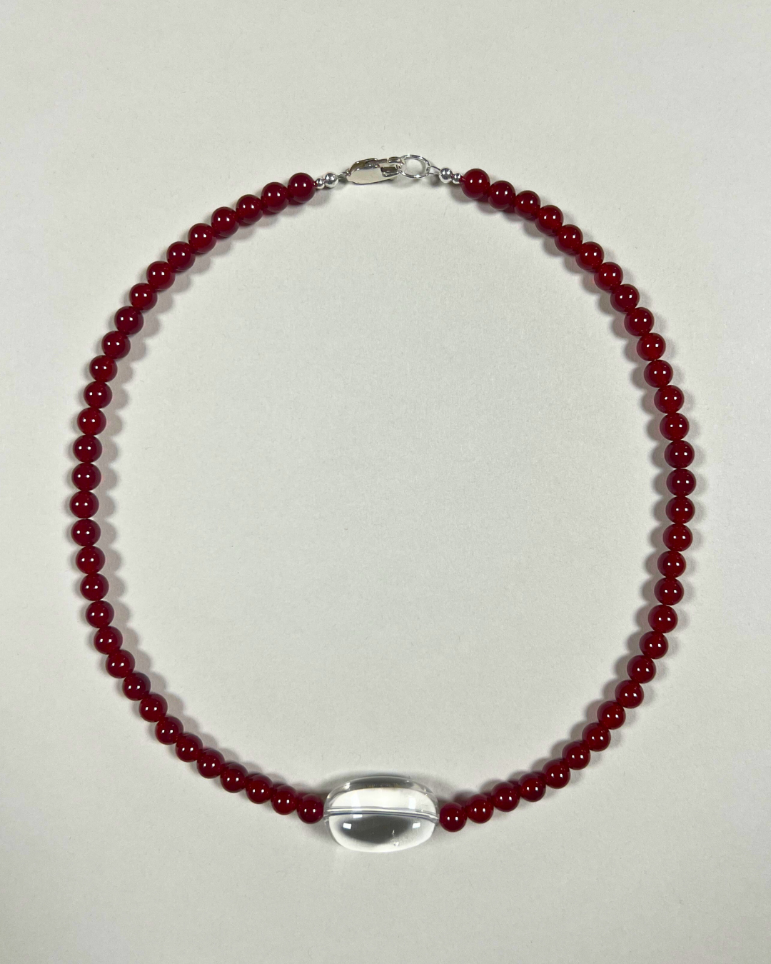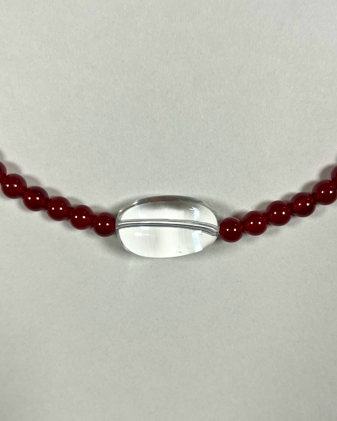 A one-of-a-kind necklace featuring bright red carnelian beads, hand-strung and finished with sterling silver findings and clasp. At its centre sits a large clear quartz bead - a striking focal point that amplifies the fiery warmth of carnelian.