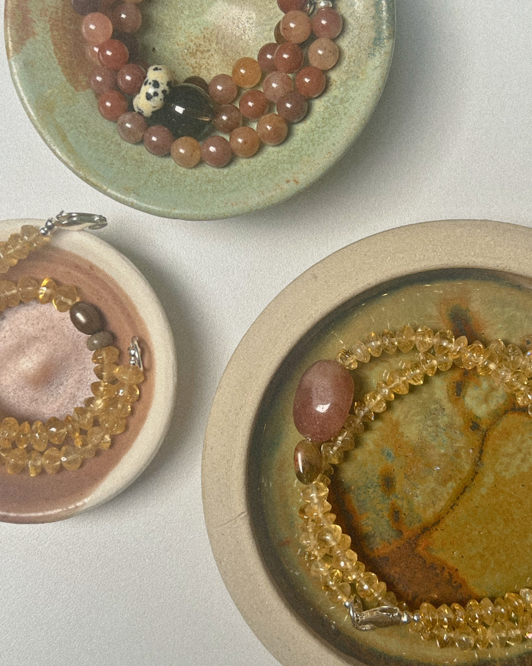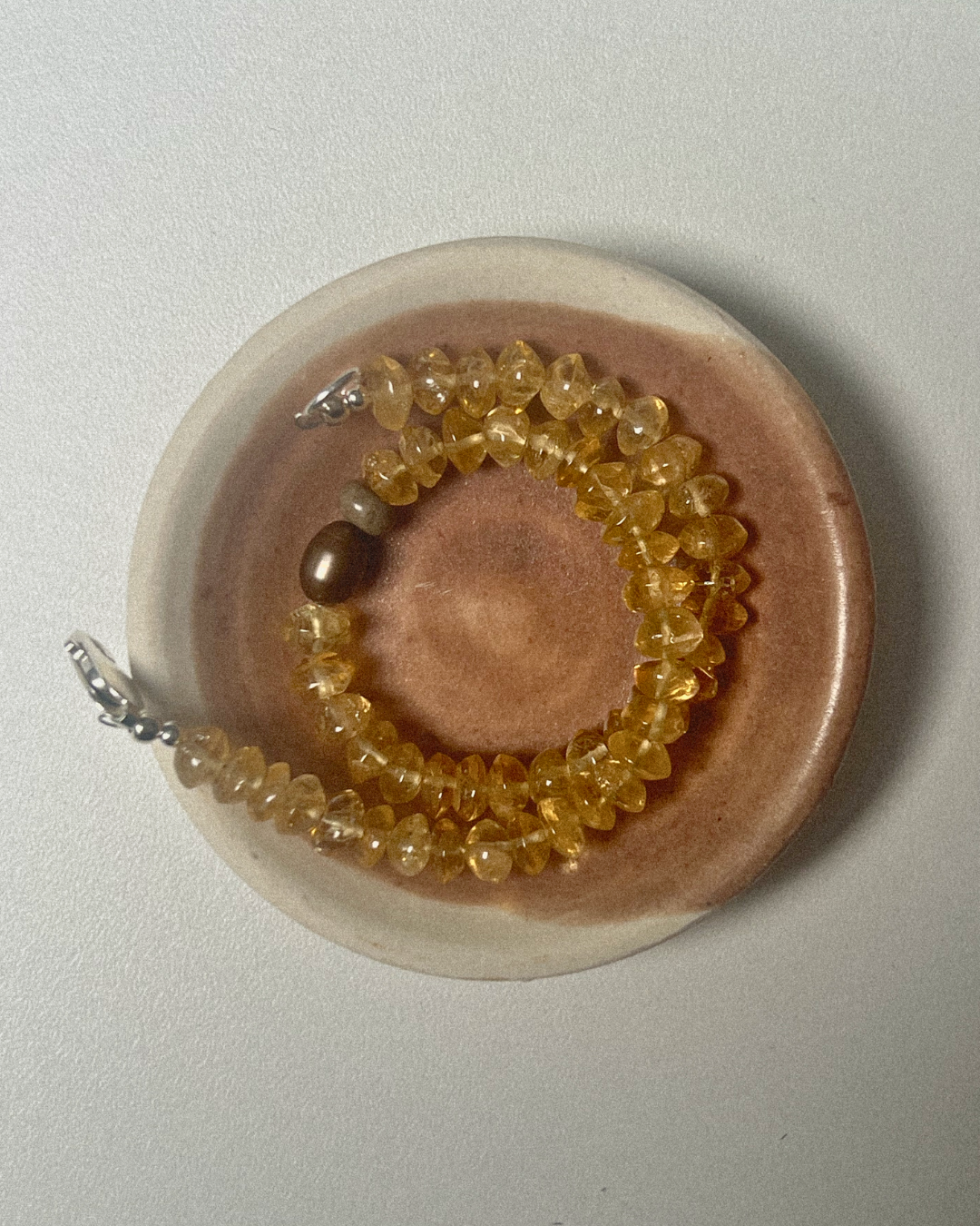 Citrine is associated with joy and vitality, while picasso jasper carries grounding and creative energy. The freshwater pearl brings a soft, luminous detail.