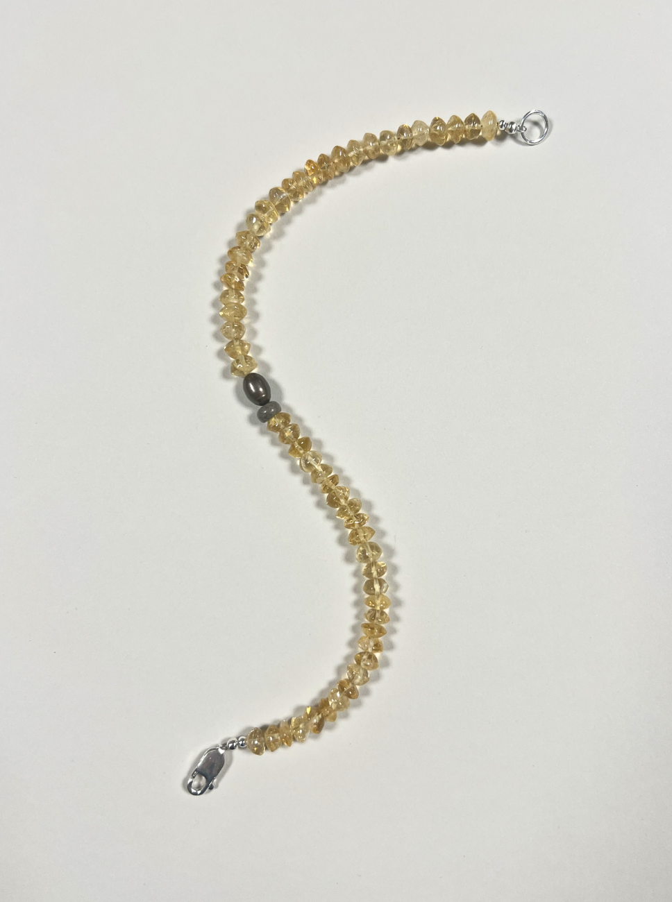 A one-of-a-kind anklet, hand-strung with irregular citrine button beads, their golden tones warm and light-catching. Accents of a warm taupe freshwater pearl and earthy picasso jasper add gentle contrast and texture. Finished with sterling silver findings and clasp.