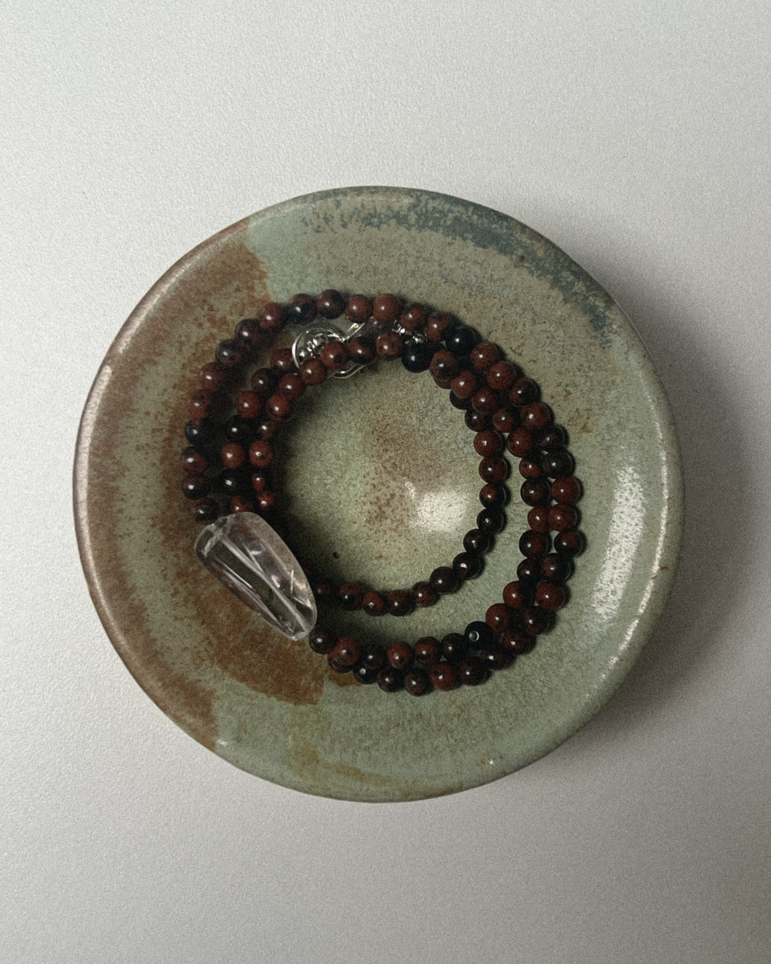 Mahogany obsidian is linked to grounding and protection, offering stability and gentle strength. Clear quartz is associated with clarity, focus, and energetic amplification. Together, they create a piece that feels steady yet light-filled - grounding with a clear, radiant energy.
