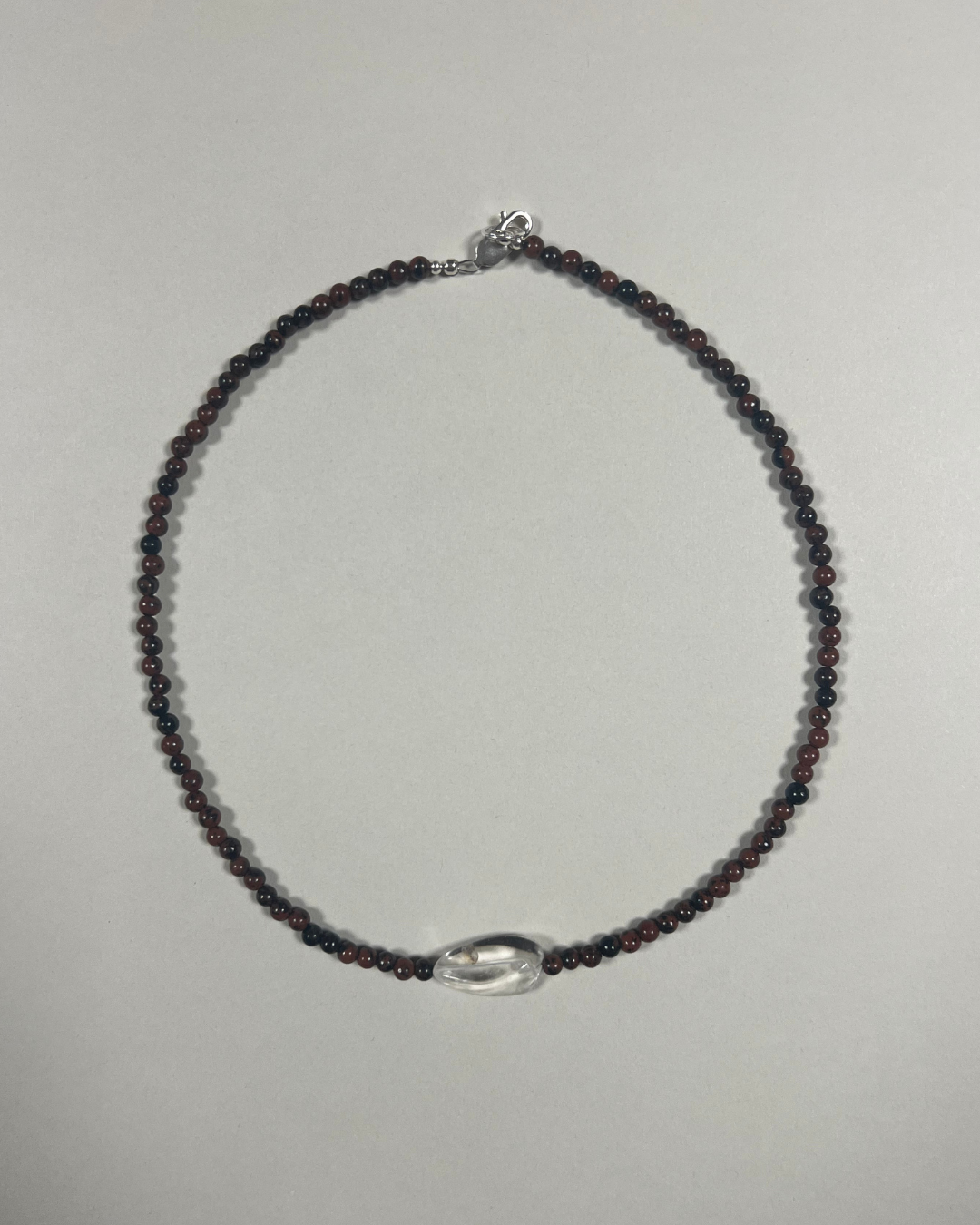 A one-of-a-kind necklace featuring petite mahogany obsidian beads, hand-strung and finished with sterling silver findings and clasp. At its centre sits a clear quartz nugget, adding brightness and contrast to the deep, earthy tones of the obsidian.
