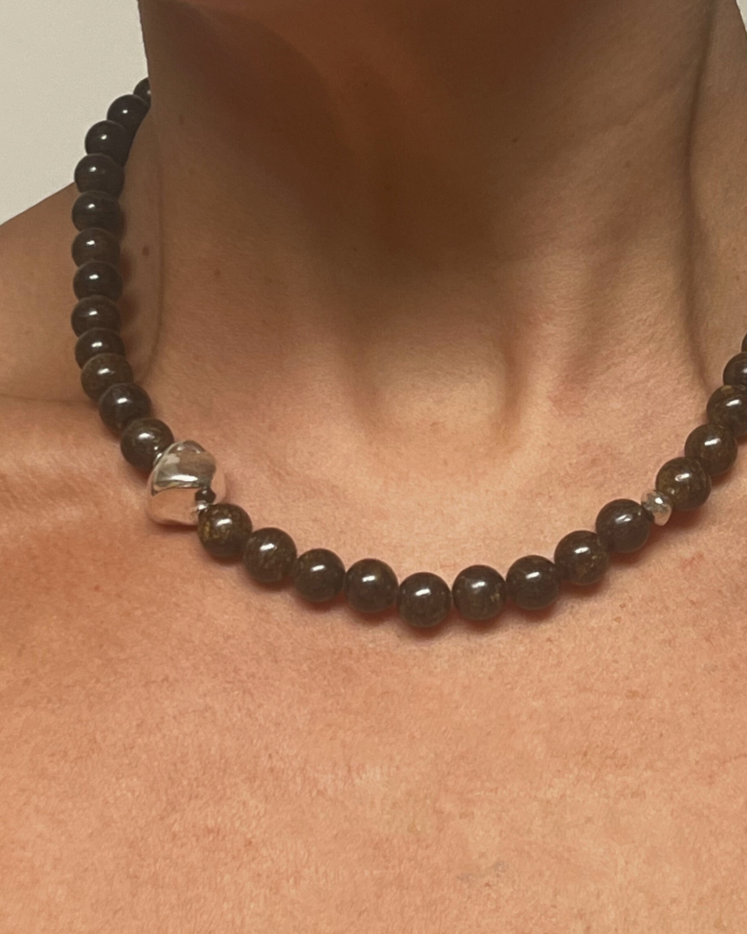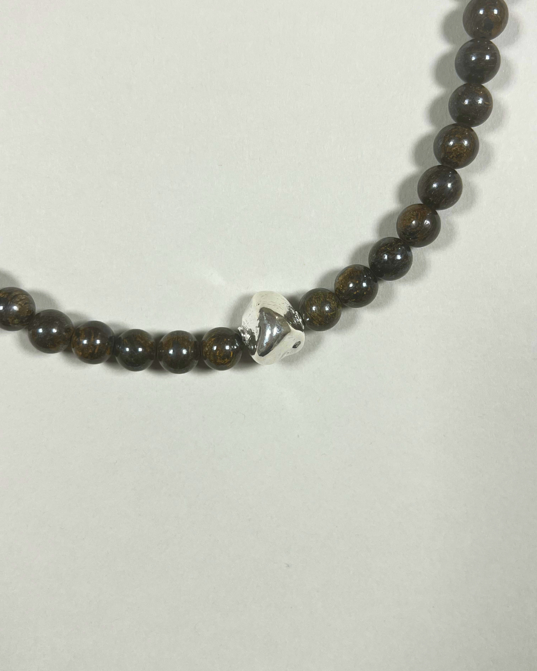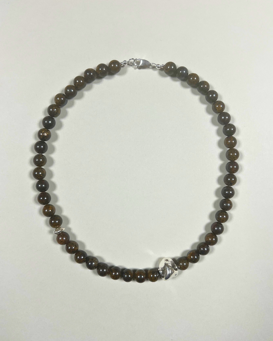 A one-of-a-kind necklace featuring weighty bronzite beads, hand-strung and finished with sterling silver findings and clasp. At its centre sits a large textured sterling silver nugget, paired with a smaller silver accent bead for balance and contrast.