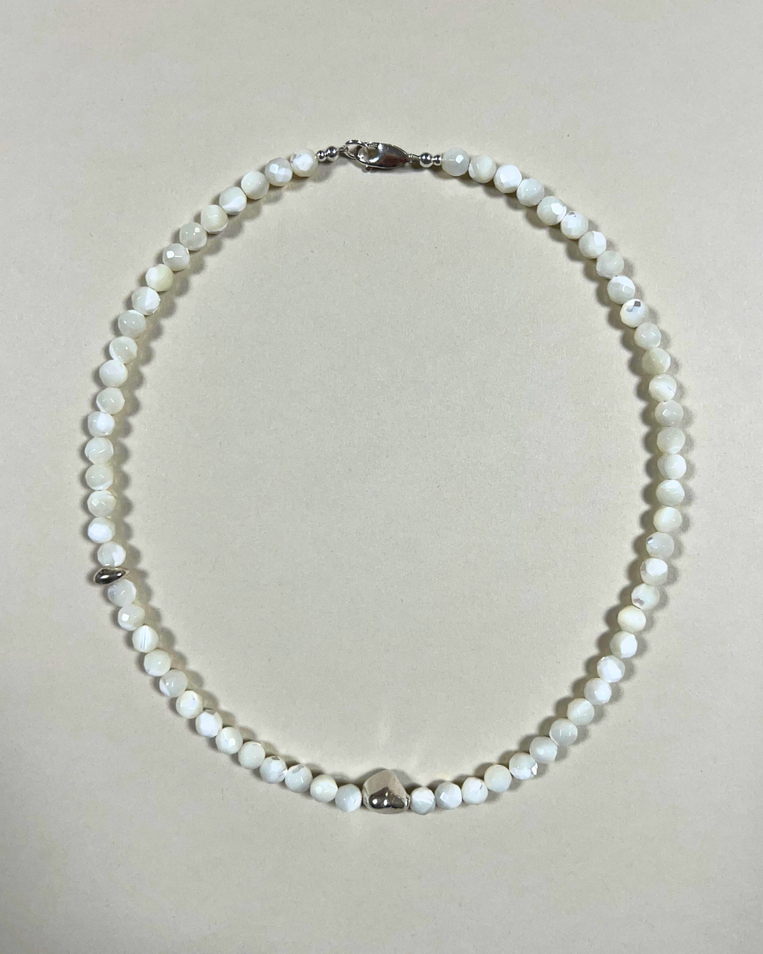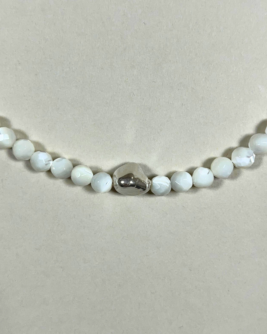 A one-of-a-kind necklace featuring 6mm textured mother of pearl beads, hand-strung and finished with sterling silver findings and clasp. Accented with a large and smaller sterling silver nugget, adding contrast and subtle brightness to the soft iridescence of the pearl.