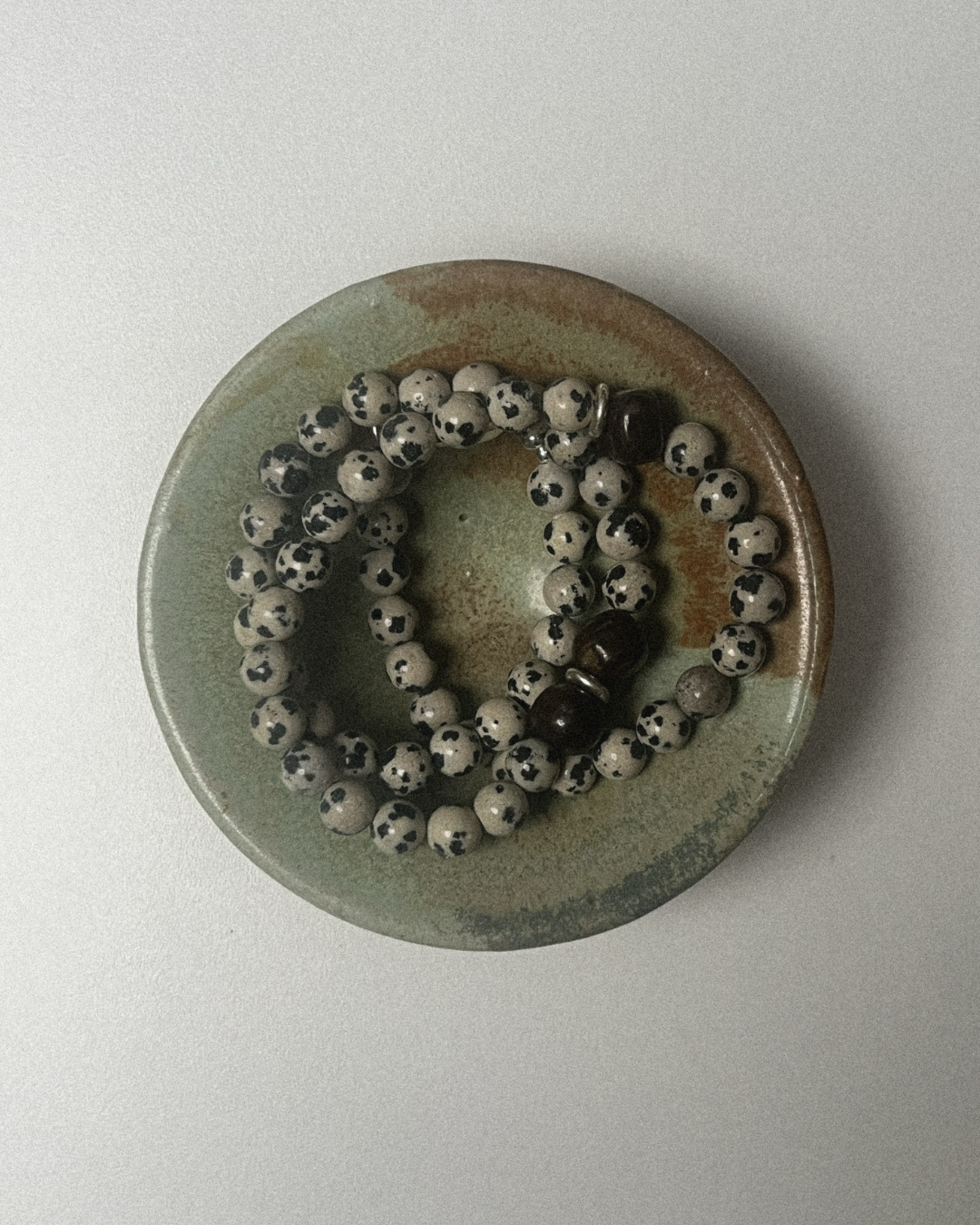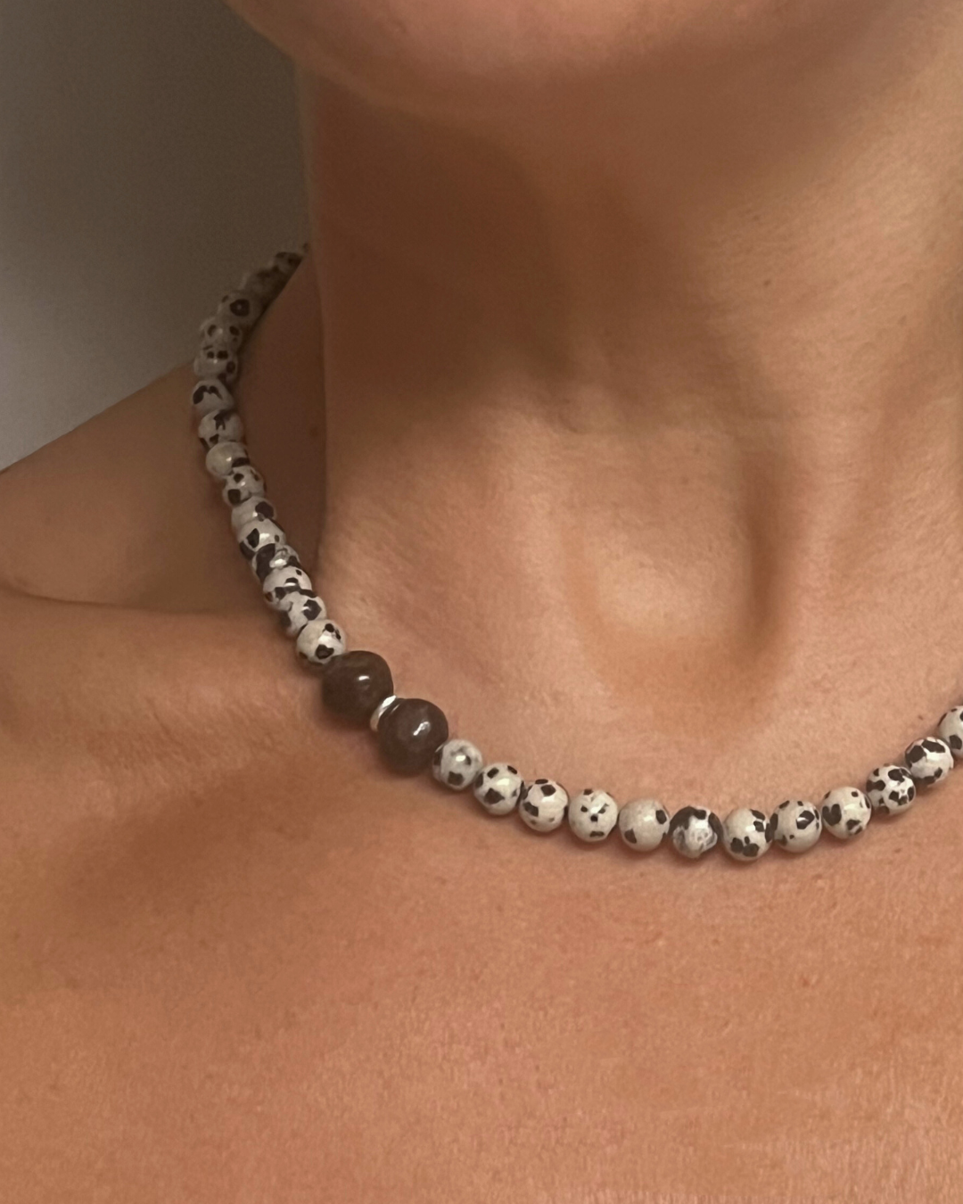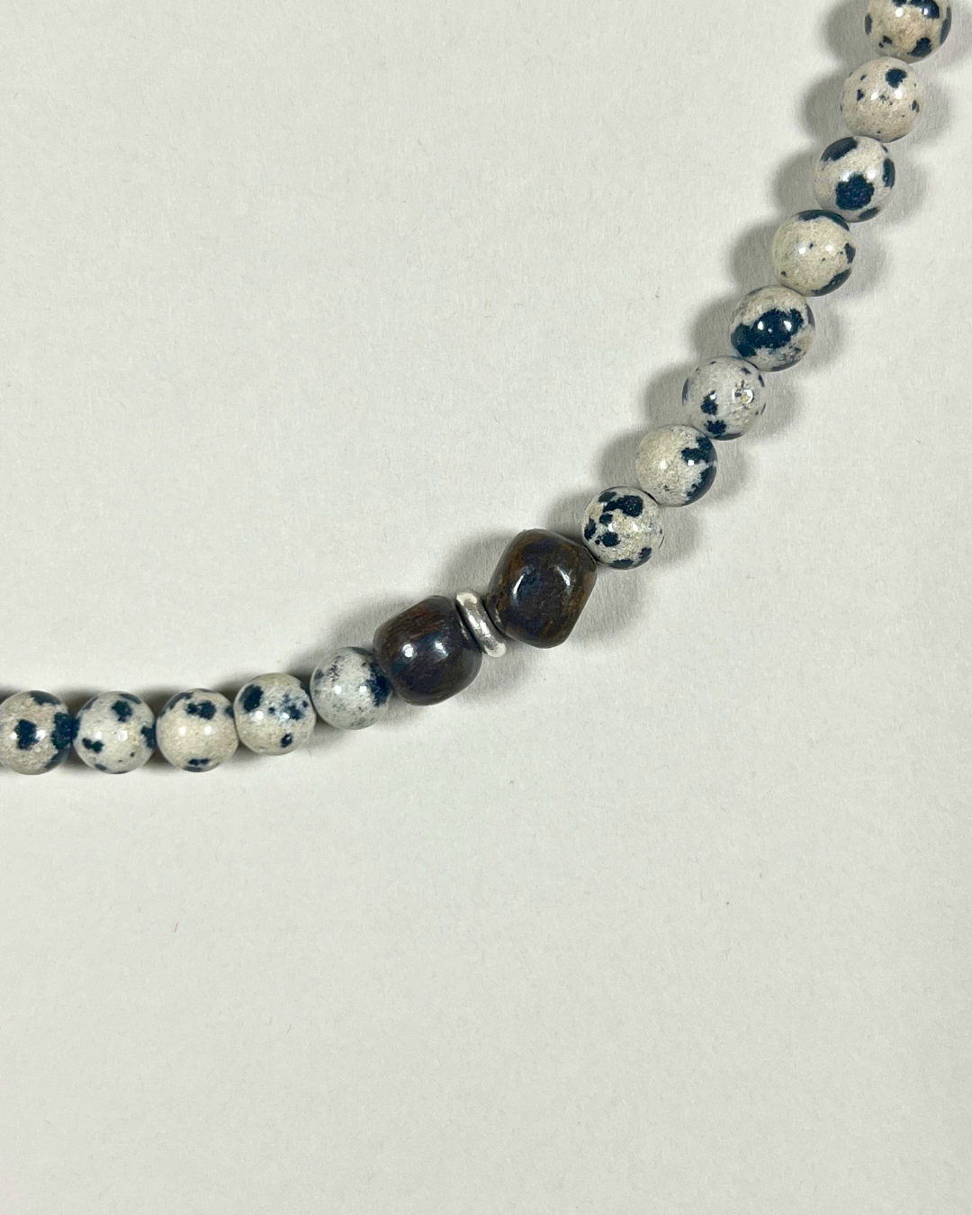 Dalmatian jasper is associated with joy, balance, and light-hearted energy, encouraging presence and optimism. Bronzite brings stability, strength, and protection, while silver offers balance and subtle brightness. Together, they create a piece that feels steady yet uplifting - grounding, joyful, and quietly composed.