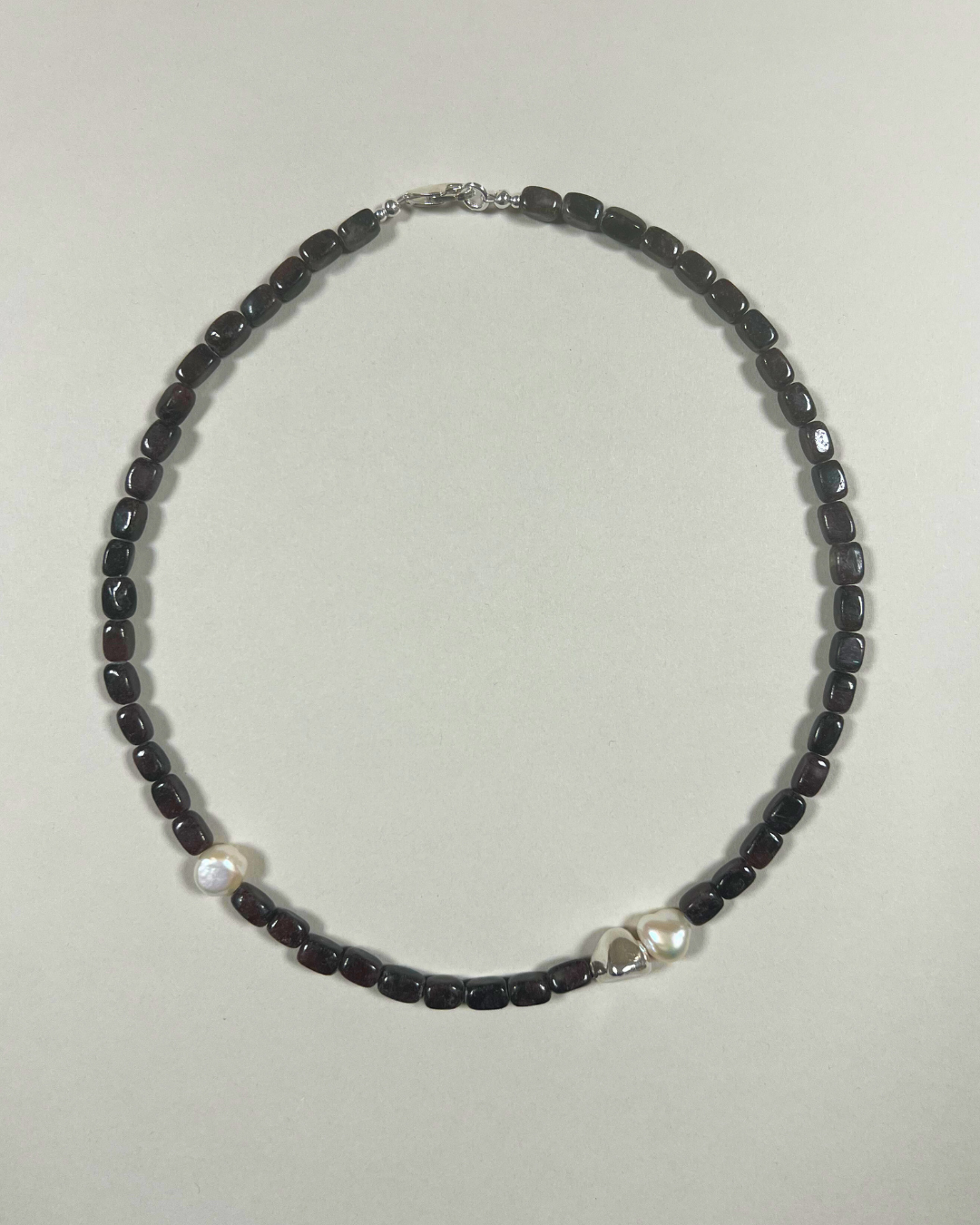 A one-of-a-kind necklace featuring matte cuboid garnet beads, hand-strung and finished with sterling silver findings and clasp. Accented with freshwater pearls and a sterling silver nugget, adding contrast and balance to the deep, velvety tones of the garnet.