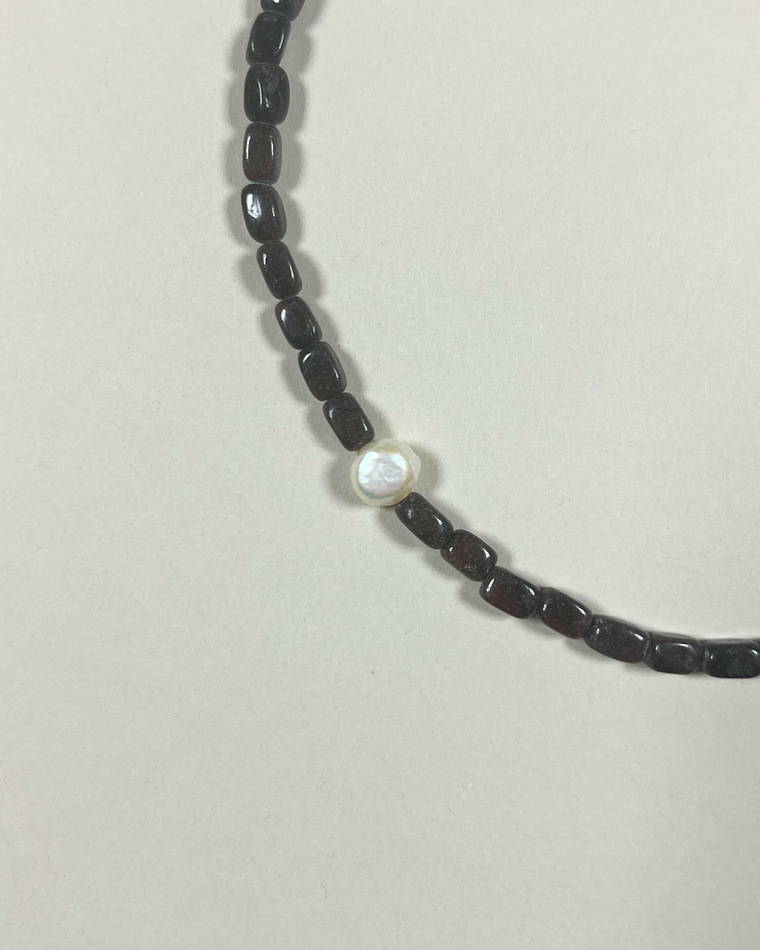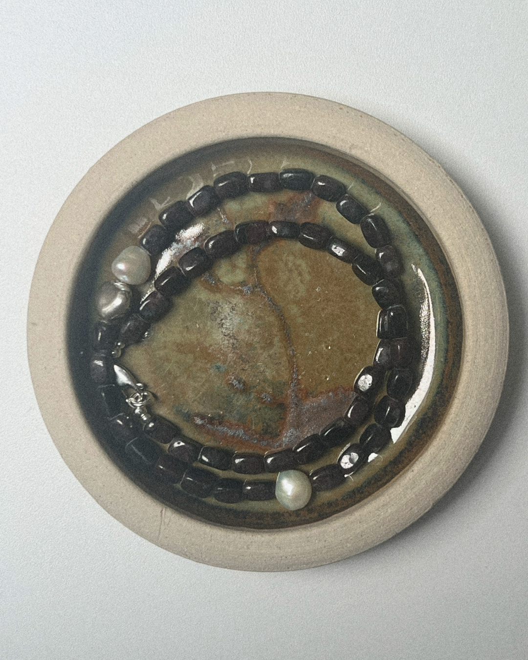 Garnet is associated with vitality, grounding, and resilience, offering steady strength and depth. Pearl brings softness and reflection, while silver adds balance and quiet luminosity. Together, they create a piece that feels bold yet gentle — grounding, steady, and quietly radiant.
