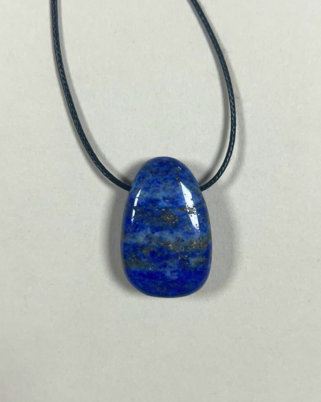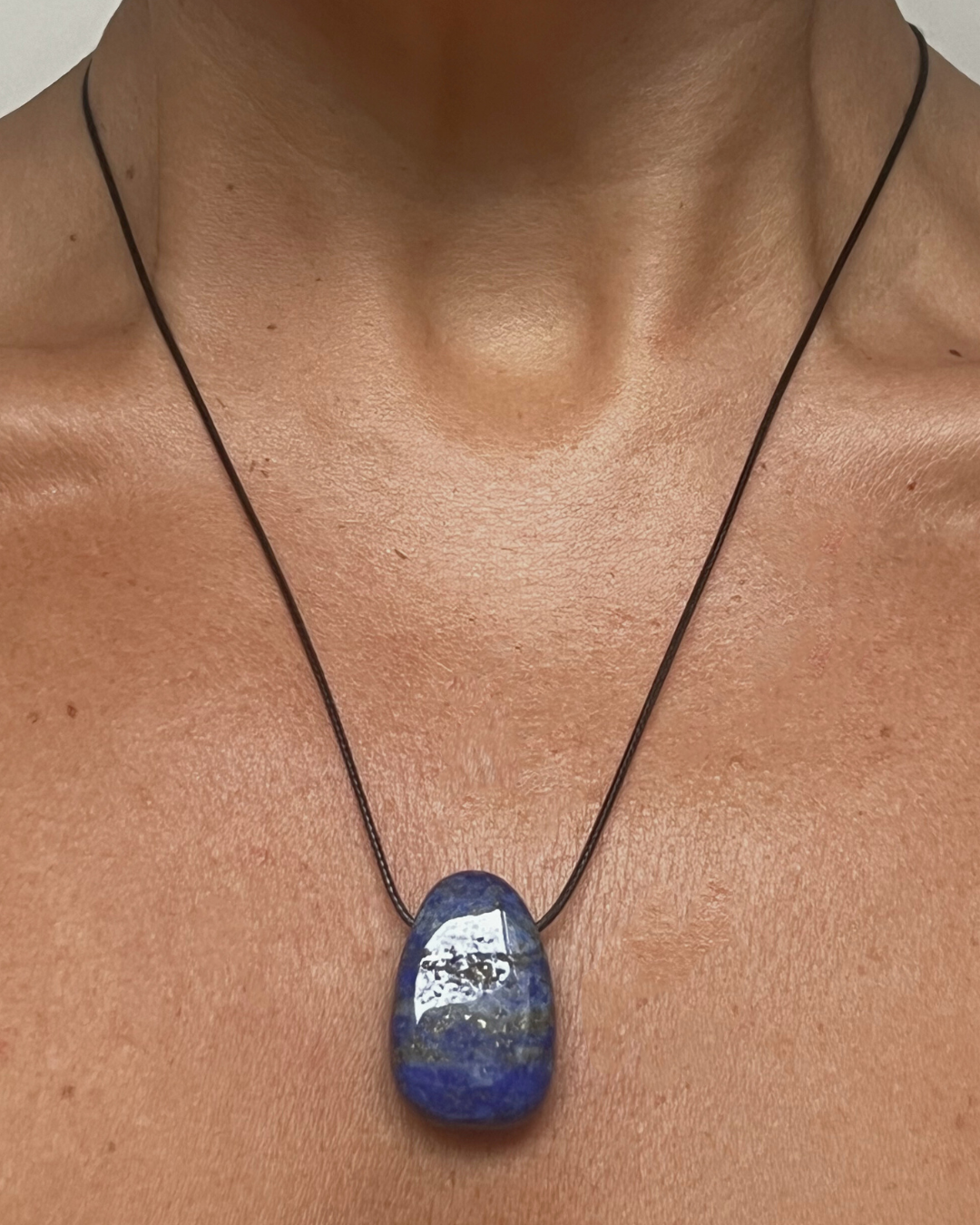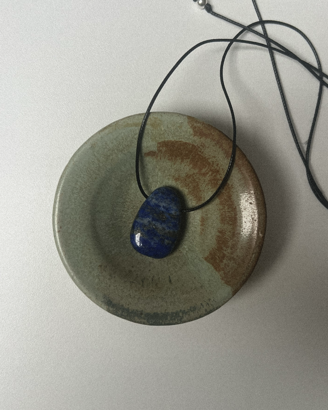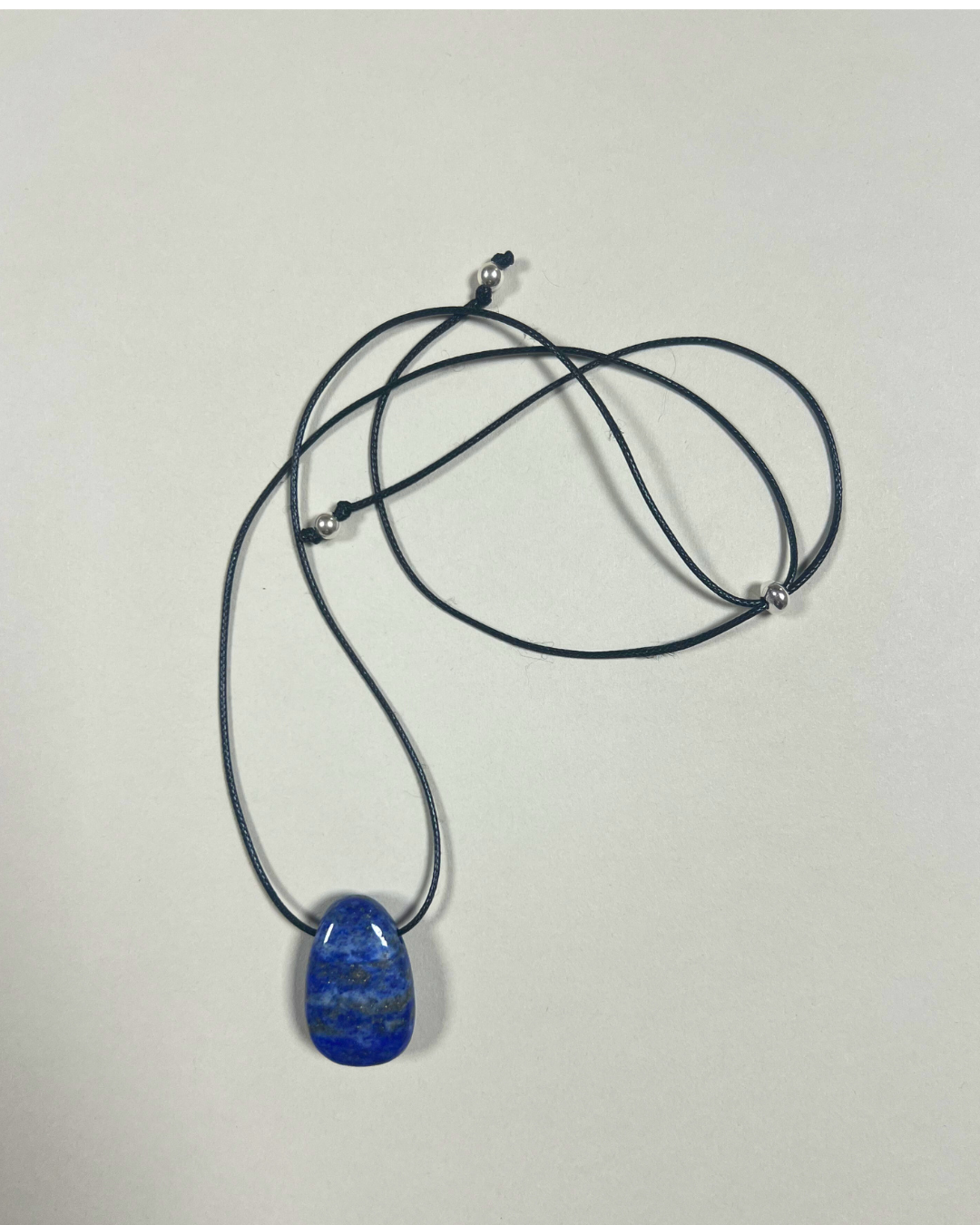 A statement yet timeless necklace featuring a smooth lapis lazuli Forma pendant, suspended from a black cord and secured with a sterling silver slider bead and accent beads. Designed for versatility, it can be worn at any length, adjusting effortlessly from long and elegant to a closer fit.