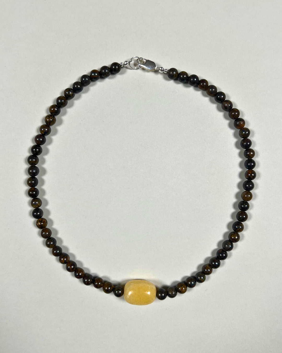A one-of-a-kind necklace featuring 8mm bronzite beads, hand-strung and finished with sterling silver findings and clasp. At its centre sits a smooth yellow calcite bead - a luminous focal point that contrasts beautifully with the grounding depth of the bronzite.