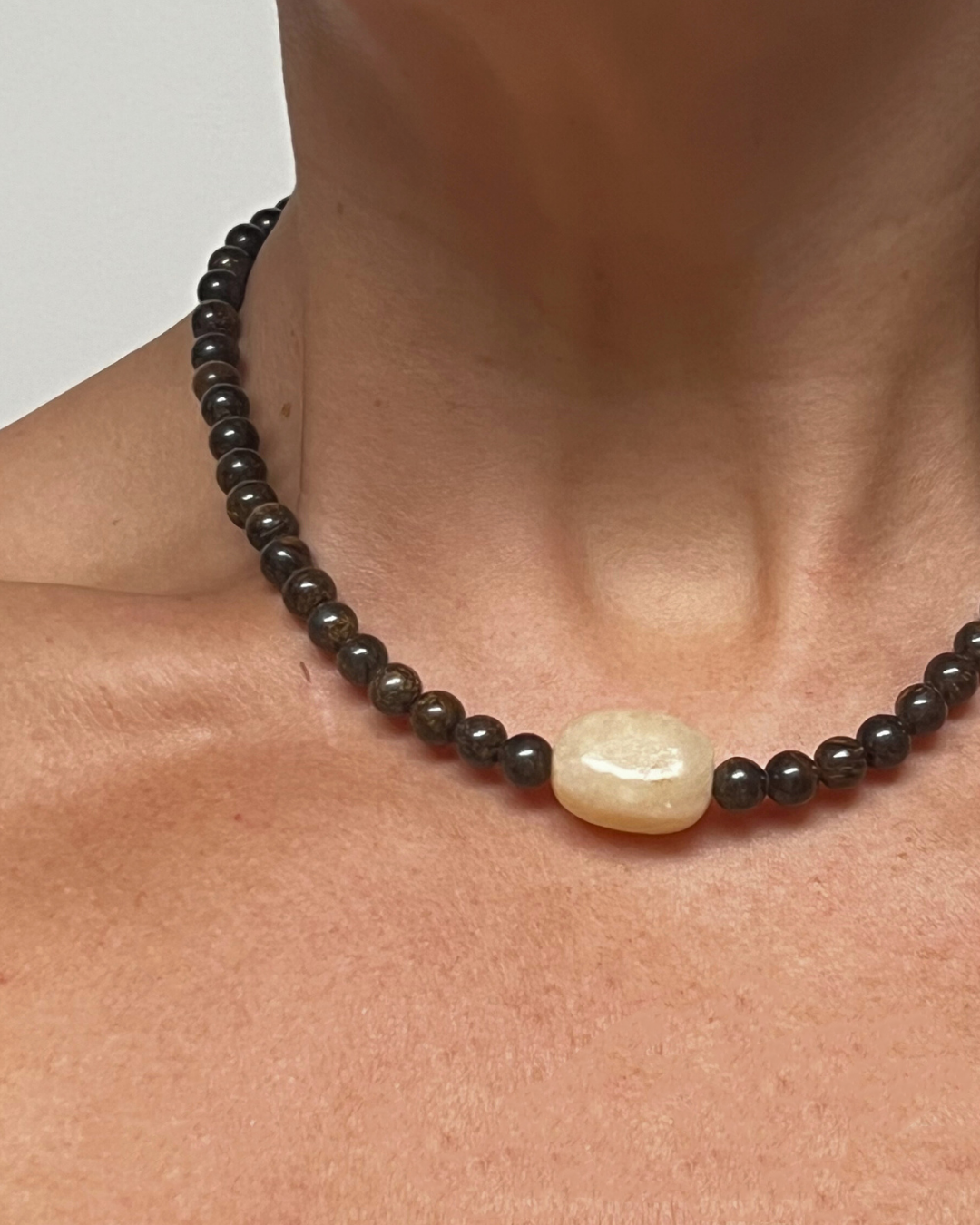 Bronzite is associated with stability, strength, and resilience, offering a steady, protective presence. Yellow calcite is linked to clarity, confidence, and vitality, bringing light and warmth to the piece. Together, they create a necklace that feels grounding yet bright - steady, balanced, and quietly uplifting.