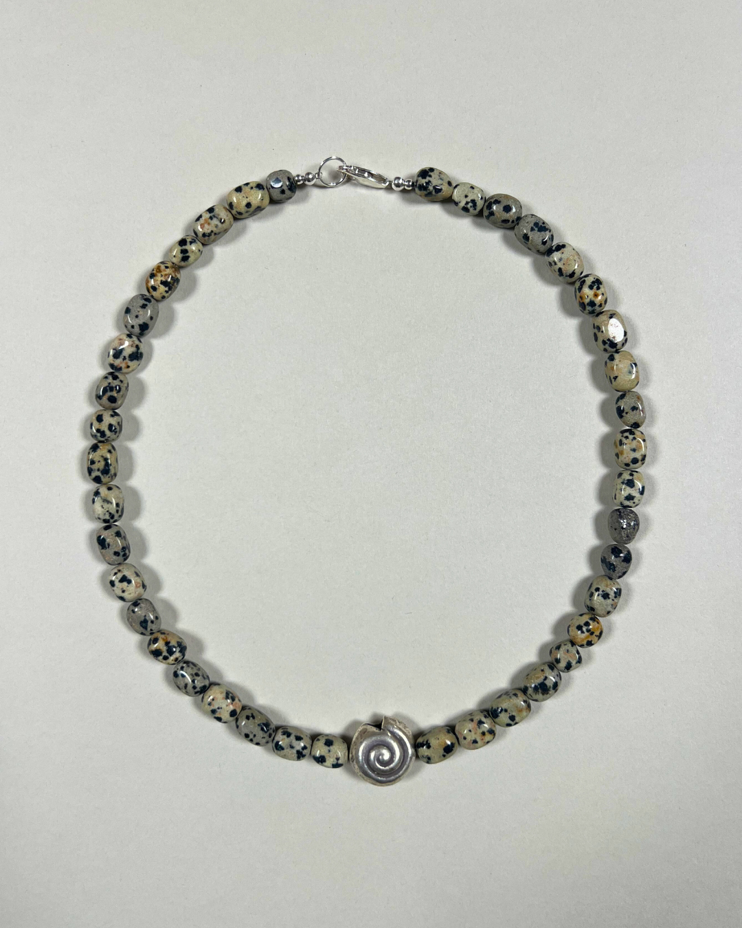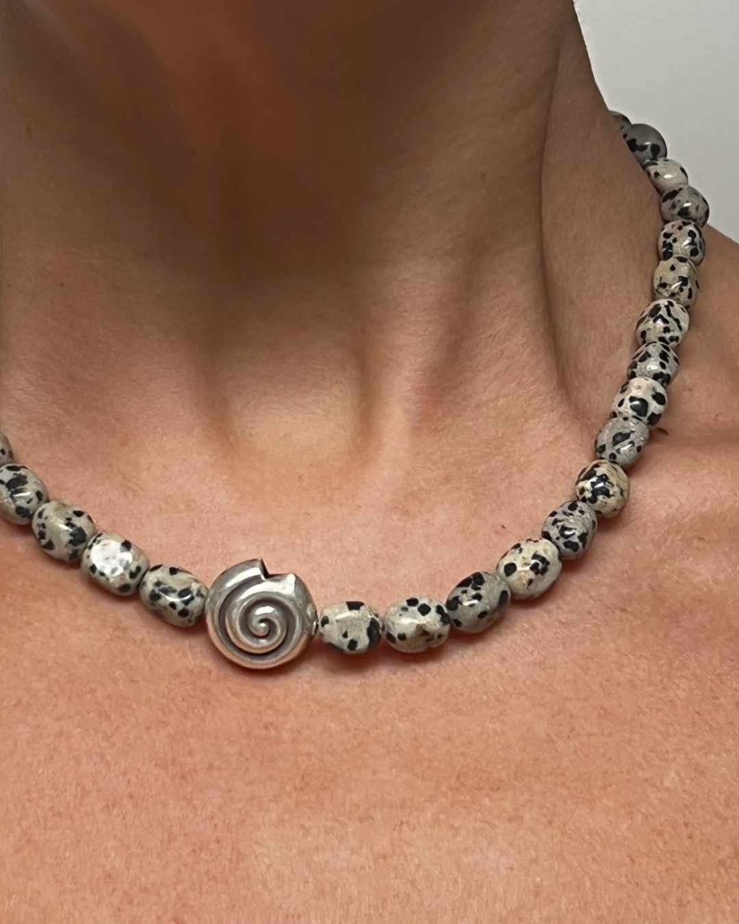 A one-of-a-kind necklace featuring irregular dalmatian jasper nugget beads, hand-strung and finished with sterling silver findings and clasp. At its centre sits a fine silver spiral - a striking focal point that brings texture and movement to the playful, speckled jasper.