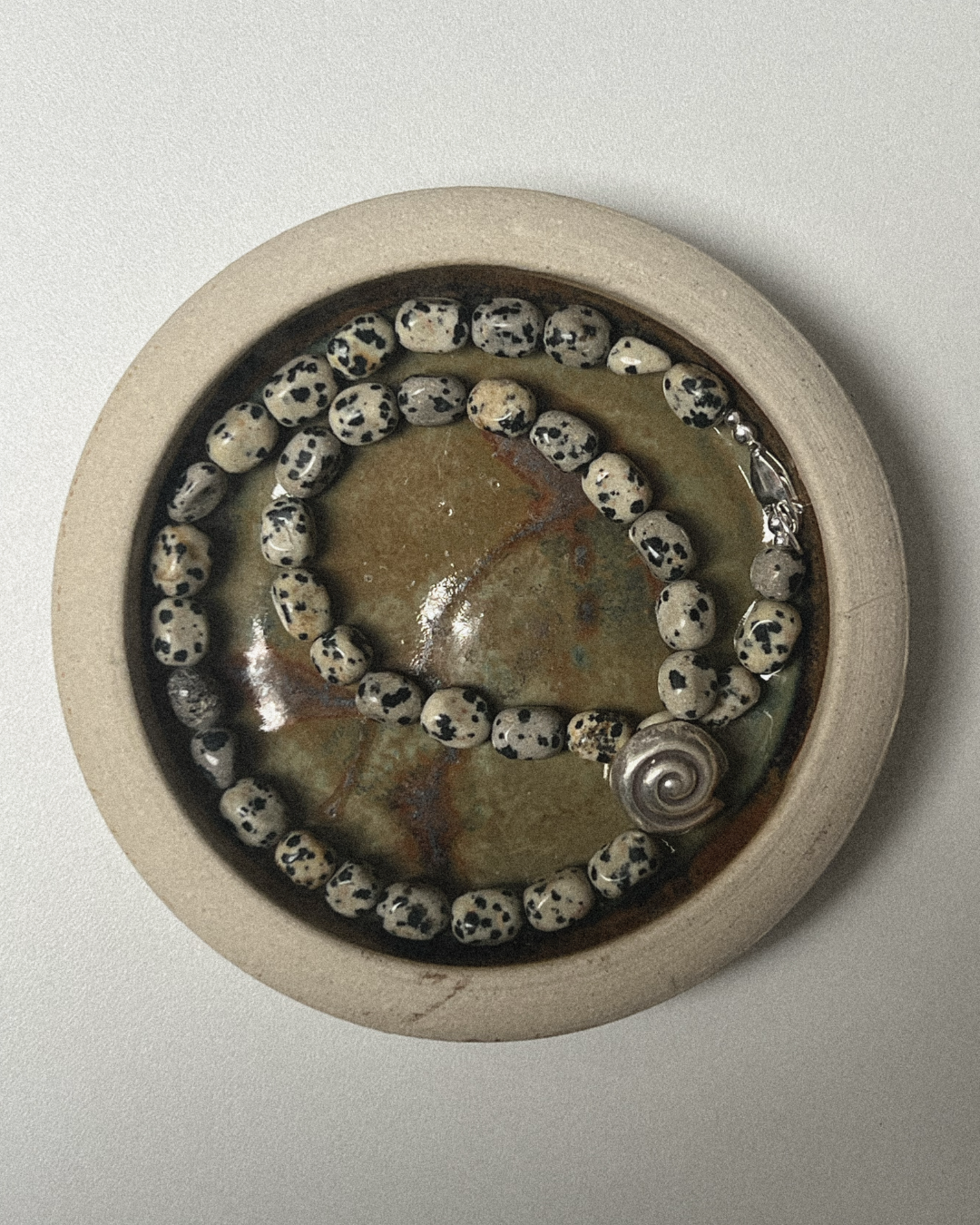 Dalmatian jasper is linked to joy, grounding, and balance, encouraging light-hearted energy and steady presence. The silver spiral symbolises rhythm, flow, and gentle transformation, adding a sense of harmony and continuity. Together, they create a piece that feels steady yet uplifting - grounding, joyful, and quietly balanced.