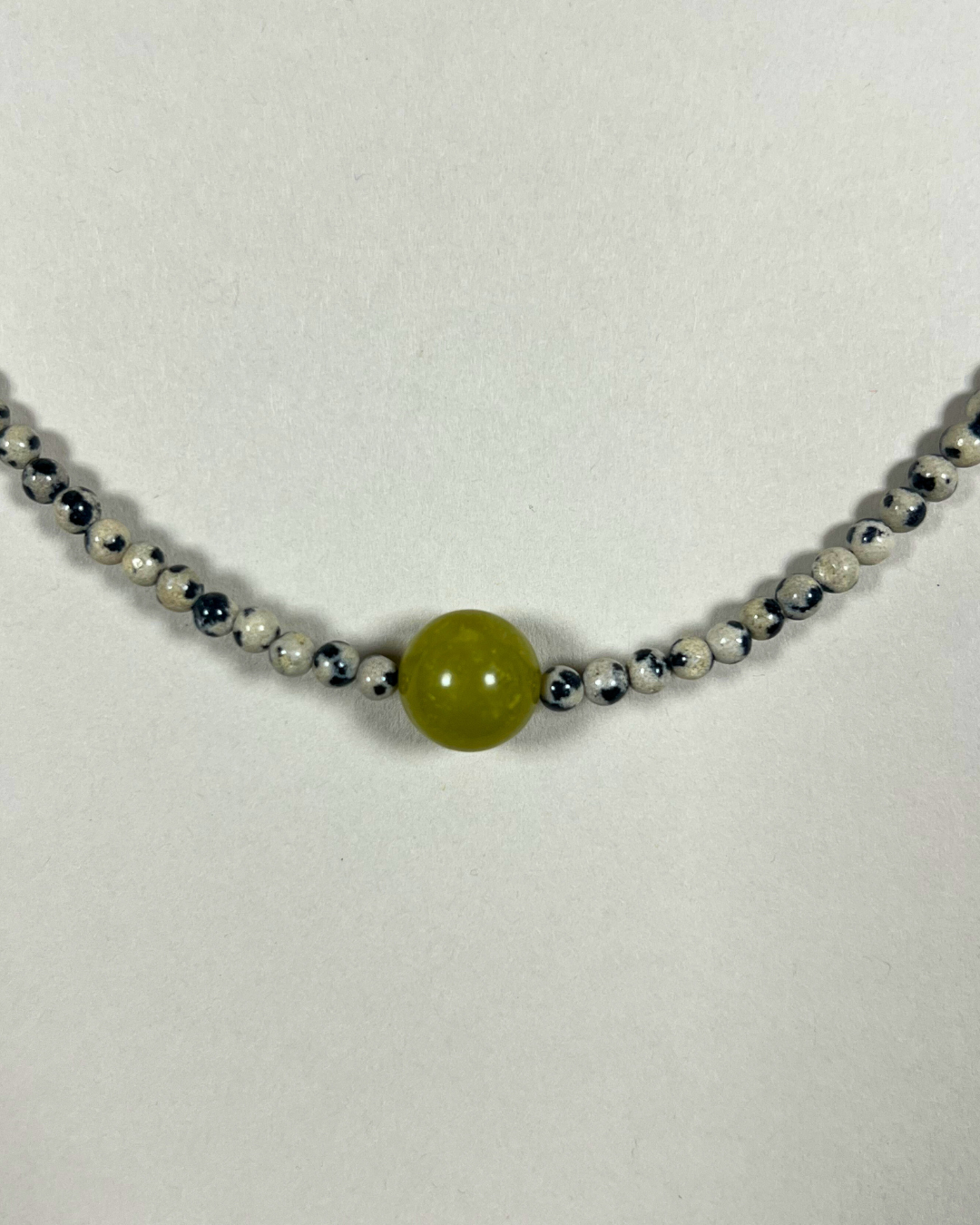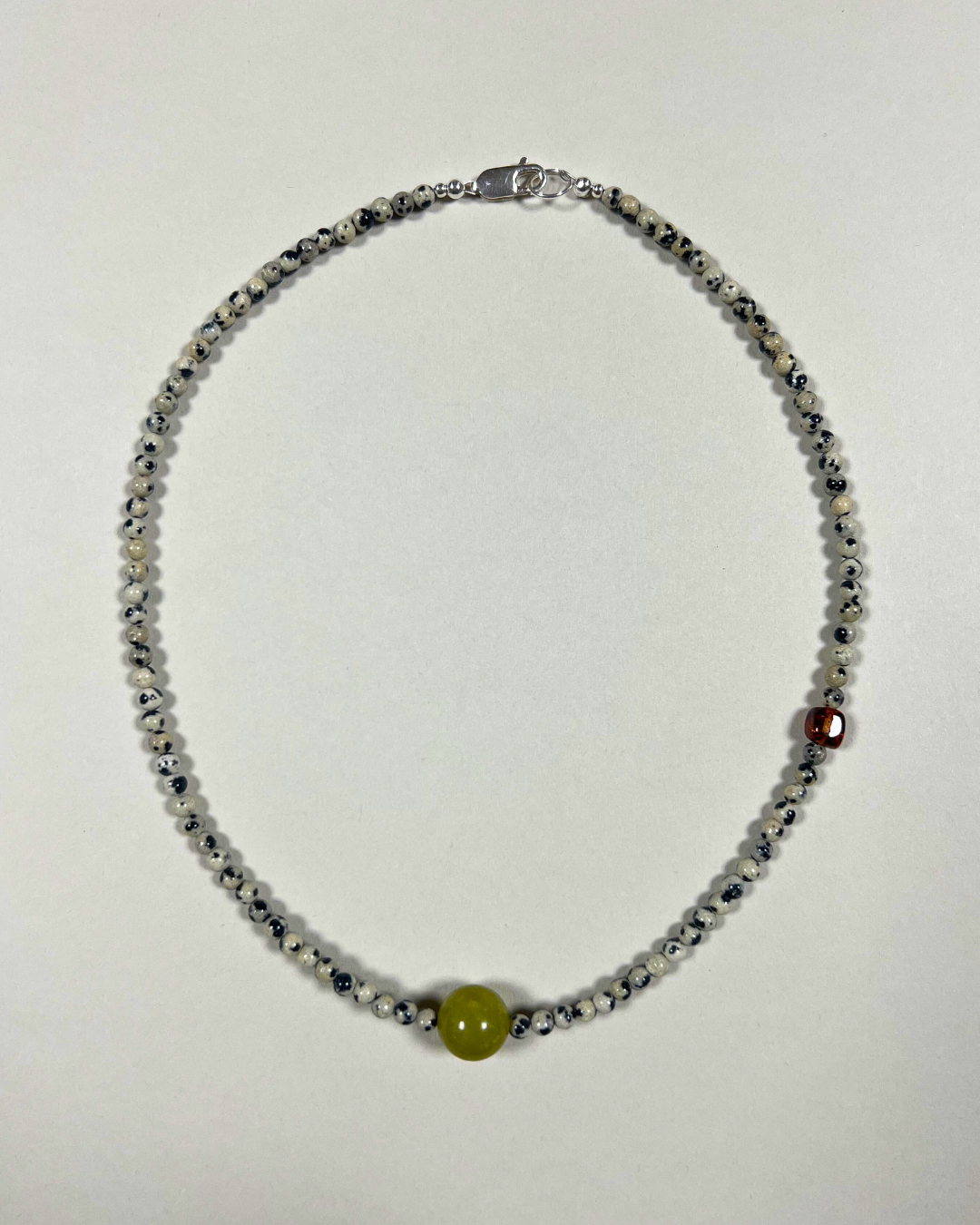 A one-of-a-kind necklace featuring petite 4mm dalmatian jasper beads with a central olive jade sphere and an accent amber nugget. All findings and clasp are sterling silver.