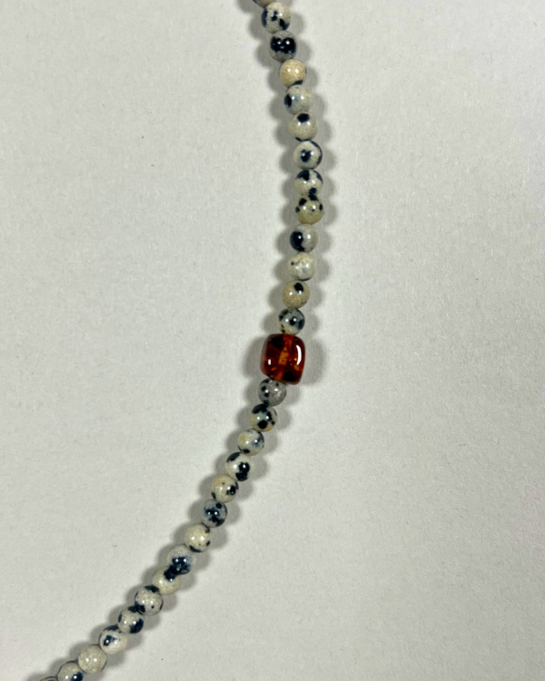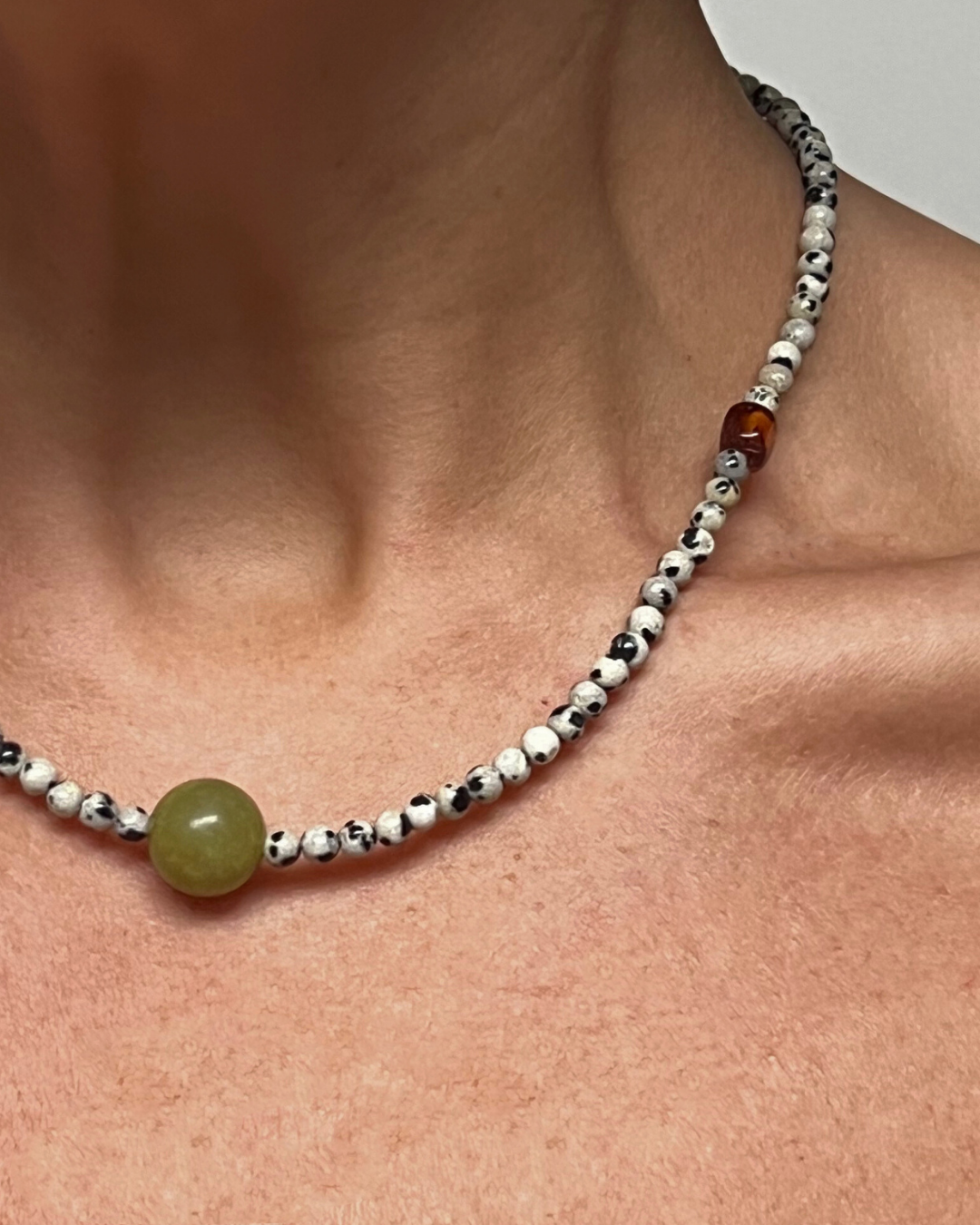 Dalmatian jasper is grounding yet playful, known to inspire balance and a light-hearted spirit. Olive jade adds harmony and renewal, while amber brings warmth and gentle vitality. Together, they create a piece that feels earthy, joyful, and quietly uplifting.