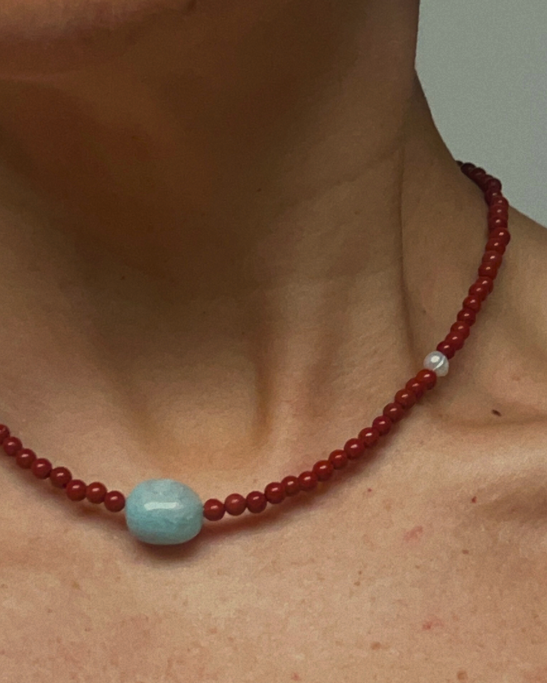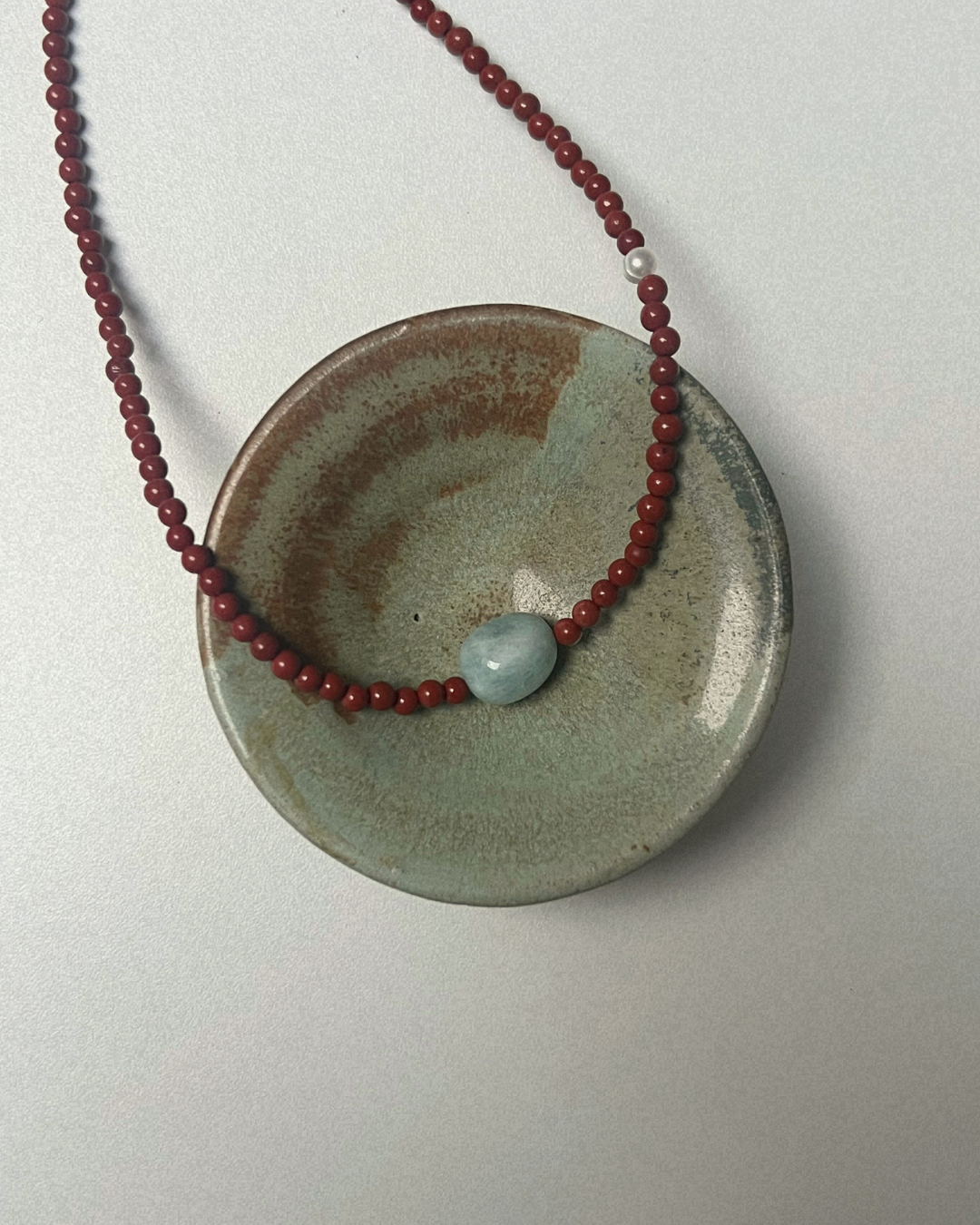 Red jasper brings grounding strength and warmth through its earthy tone, offering steadiness and support. Pale blue beryl adds softness and quiet clarity at the centre, with the freshwater pearl introducing a gentle luminosity. Together, the piece feels balanced, calm, and reassuringly held.