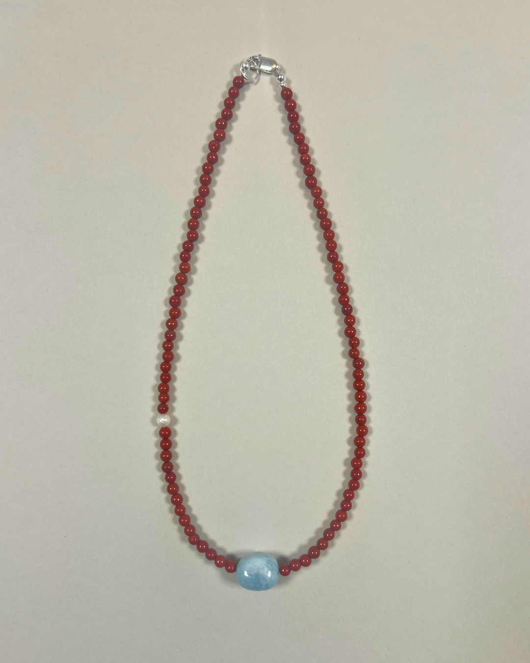 A one-of-a-kind necklace featuring 4 mm red jasper beads with a central pale blue beryl and an accent petite freshwater pearl. All findings and clasp are sterling silver.