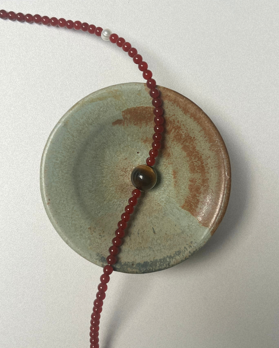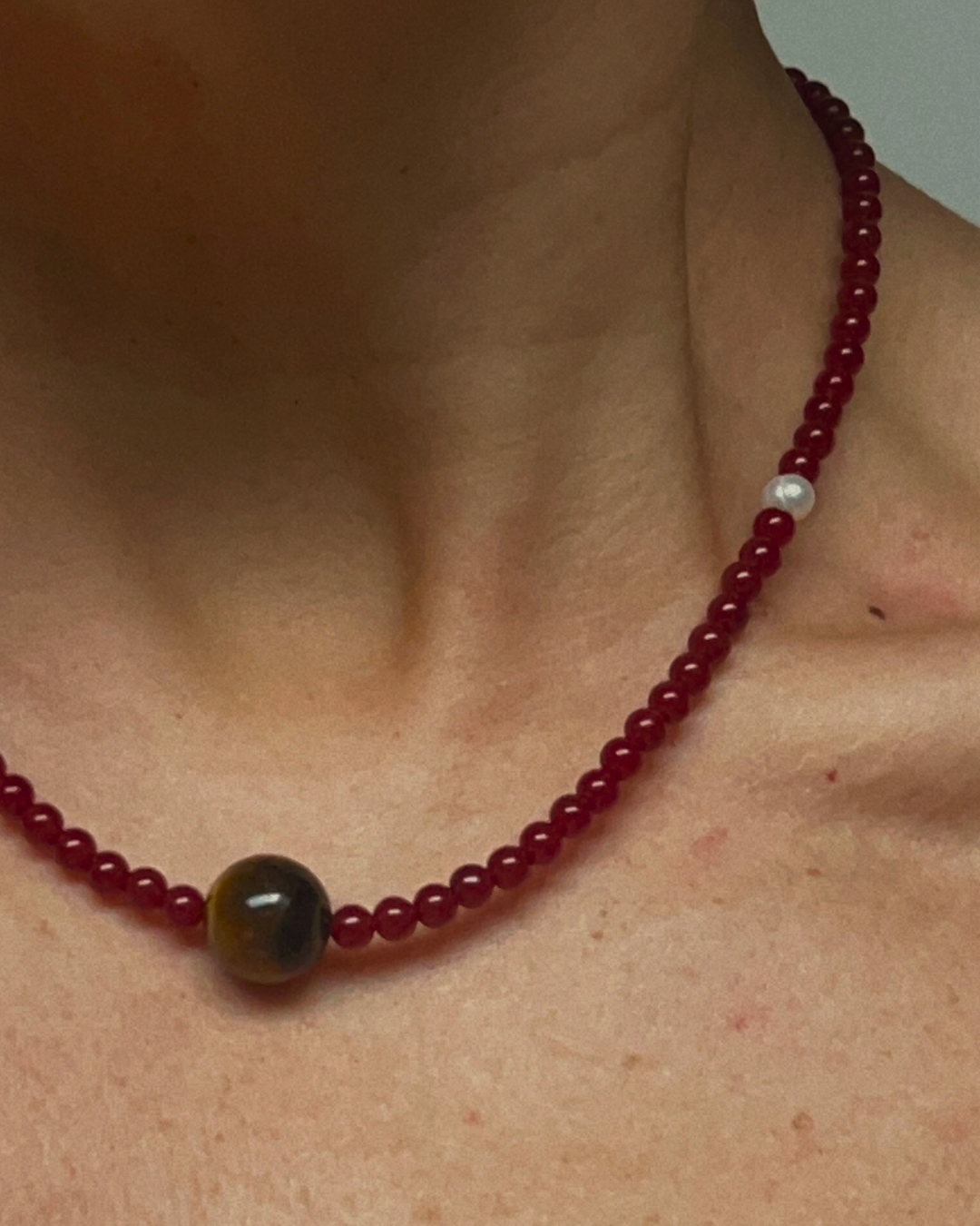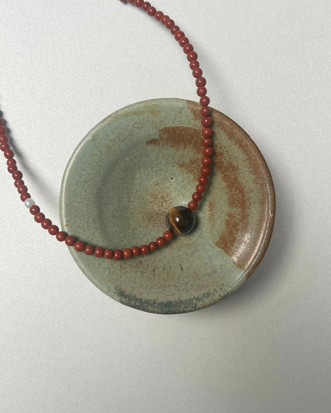 Red jasper brings grounding strength and earthy warmth, offering steadiness and support. Tiger eye adds depth and quiet confidence through its golden sheen, while the freshwater pearl softens the composition with a gentle luminosity. Together, the piece feels balanced, reassuring, and calmly held.
