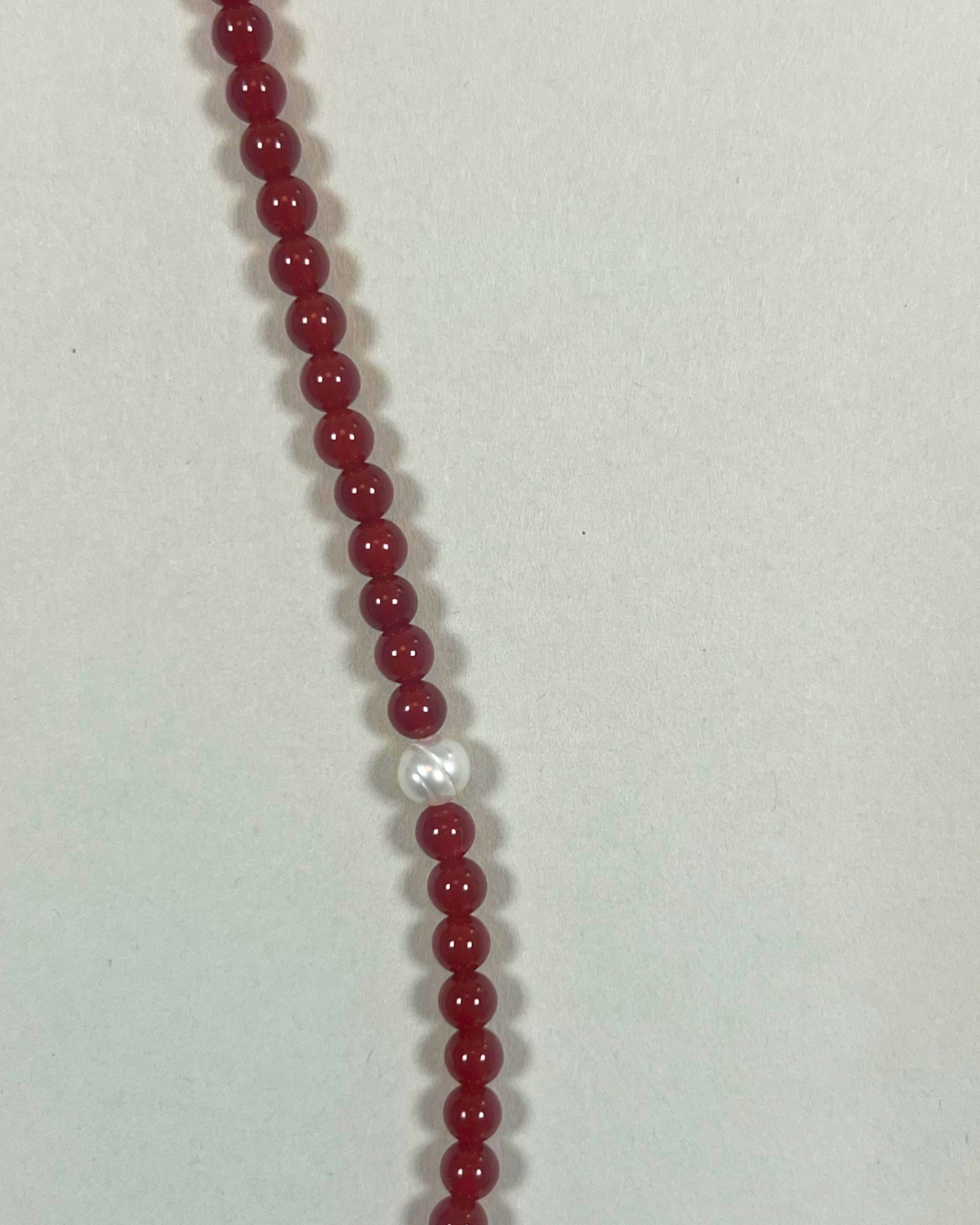 A one-of-a-kind necklace featuring 4 mm red jasper beads with a central tiger eye sphere and an accent petite freshwater pearl. All findings and clasp are sterling silver.