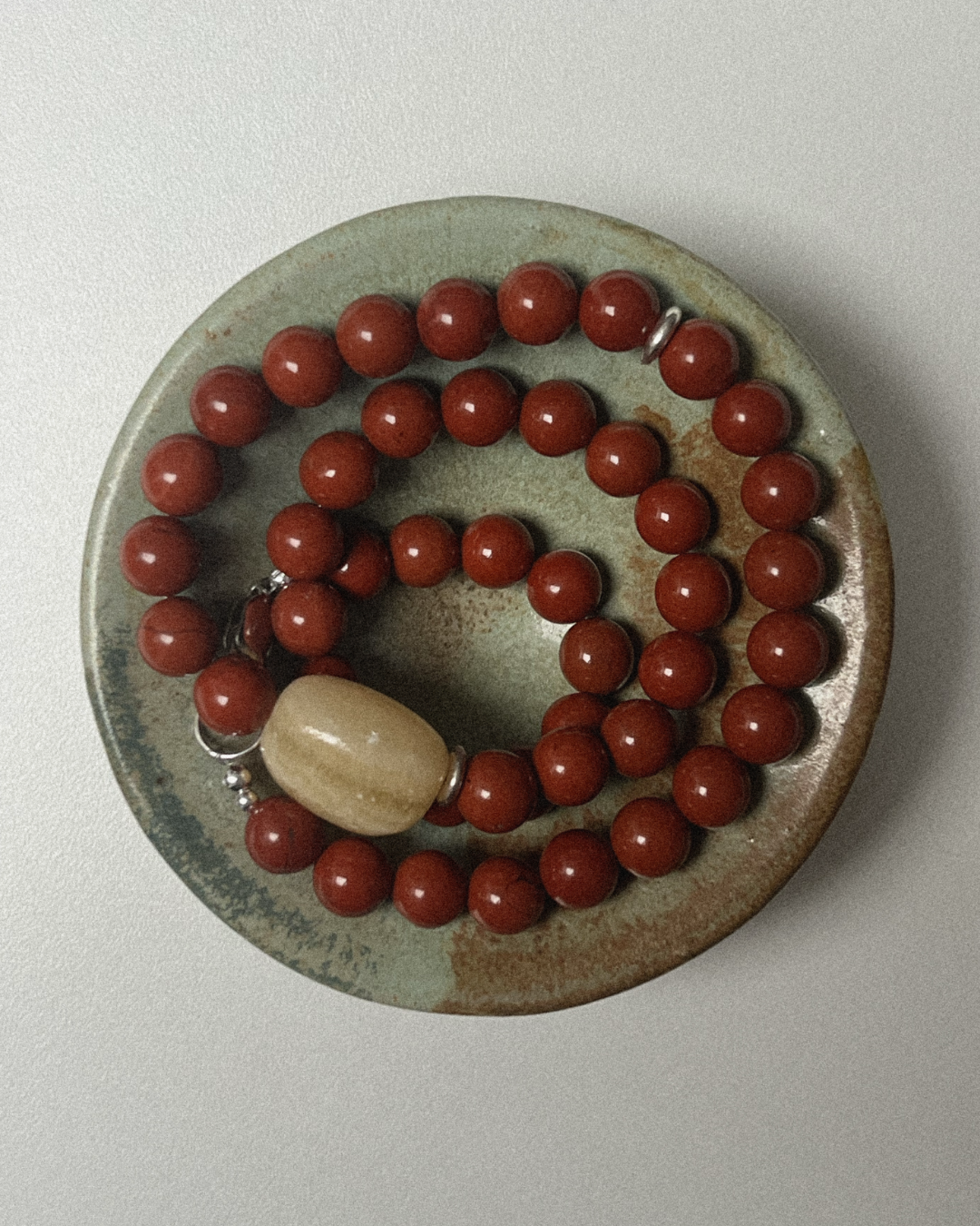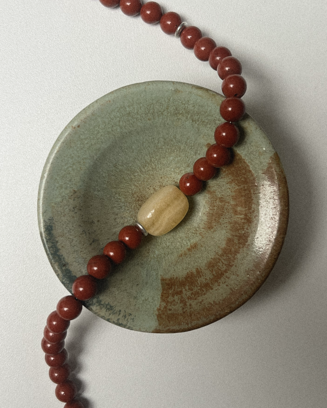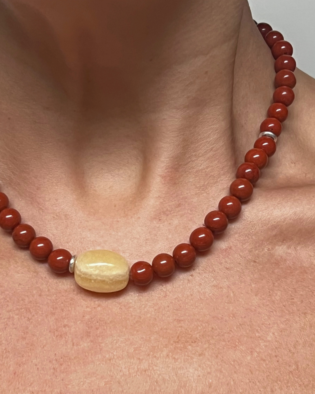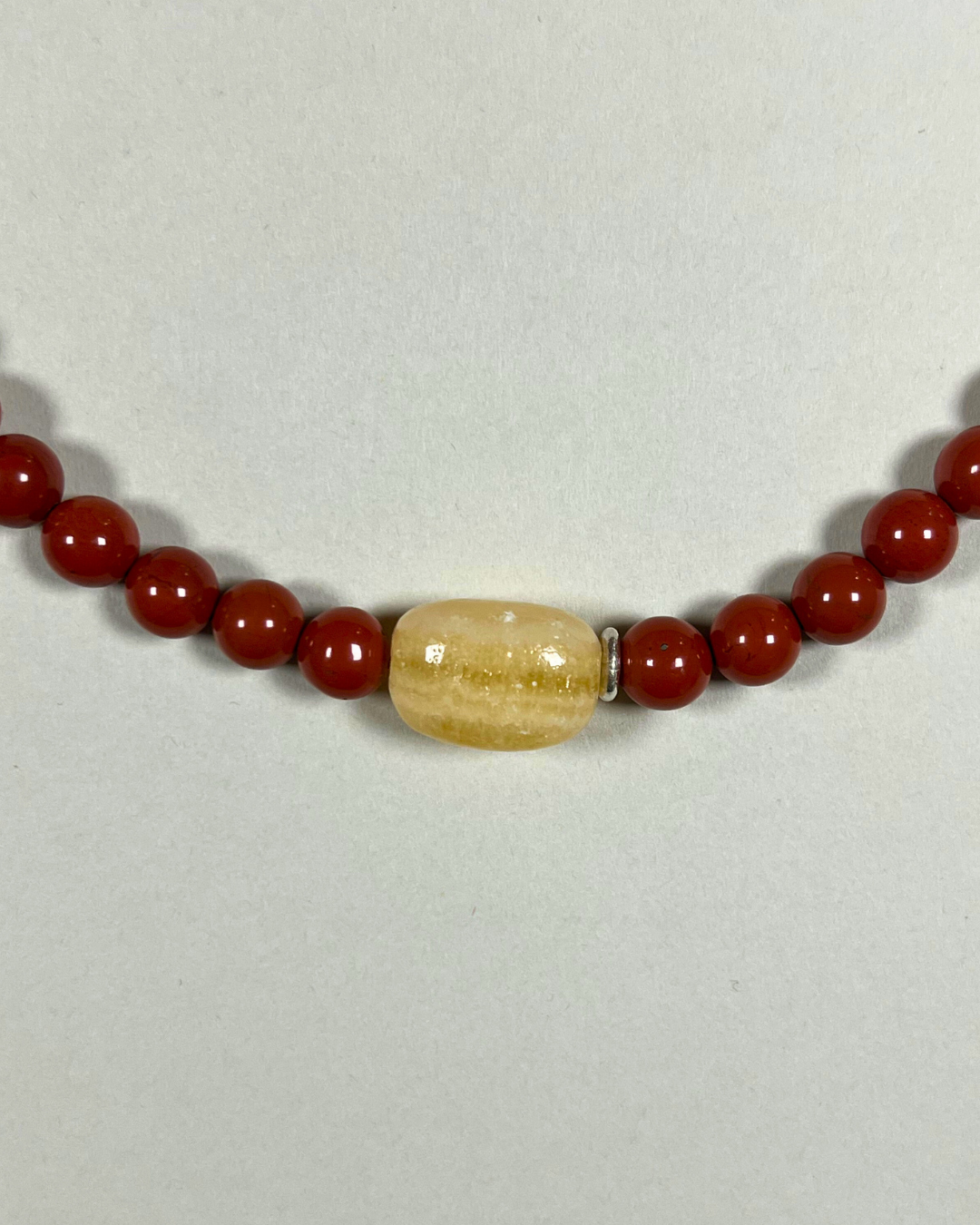 A one-of-a-kind necklace featuring 8mm red jasper beads, hand-strung and finished with sterling silver findings and clasp. At its centre sits a smooth yellow calcite bead, framed by two fine silver stud beads - a warm, radiant combination of earthy red and soft golden tones.