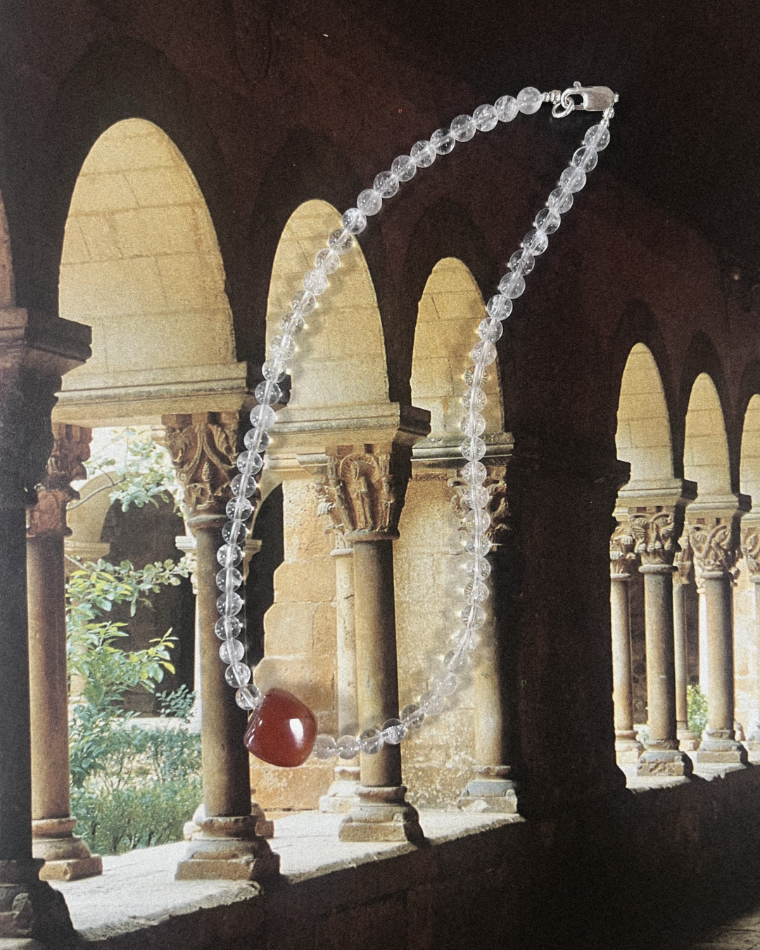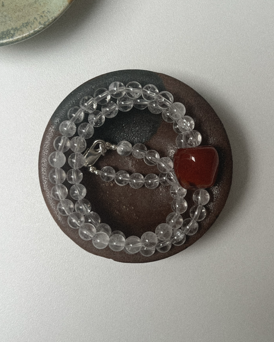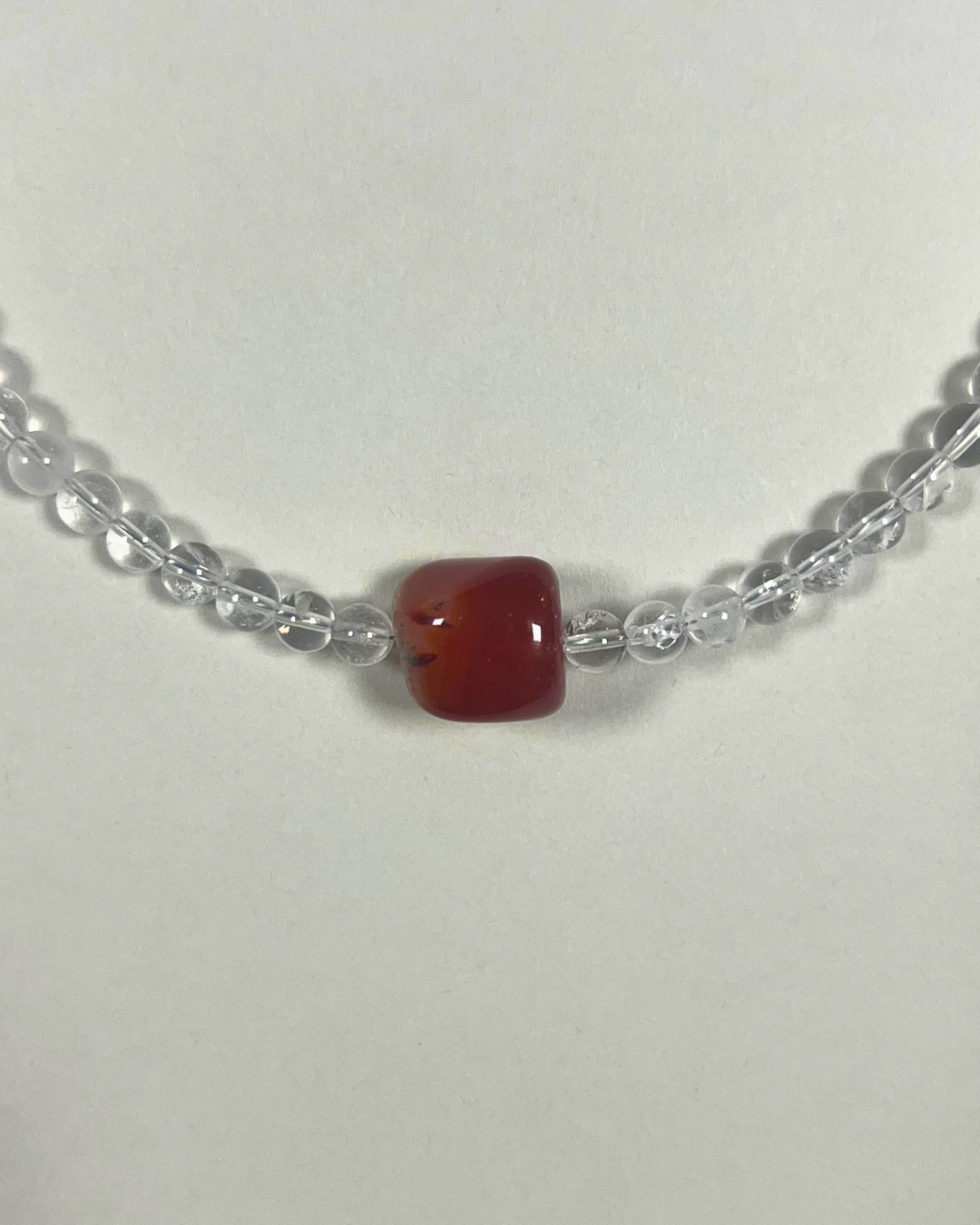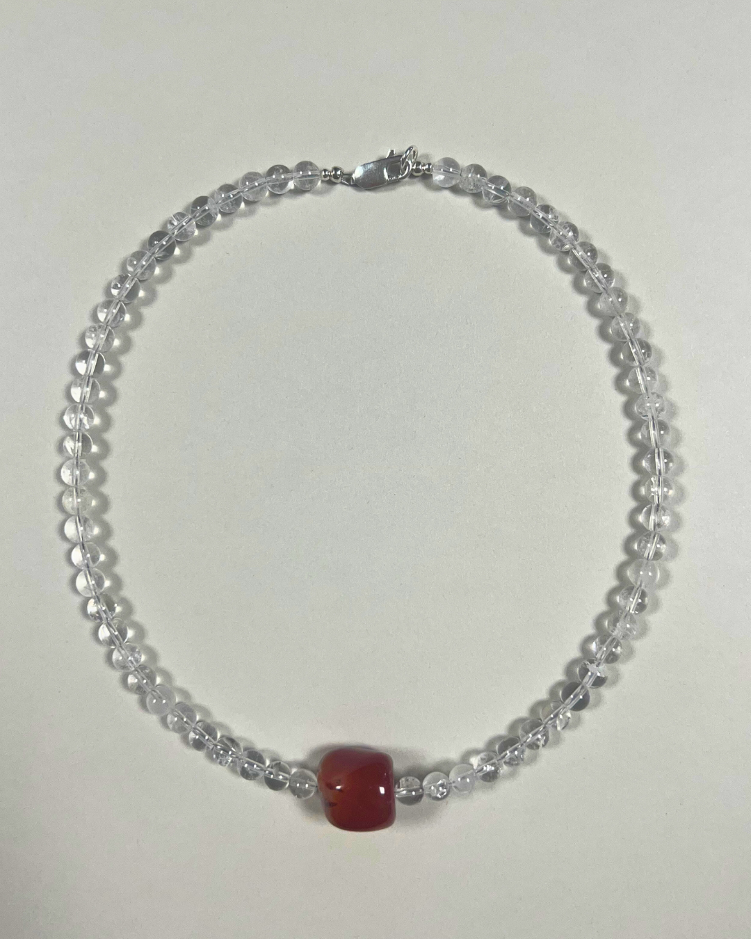 A one-of-a-kind necklace featuring clear quartz beads, hand-strung and finished with sterling silver findings and clasp. At its centre sits a striking deep red carnelian bead - a bold, grounding focal point that contrasts beautifully with the clarity and lightness of the quartz.