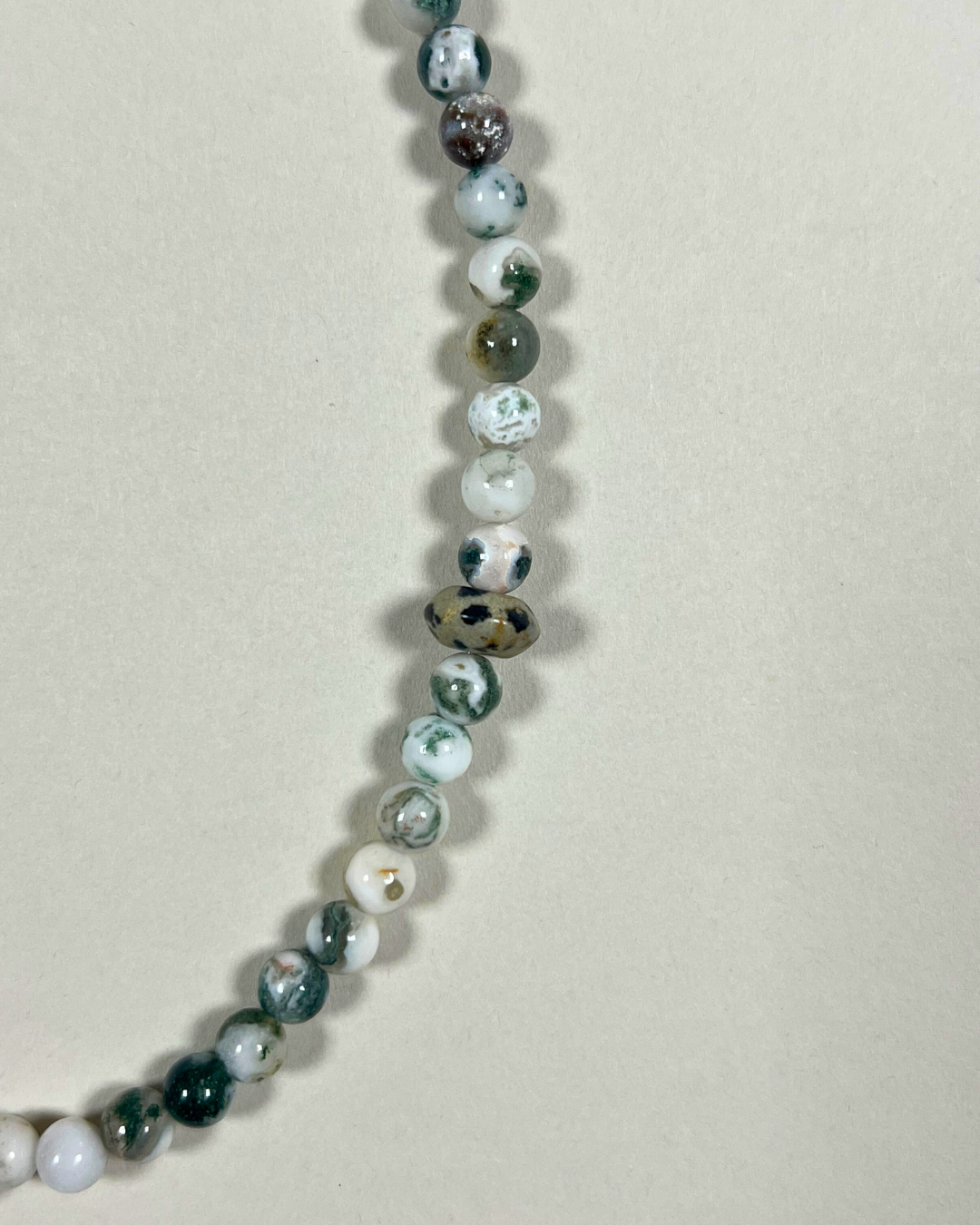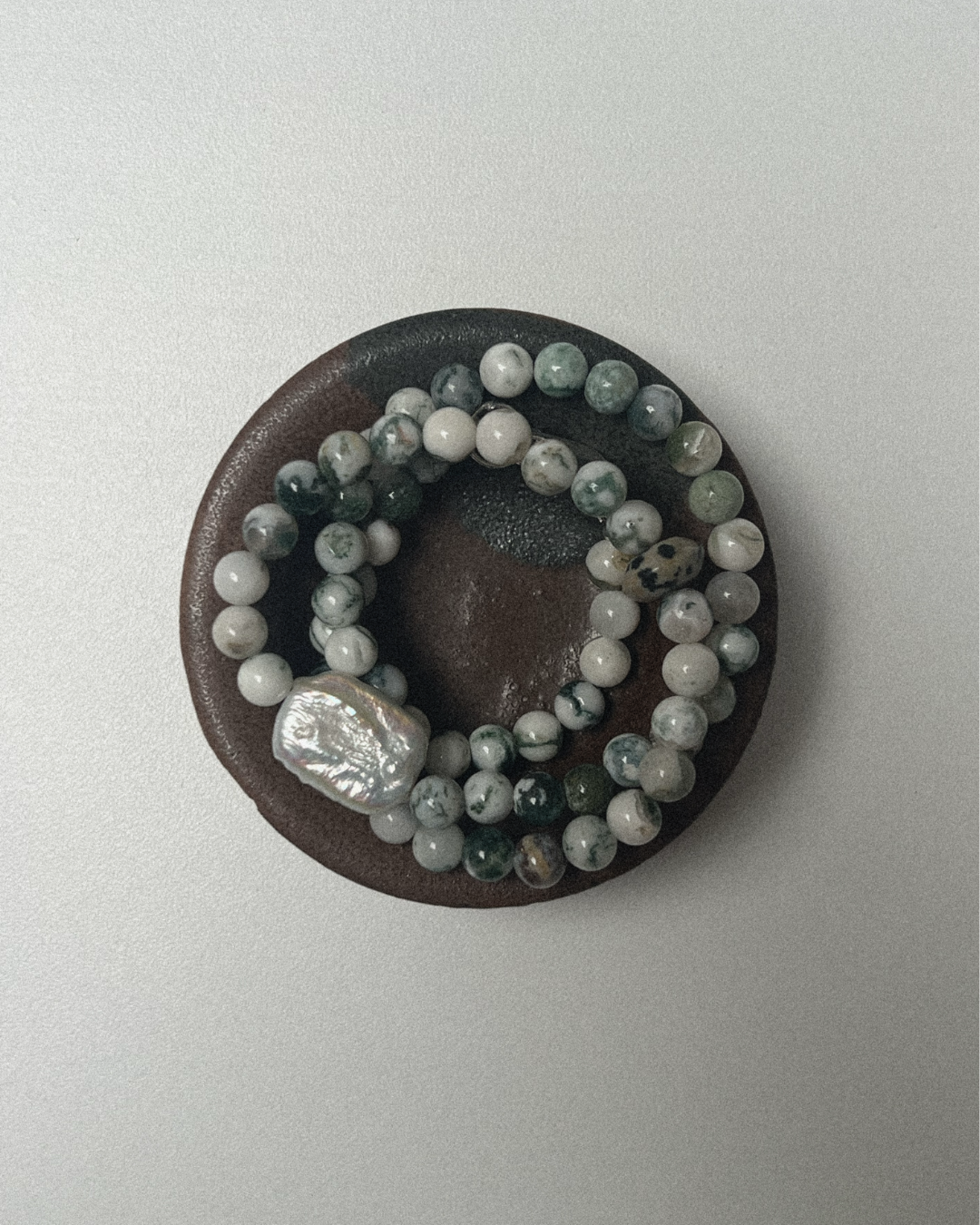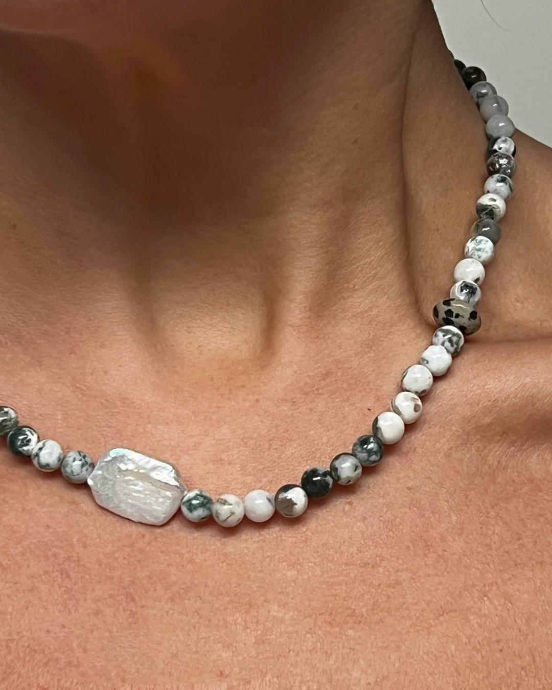 Tree agate carries a gentle, grounding energy - often associated with growth, stability, and connection to nature. The freshwater pearl adds softness and reflection, while dalmatian jasper brings a playful, balancing note. Together, they create a piece that feels harmonious, earthy, and quietly nurturing.