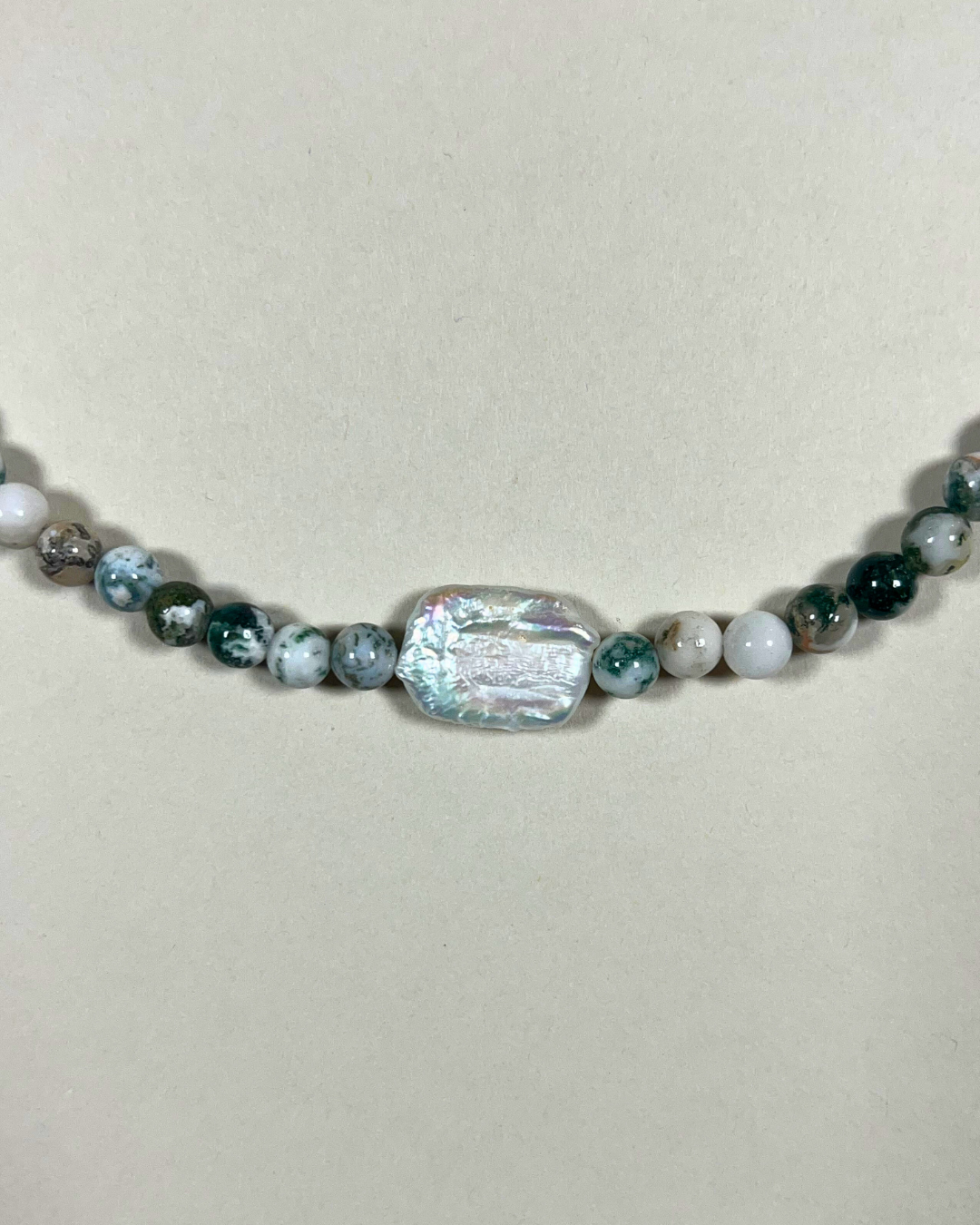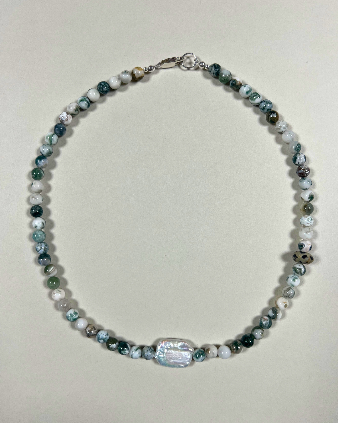A one-of-a-kind necklace featuring 6mm tree agate beads with a central fine rectangular freshwater pearl and an accent dalmatian jasper rondelle. All findings and clasp are sterling silver.