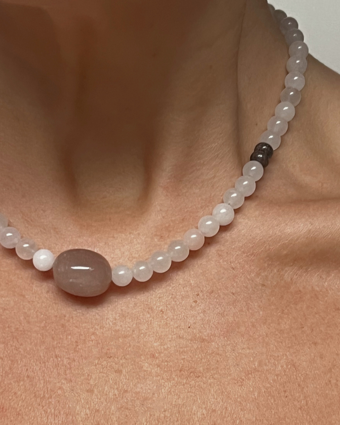 Beryl is associated with calm, balance, and gentle protection, bringing a soothing, steadying presence. Moonstone is linked to intuition, flow, and emotional healing, while bronzite offers stability, strength, and grounding. Together, they create a piece that feels soft yet steady - luminous, nurturing, and quietly balanced.