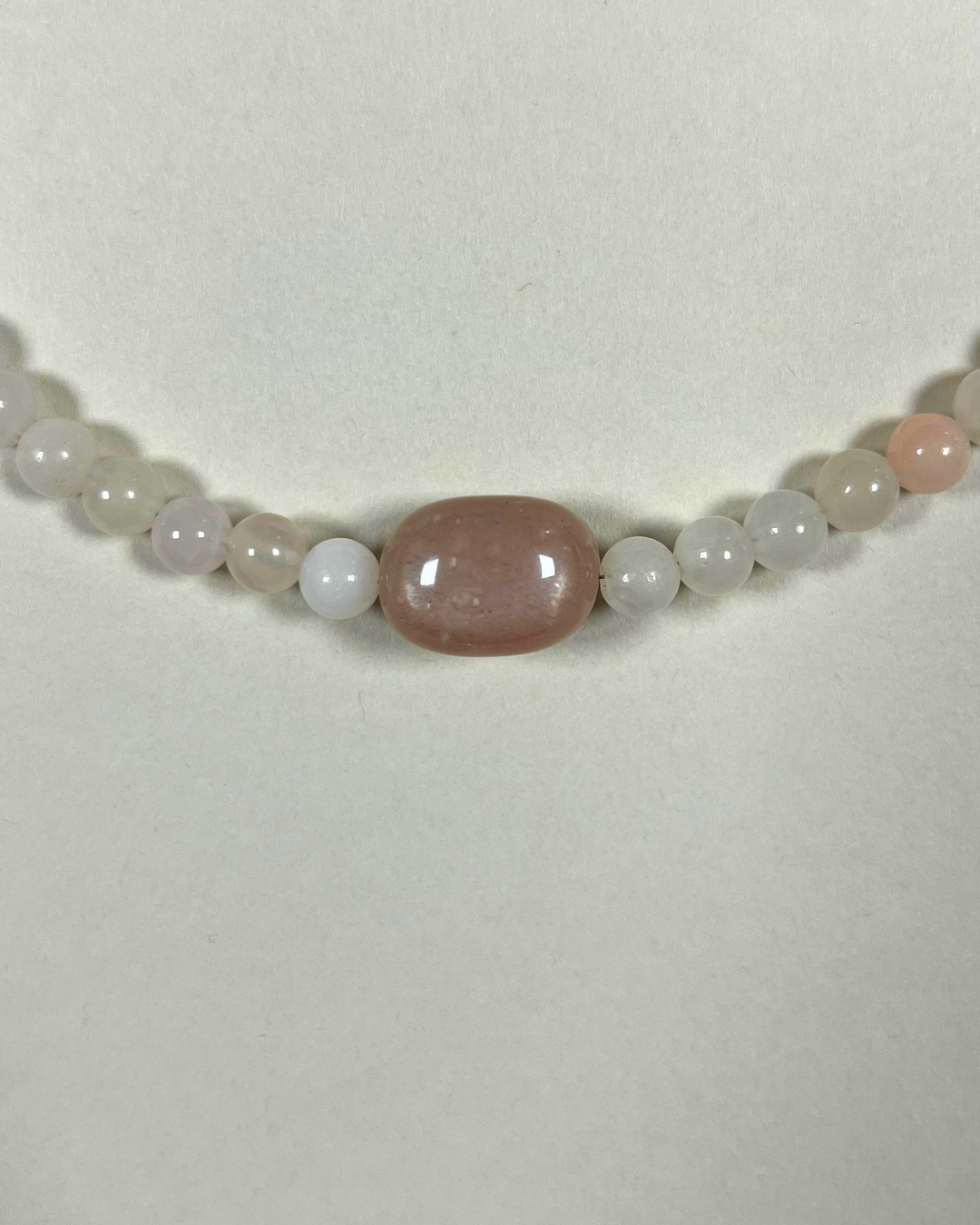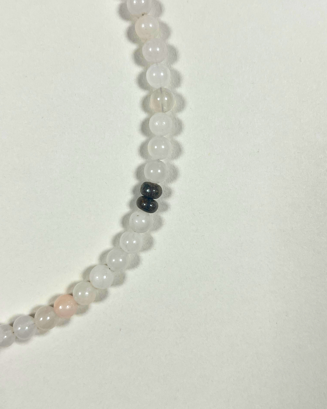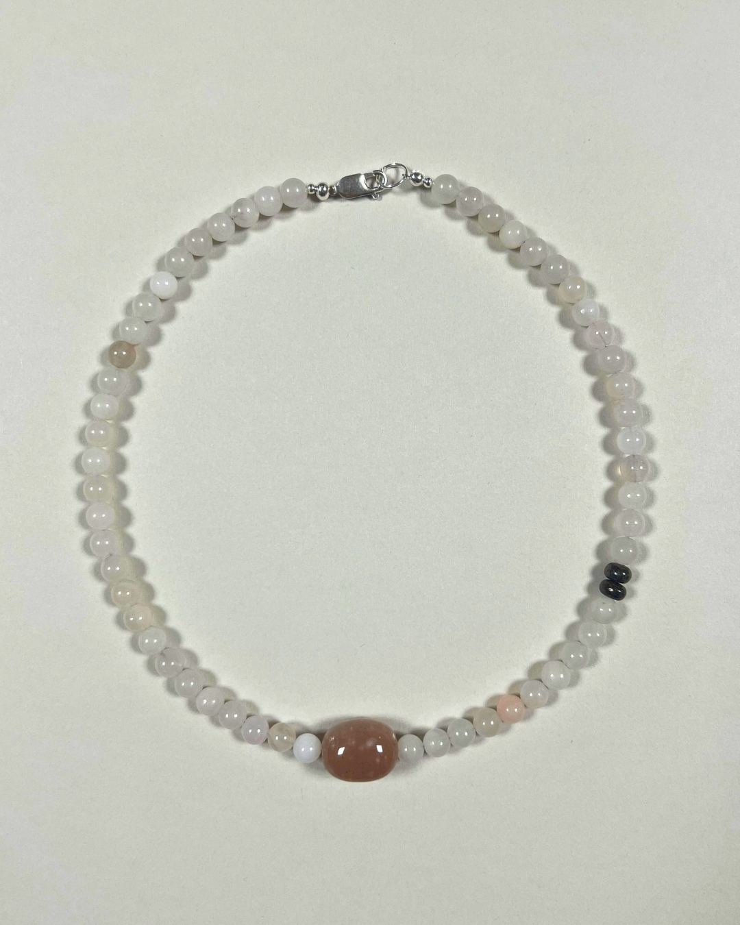 A one-of-a-kind necklace featuring creamy-pale off-white beryl beads, hand-strung and finished with sterling silver findings and clasp. At its centre sits a shimmery peach moonstone, paired with a stacked bronzite rondelle - a warm, grounding detail against the softness of the beryl.