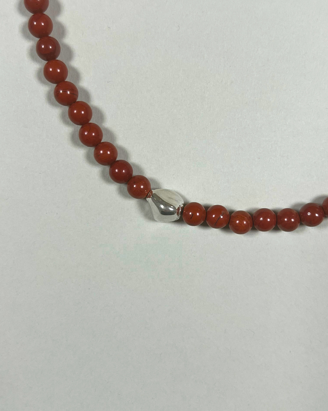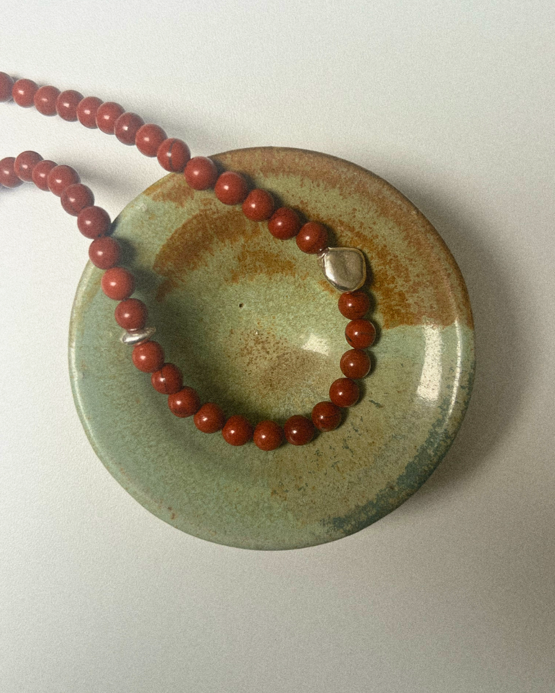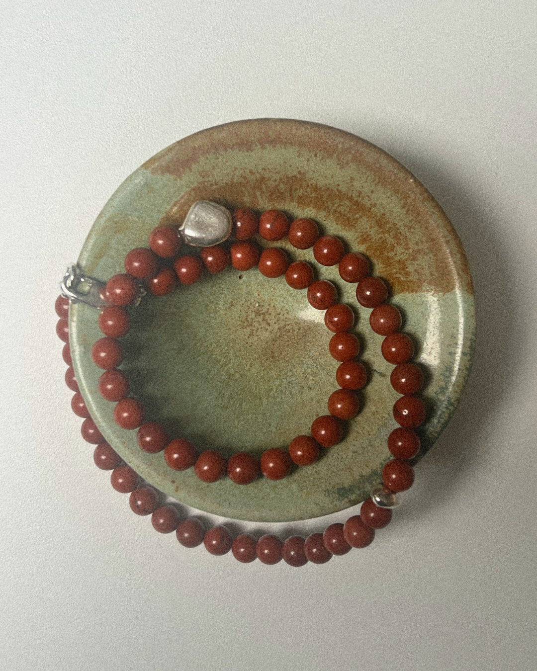 Red jasper is linked to grounding, vitality, and resilience, offering a steady, stabilising energy. Silver brings balance and reflection, softening the strand with subtle light. Together, they create a piece that feels earthy yet balanced - grounding, strong, and quietly radiant.