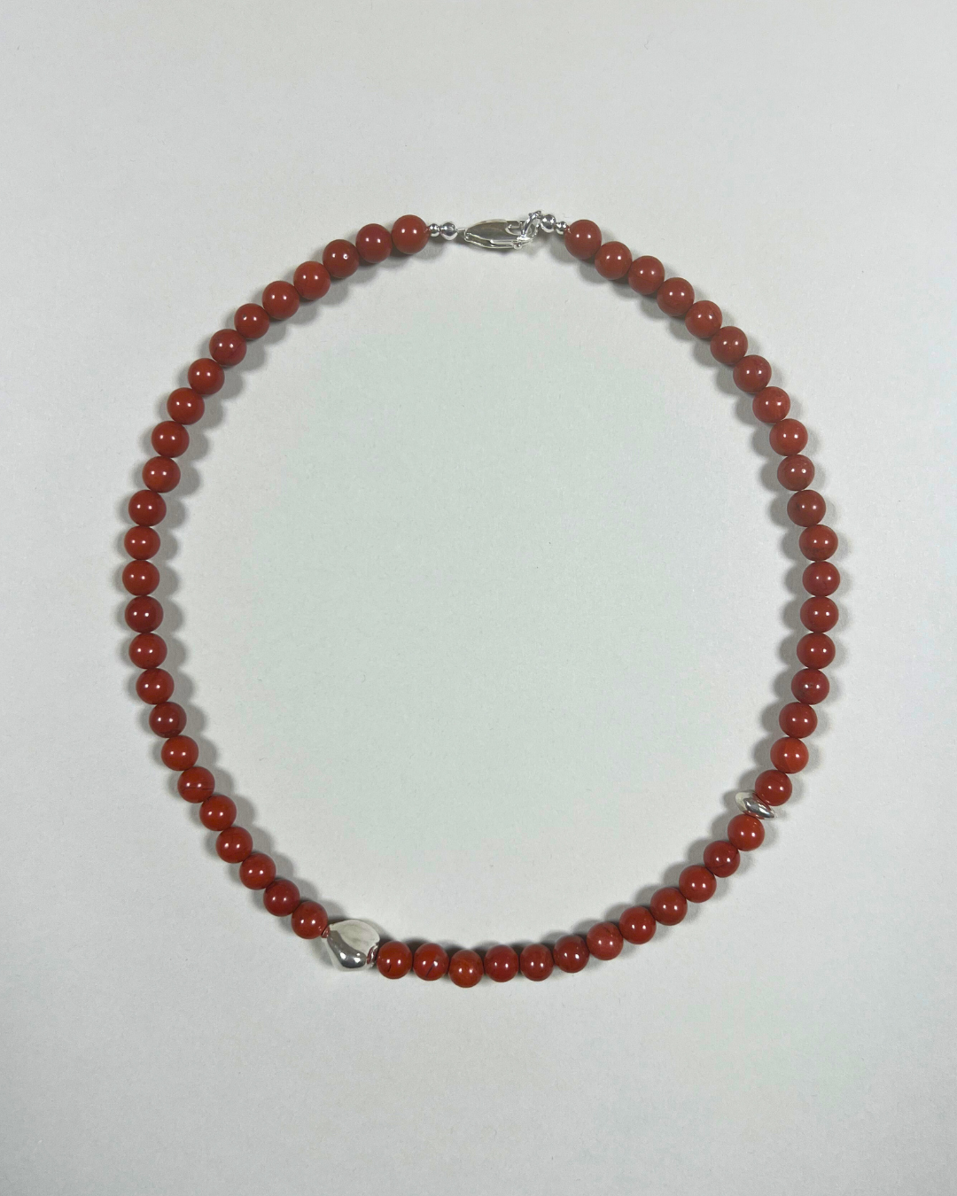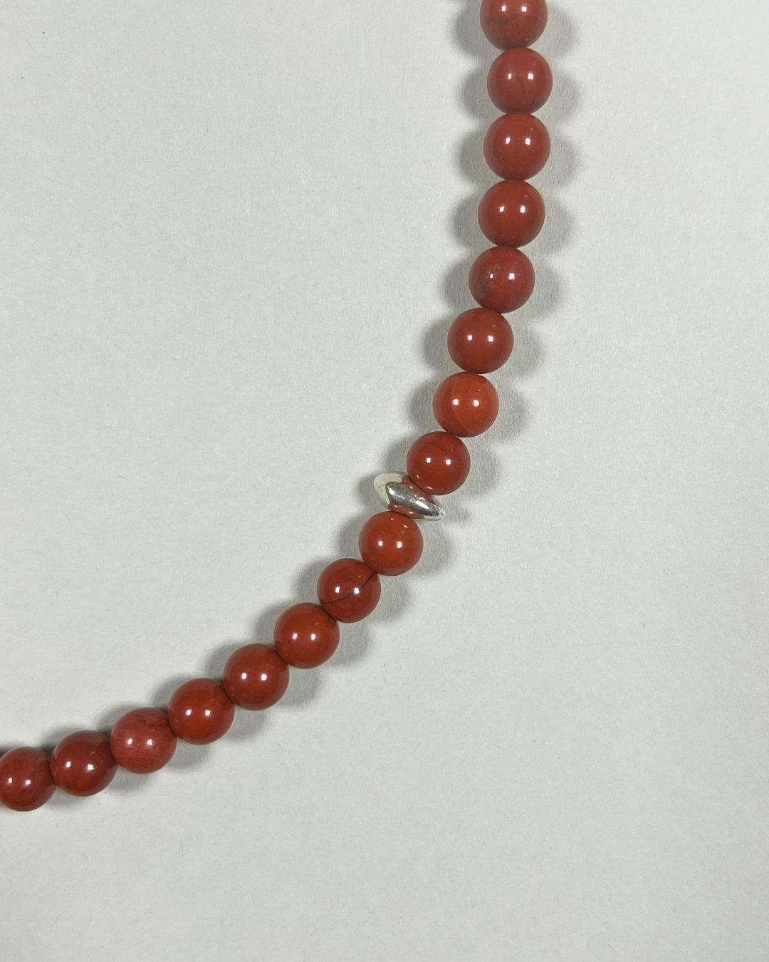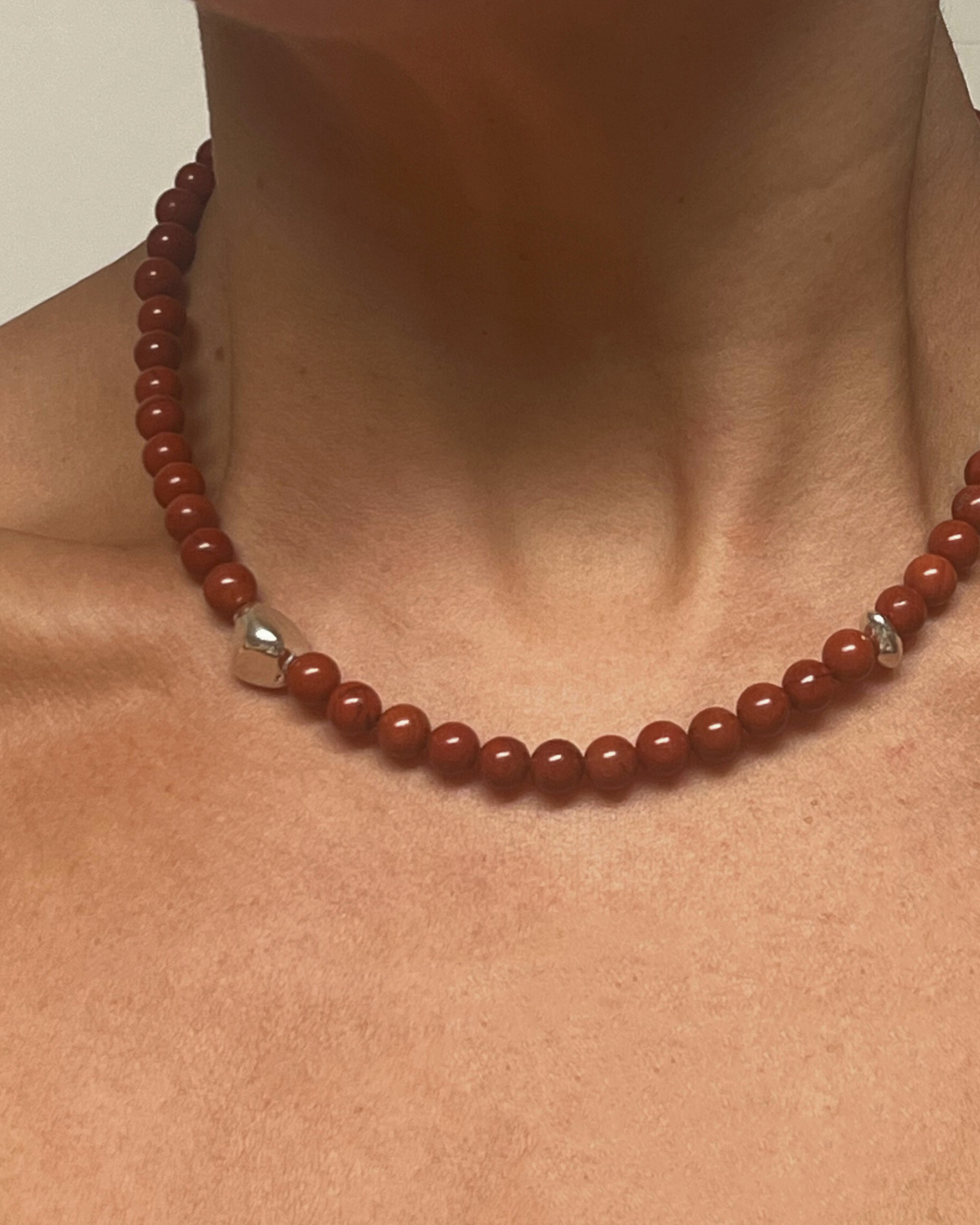 Red jasper is linked to grounding, vitality, and resilience, offering a steady, stabilising energy. Silver brings balance and reflection, softening the strand with subtle light. Together, they create a piece that feels earthy yet balanced - grounding, strong, and quietly radiant.