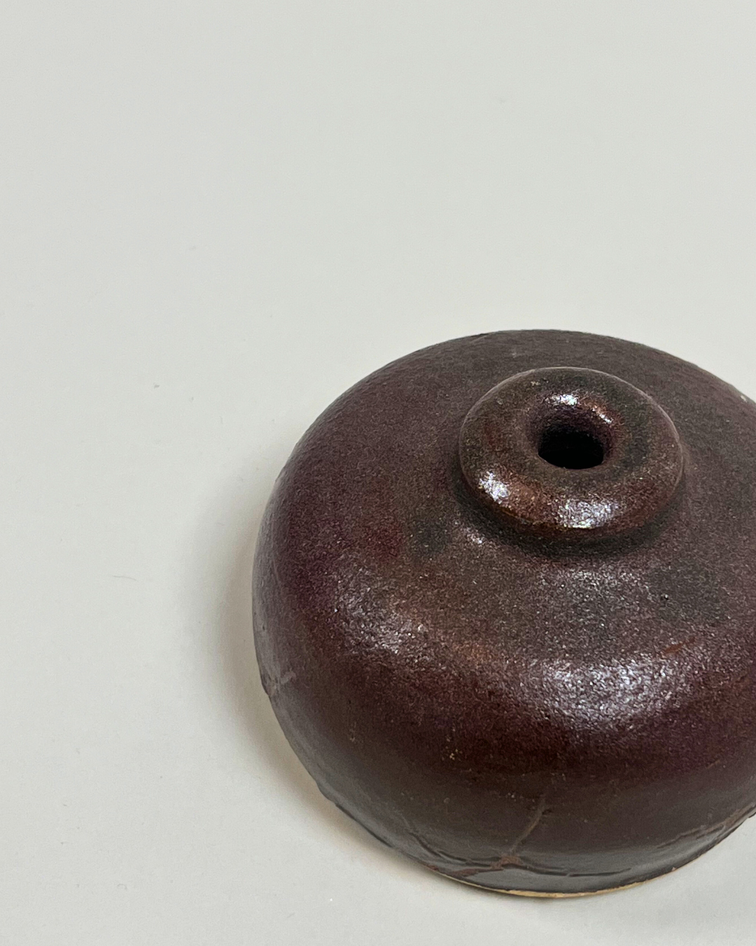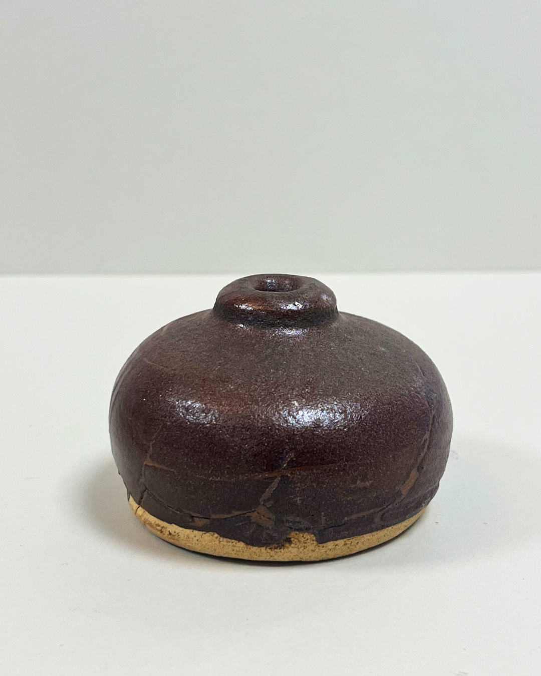 A small, flat studio pottery bud vase in a deep oxblood glaze, graduating into a darker, almost blackened base. The rounded, low silhouette and narrow neck opening give it a grounded, sculptural feel, even when holding just a single stem.