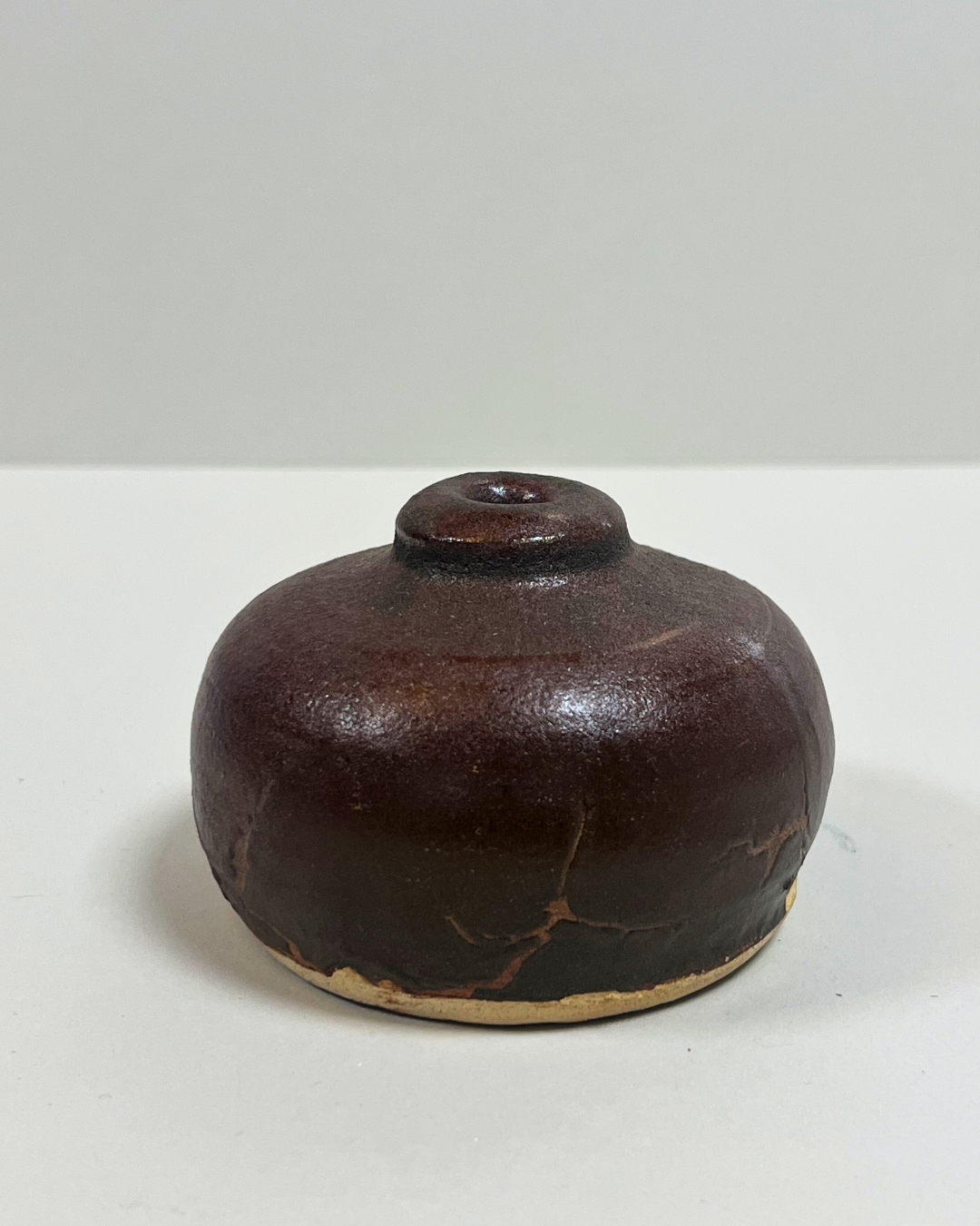 The glaze has a soft sheen with subtle variation across the surface, pooling slightly around the shoulder and settling darker towards the base. The exposed foot ring reveals the warm, sandy clay beneath, adding contrast and texture.