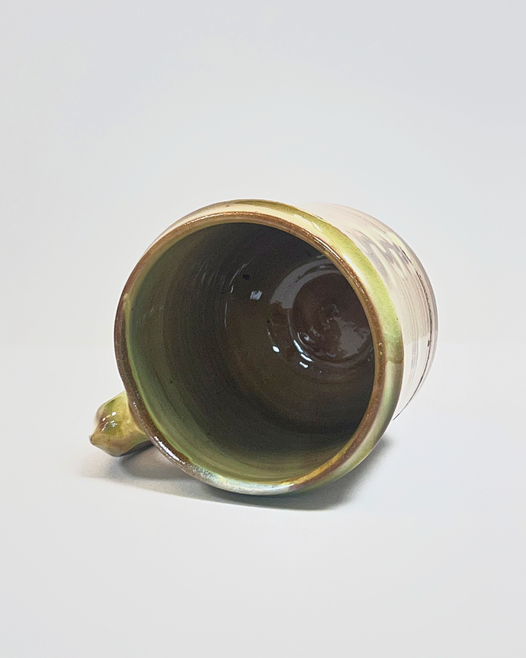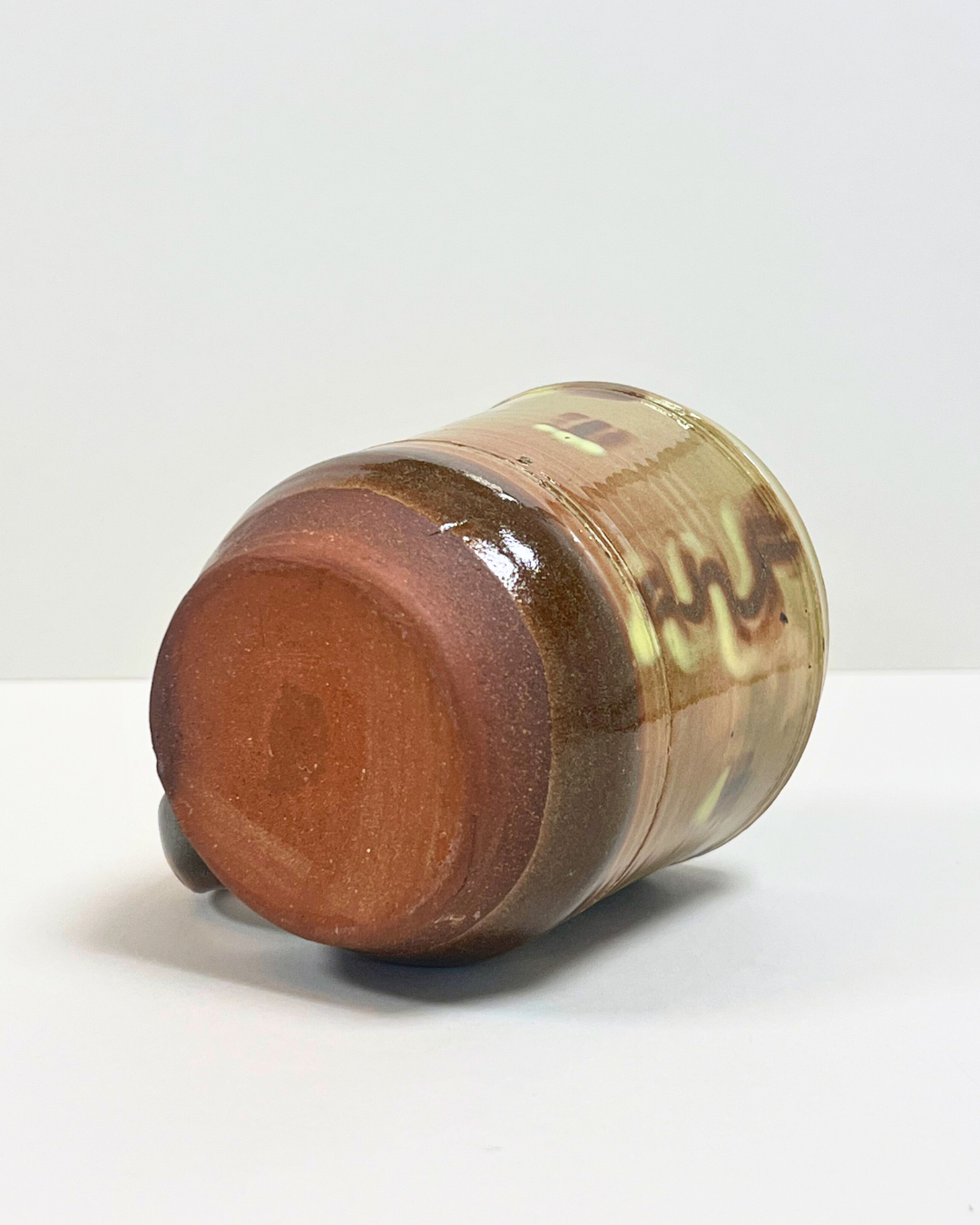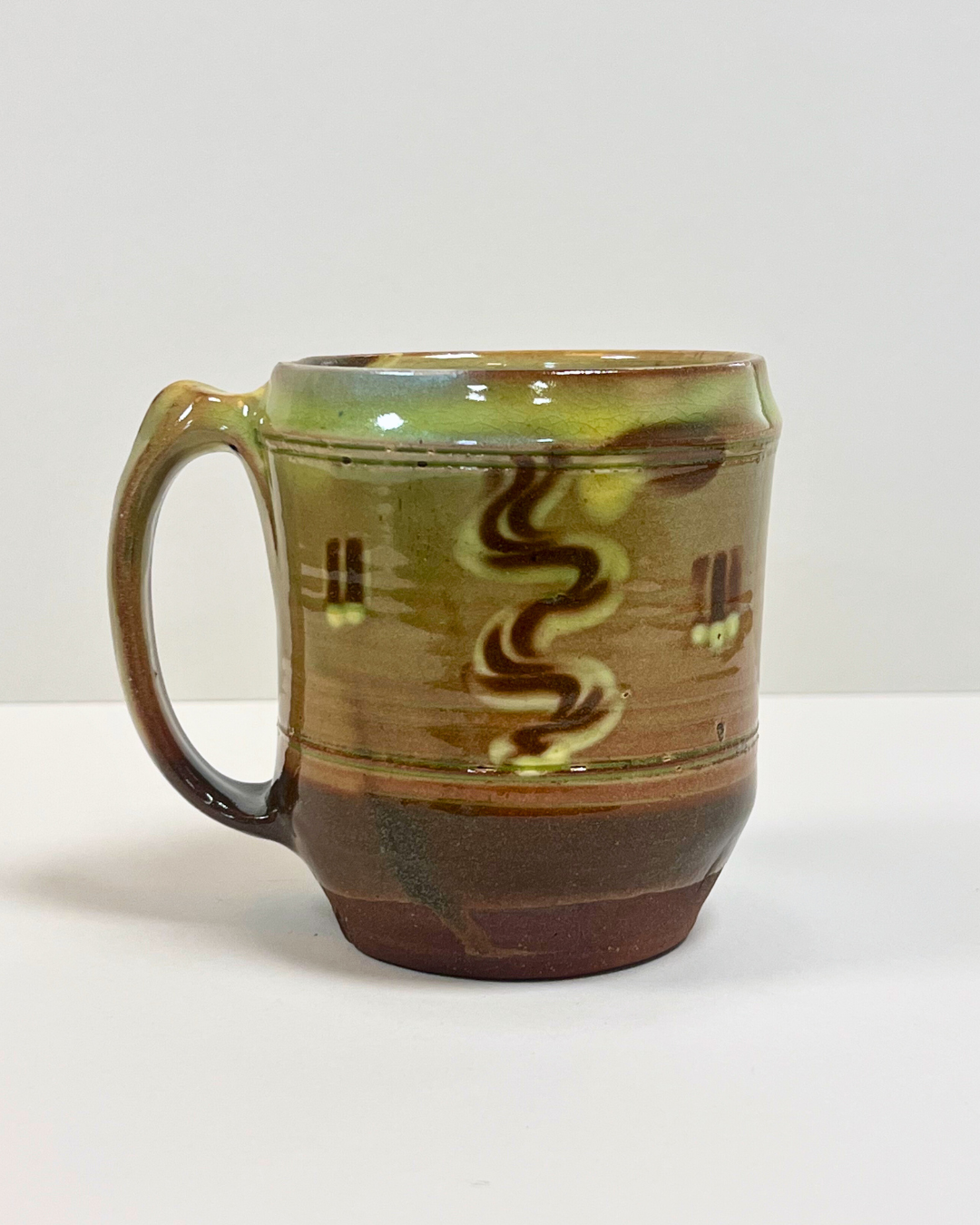 A vintage studio pottery cup in earthy brown and olive tones with an abstract, flowing glaze pattern. Gloss finish with tonal variation throughout and a darker clay base.