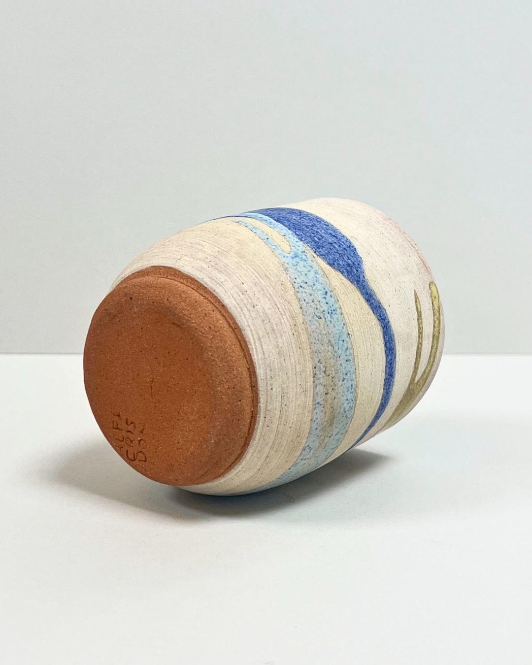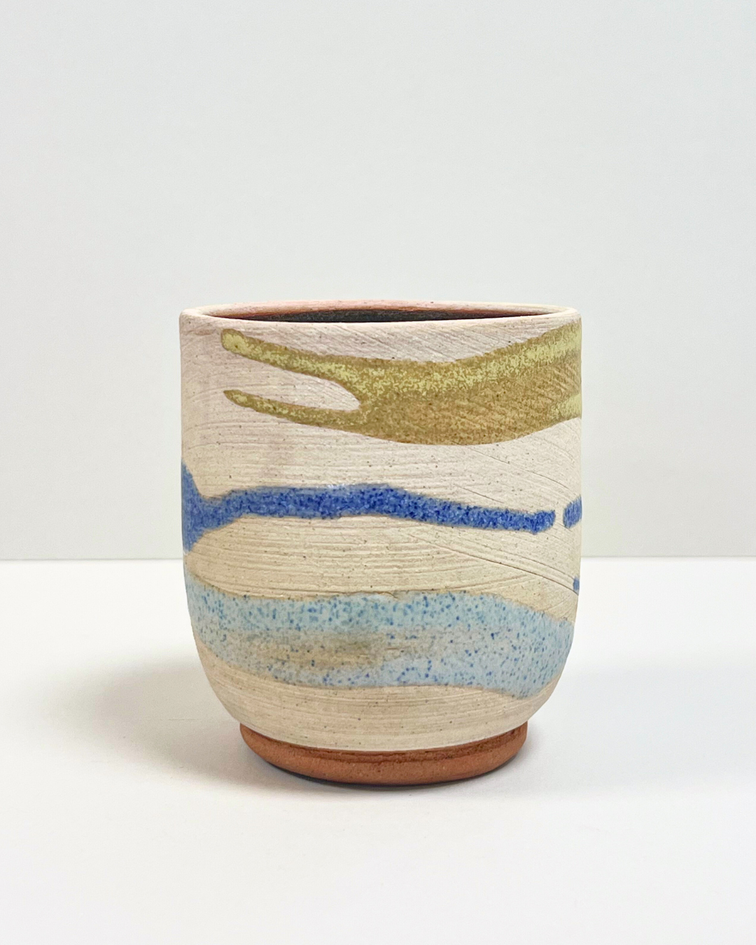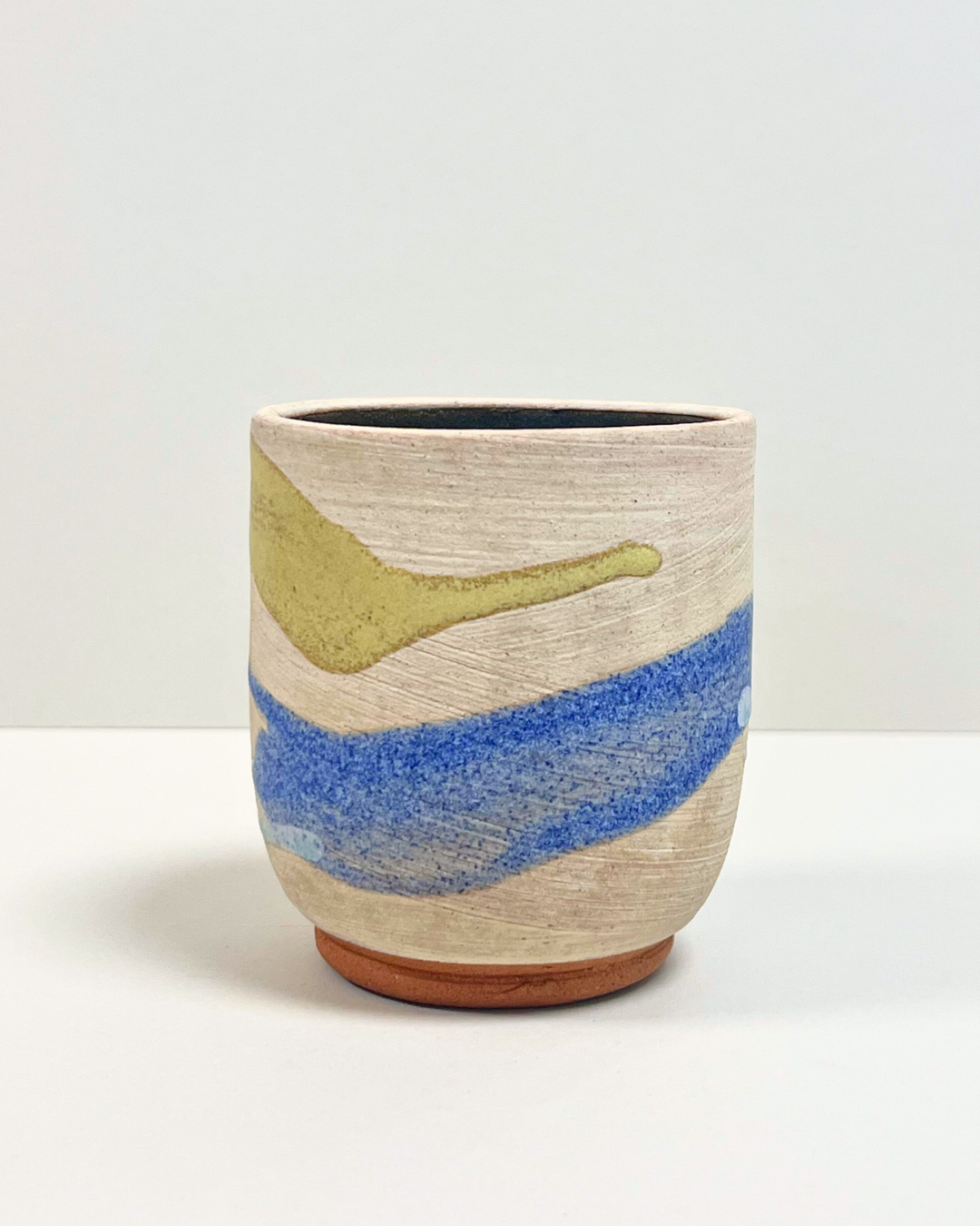 A vintage studio pottery cup with layered glaze detailing in yellow and blue over a textured, off-white clay body. Brush-like bands wrap around the form, with a warm terracotta foot.