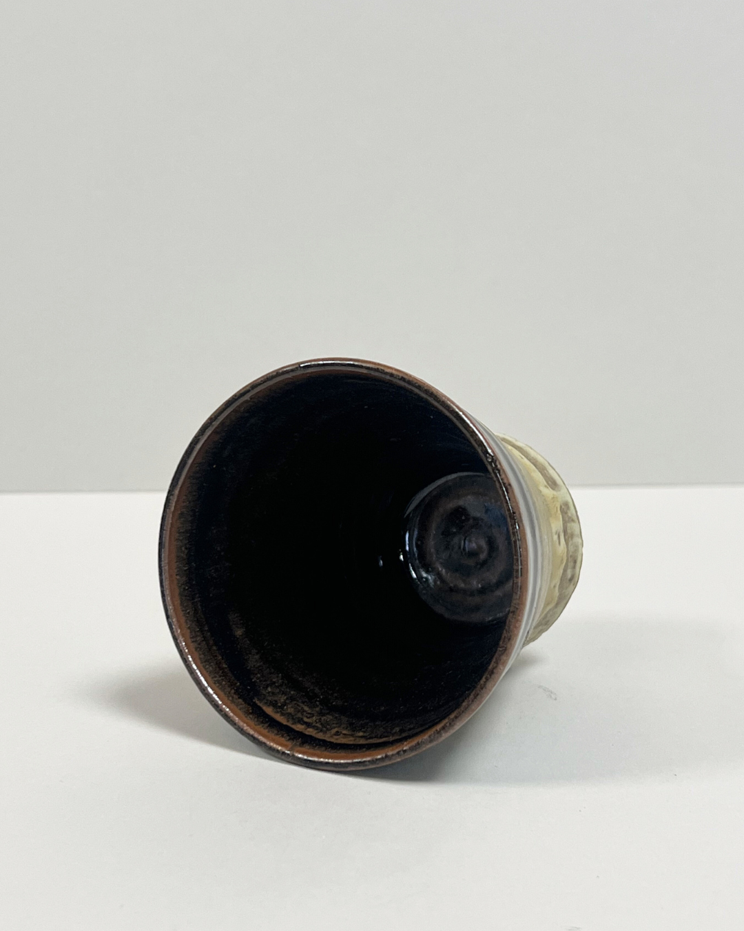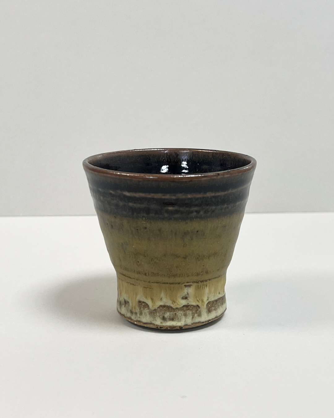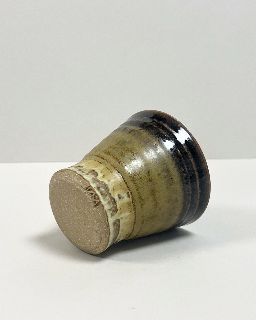 Small handle-less vintage studio pottery cup with a wide, open neck and softly flared form. Glazed in layered tones of deep brown, olive and cream, with natural drips and pooling around the lower edge.