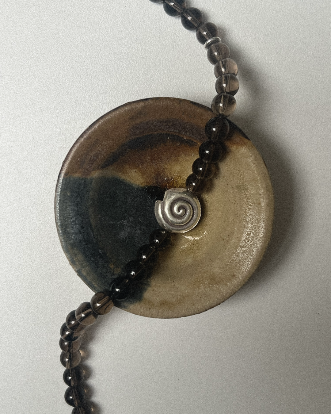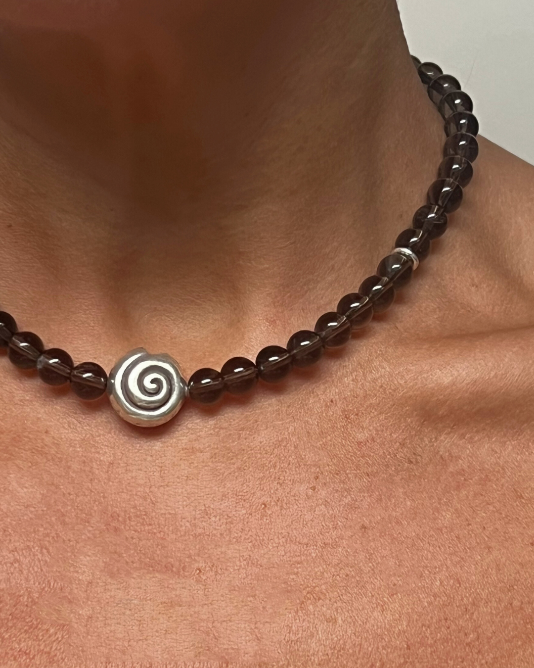 A one-of-a-kind necklace featuring 8mm smoky quartz beads, hand-strung and finished with sterling silver findings and clasp. At its centre sits a large fine silver spiral, accented with a silver stud bead - a bold focal point set against the grounding depth of smoky quartz.