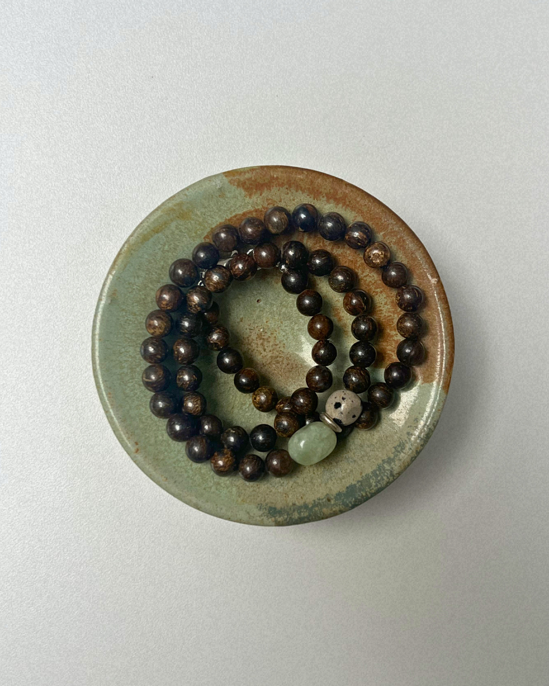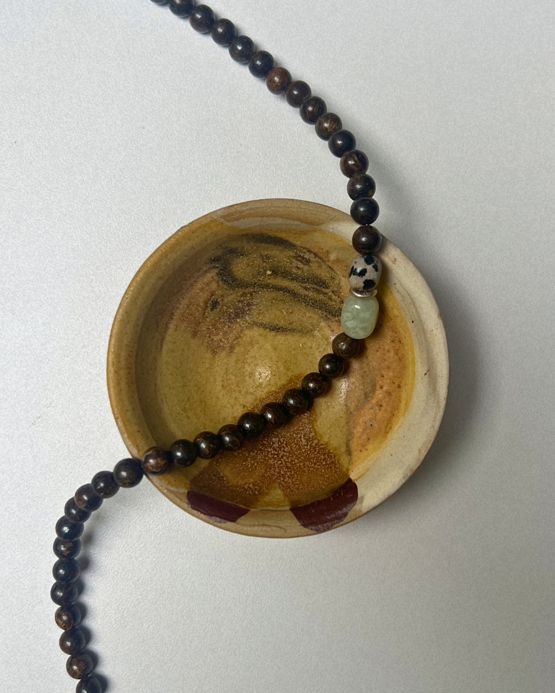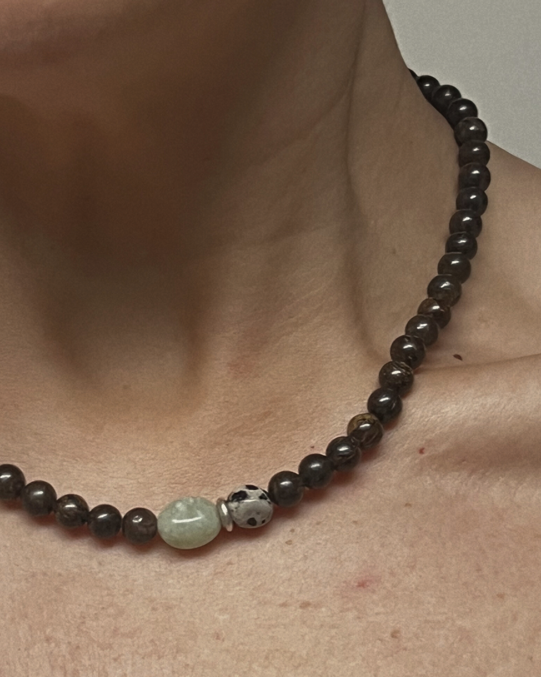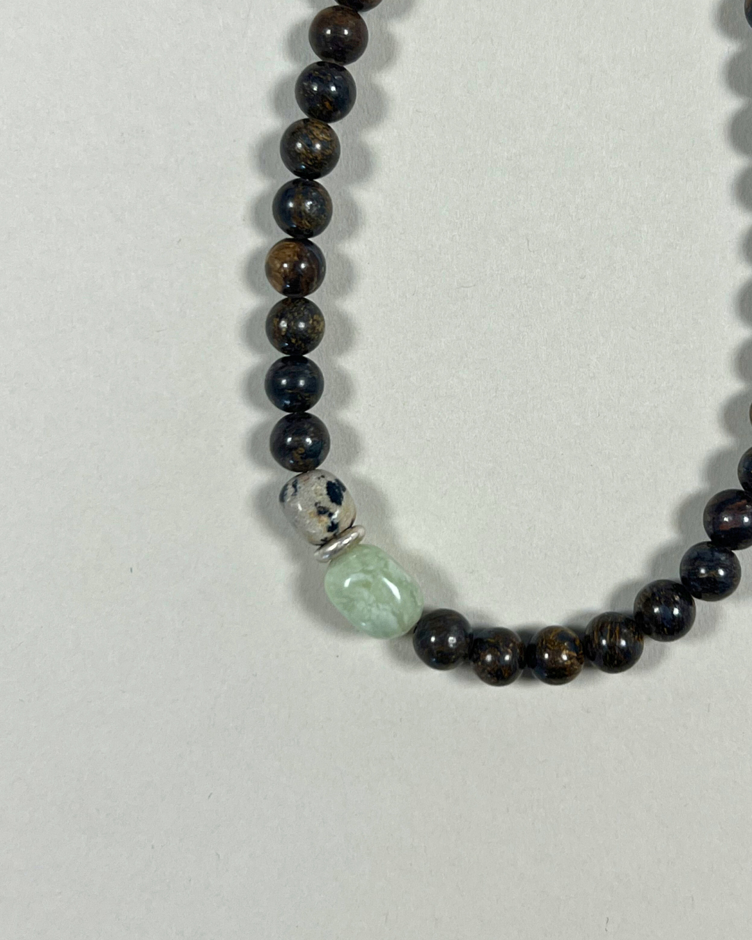 Bronzite is often associated with protection and steady confidence, known for its deep brown tones with subtle flashes of bronze. Bowenite, a variety of serpentine, is linked to calm and considered decision-making. The dalmatian jasper adds a soft, natural contrast with its distinctive speckled pattern, bringing a lighter, grounding element to the piece.