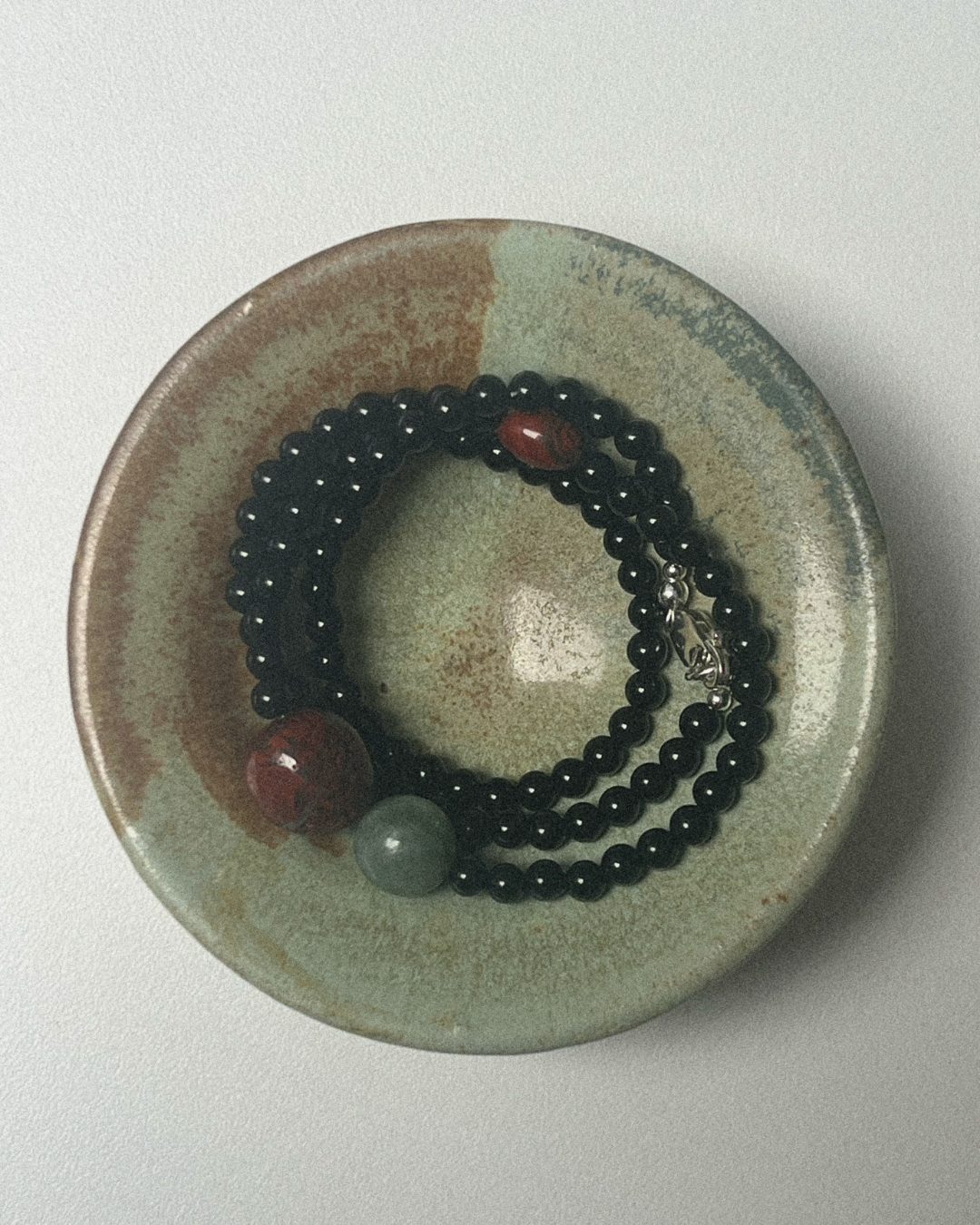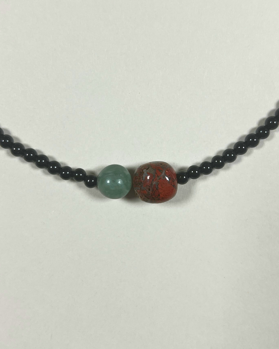 Onyx is associated with strength, focus, and protection, offering grounding and clarity. Bloodstone brings vitality and resilience, jade is linked to harmony and balance, while red jasper adds steadiness and stability. Together, they create a piece that feels strong yet balanced — grounding, protective, and quietly empowering.