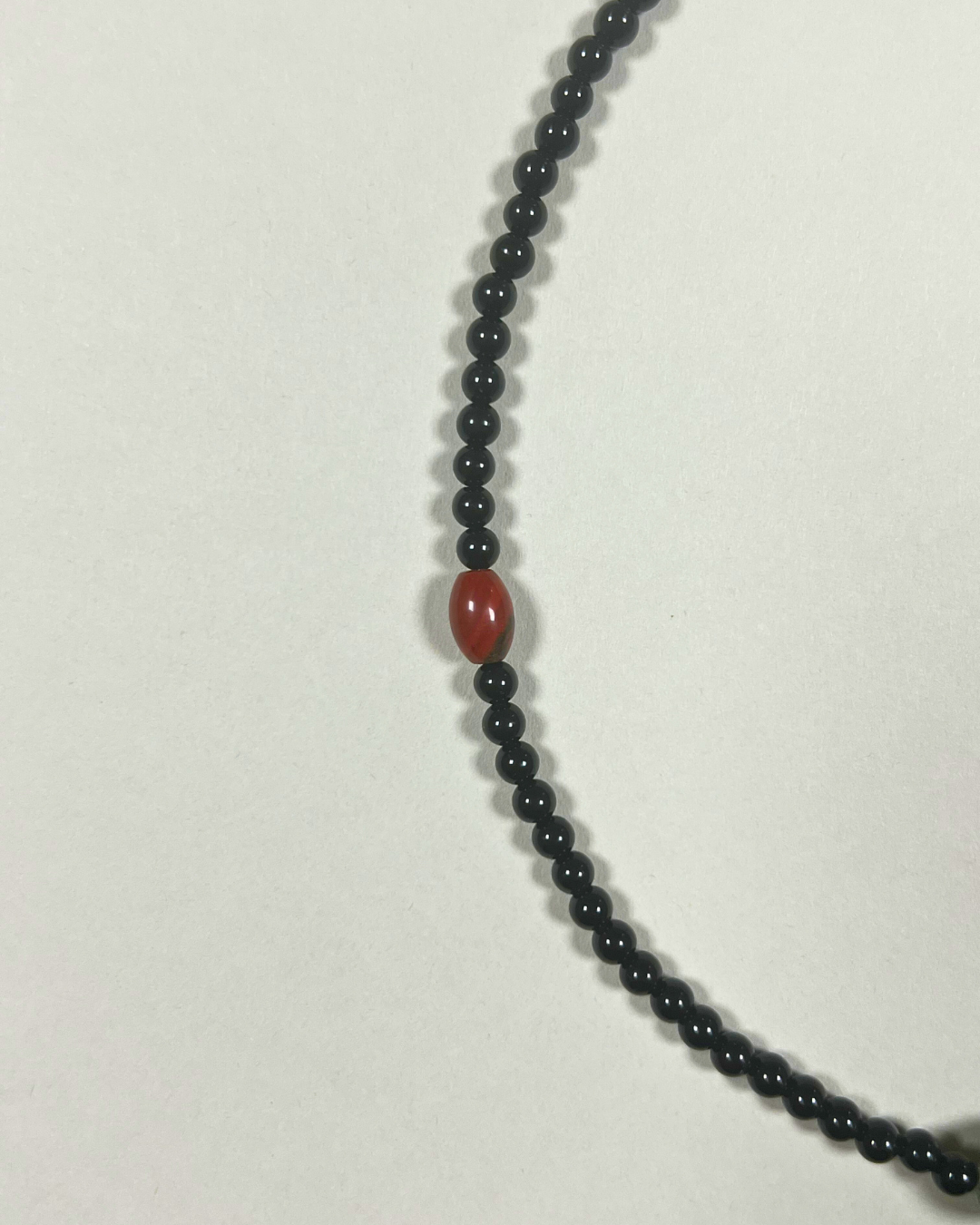 A one-of-a-kind necklace featuring petite onyx beads, hand-strung and finished with sterling silver findings and clasp. Accented with deep red bloodstone, jade, and a red jasper seed-shaped bead, adding colour, depth, and texture to the strand.