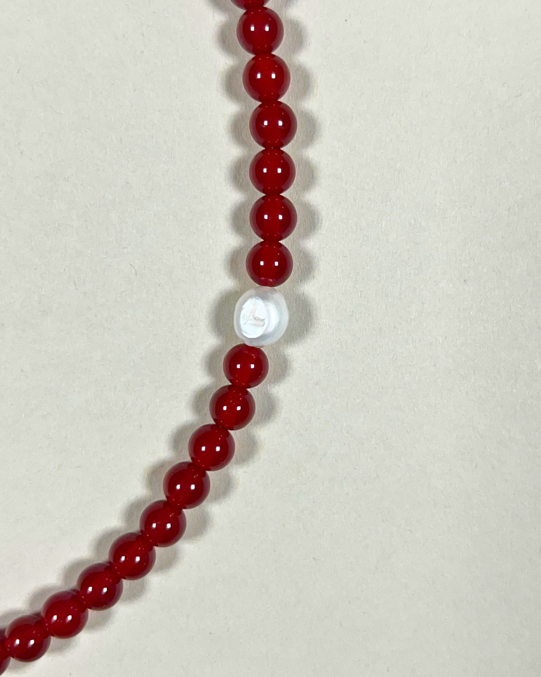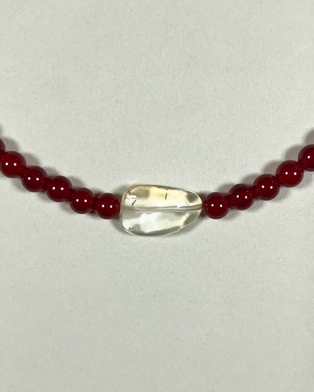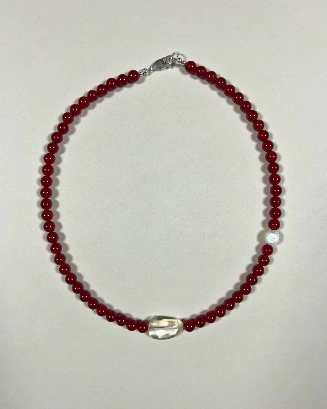 A one-of-a-kind necklace featuring 6mm warm carnelian beads, hand-strung and finished with sterling silver findings and clasp. Accented with citrine and a freshwater pearl, adding light and softness to the vivid warmth of the carnelian.