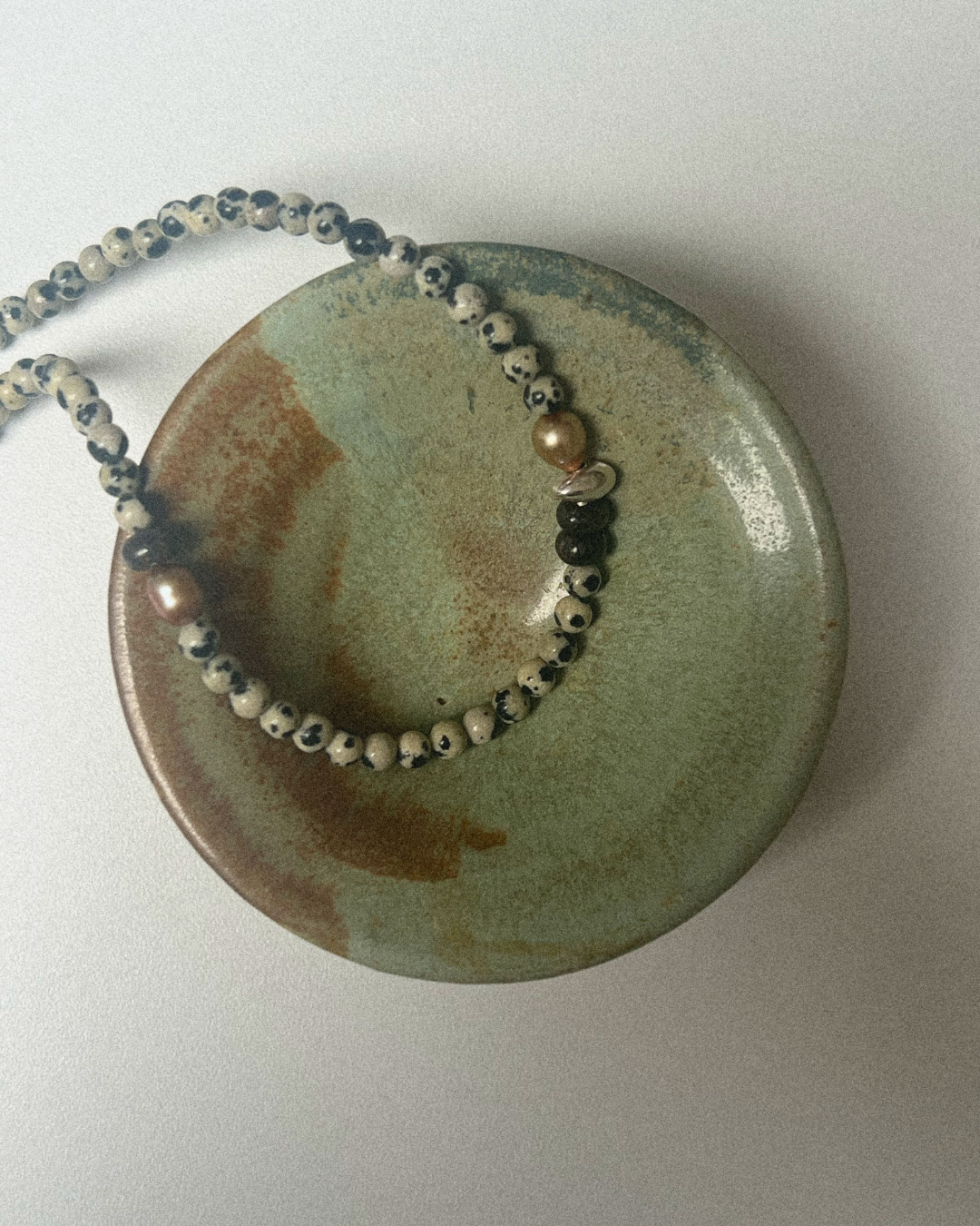 Dalmatian jasper is associated with joy, grounding, and balance, encouraging lightness and presence. Bronzite brings stability and resilience, pearls add softness and reflection, while silver offers balance and subtle brightness. Together, they create a piece that feels steady yet uplifting — grounding, joyful, and quietly radiant.