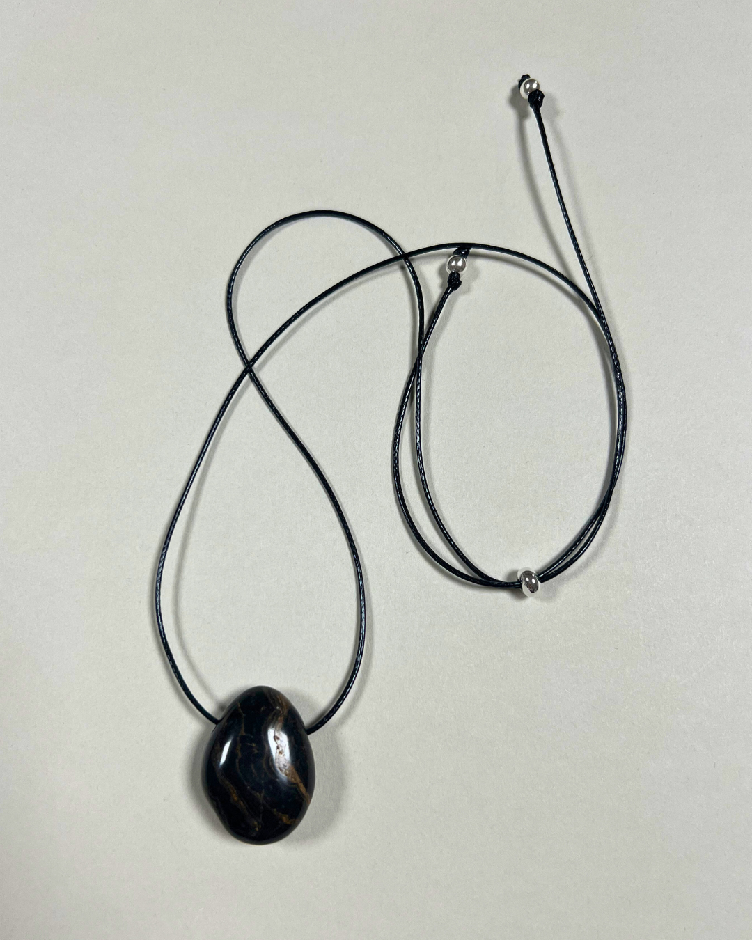 A statement necklace featuring a smooth stromatolite Forma pendant, suspended from a black cord and secured with a sterling silver slider bead and accent beads. Designed for versatility, it can be worn at any length, adjusting effortlessly from long and elegant to a closer fit.