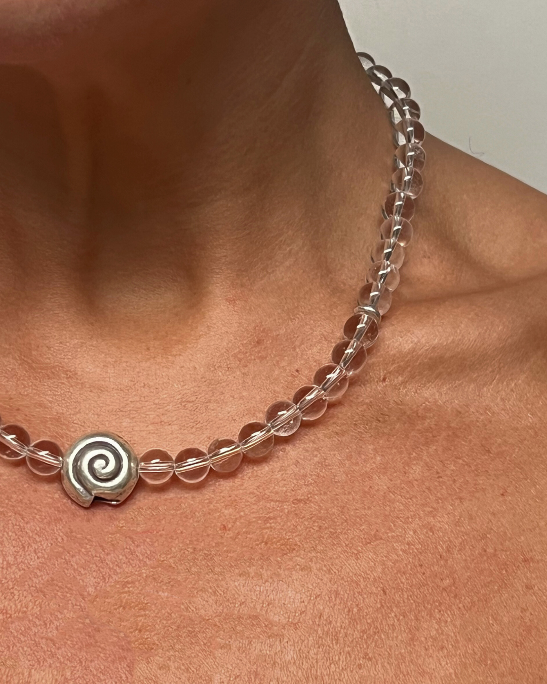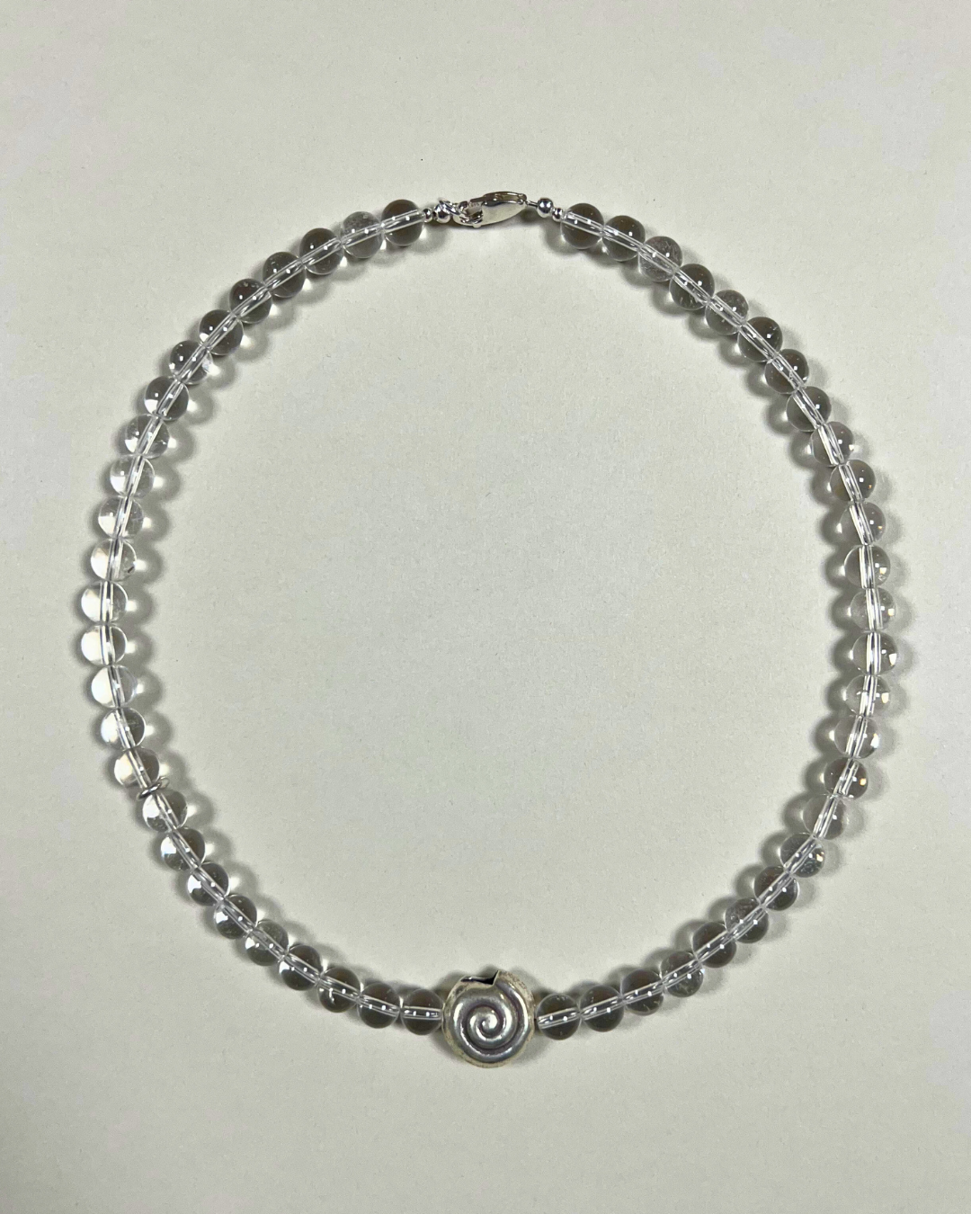 A one-of-a-kind necklace featuring 8mm clear quartz beads, hand-strung and finished with sterling silver findings and clasp. At its centre sits a large fine silver spiral, accented with a silver stud bead - a striking focal point against the luminous clarity of quartz.